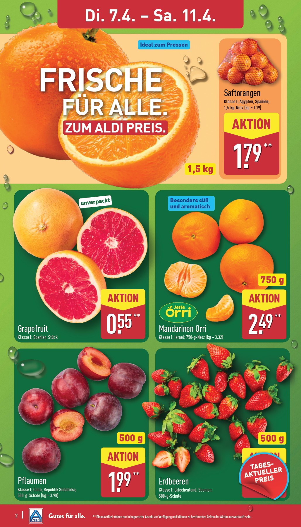Neben den XXL-Packungen überzeugt der Discounter auch mit seiner Frischeabteilung. Die Aldi angebote 07.04. – 11.04. 2026 Werbung bieten eine große Auswahl an Obst und Gemüse zu Aktionspreisen. Besonders hervorzuheben sind die Tafeläpfel aus Deutschland, bei denen Sie 18% sparen und einen 2-kg-Beutel für nur 1,79 Euro bekommen. Auch Saftorangen (1,5 kg für 1,79 Euro) und aromatische Jaffa Orri Mandarinen (750 g für 2,49 Euro) sorgen für eine Extraportion Vitamine. Die Mini-Rispentomaten in der 500-g-Schale für 1,99 Euro runden das frische Angebot ab.