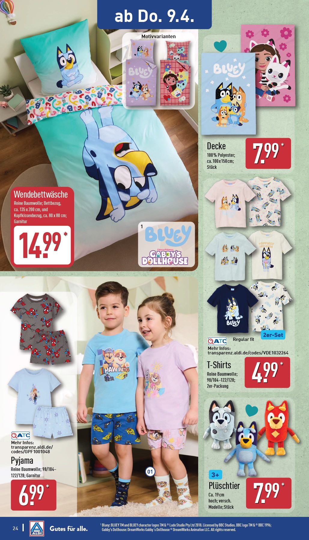 Für die kleinen und großen Fans der beliebten Serie „Bluey“ gibt es ab dem 9. April 2026 tolle Fanartikel. Ein kuscheliges Plüschtier ist für 7,99 Euro erhältlich und die passende Wendebettwäsche für 14,99 Euro. Praktische 2er-Sets T-Shirts für Kinder gibt es ebenfalls für nur 4,99 Euro. Wer sein Zuhause mit frischen Blumen verschönern möchte, findet wunderschöne Gardenline Tulpen für nur 2,49 Euro pro Bund. Entdecken Sie diese und viele weitere wöchentliche Aldi angebote im aktuellen Prospekt.