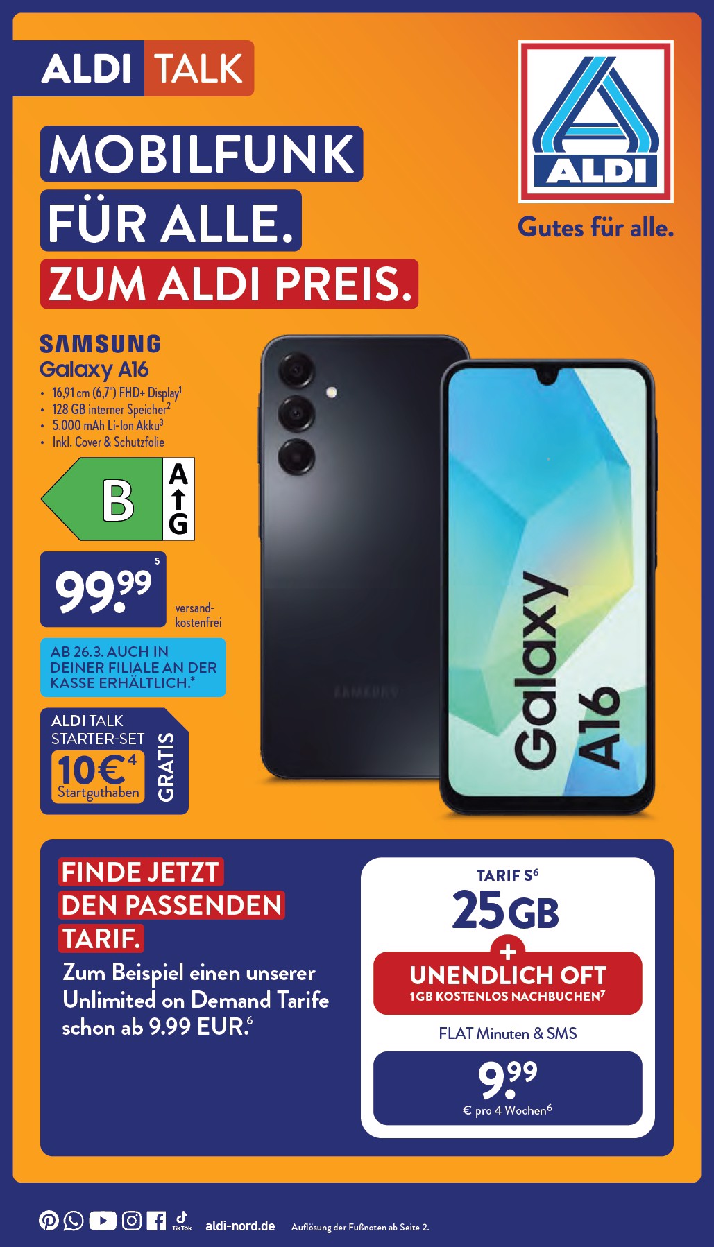Der neue Prospekt von Aldi Talk steht ganz im Zeichen von unschlagbaren Mobilfunk-Deals. Mit einer breiten Palette an Angeboten, die von modernen Smartphones bis hin zu flexiblen Tarifen reichen, findet hier jeder das Passende. Ein besonderes Highlight ist das Aldi angebote Heute 2026 Angebote Angebote zum Blättern, das Samsung Galaxy A16, welches für nur 99,99 € erhältlich ist. Dieses Gerät überzeugt mit einem großen 6,7-Zoll FHD+ Display, 128 GB internem Speicher und einem ausdauernden 5.000 mAh Akku, was es zu einem idealen Begleiter für den Alltag macht.