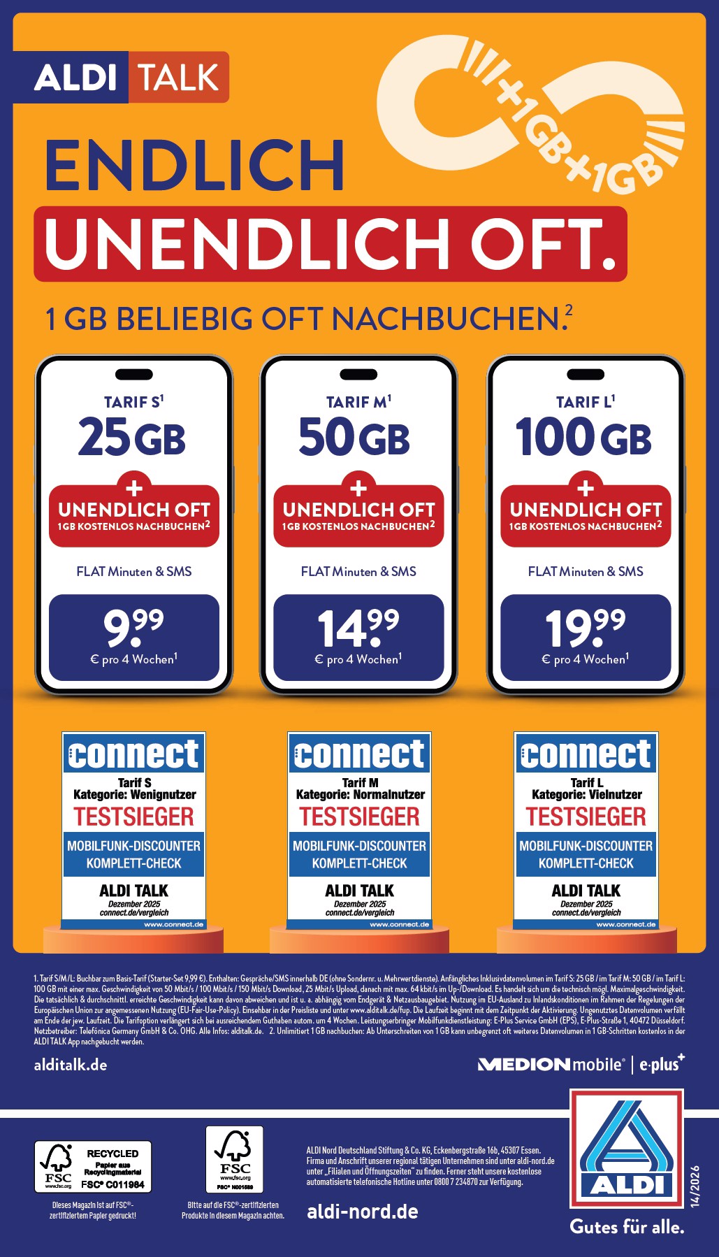 Auch für das Internet zuhause bietet Aldi Talk eine Lösung mit dem stationären 5G Router für 99,99 €. Passende Datentarife wie Home S mit 150 GB für 19,99 € oder Home L mit 300 GB für 29,99 € pro 4 Wochen sorgen für schnelles Internet. Die Tarif-Optionen S, M und L mit 25 GB, 50 GB und 100 GB zeigen die Flexibilität, die Aldi Talk seinen Kunden bietet. Wer immer auf dem Laufenden bleiben möchte, findet alle aktuellen Aldi angebote auf unserer Webseite.