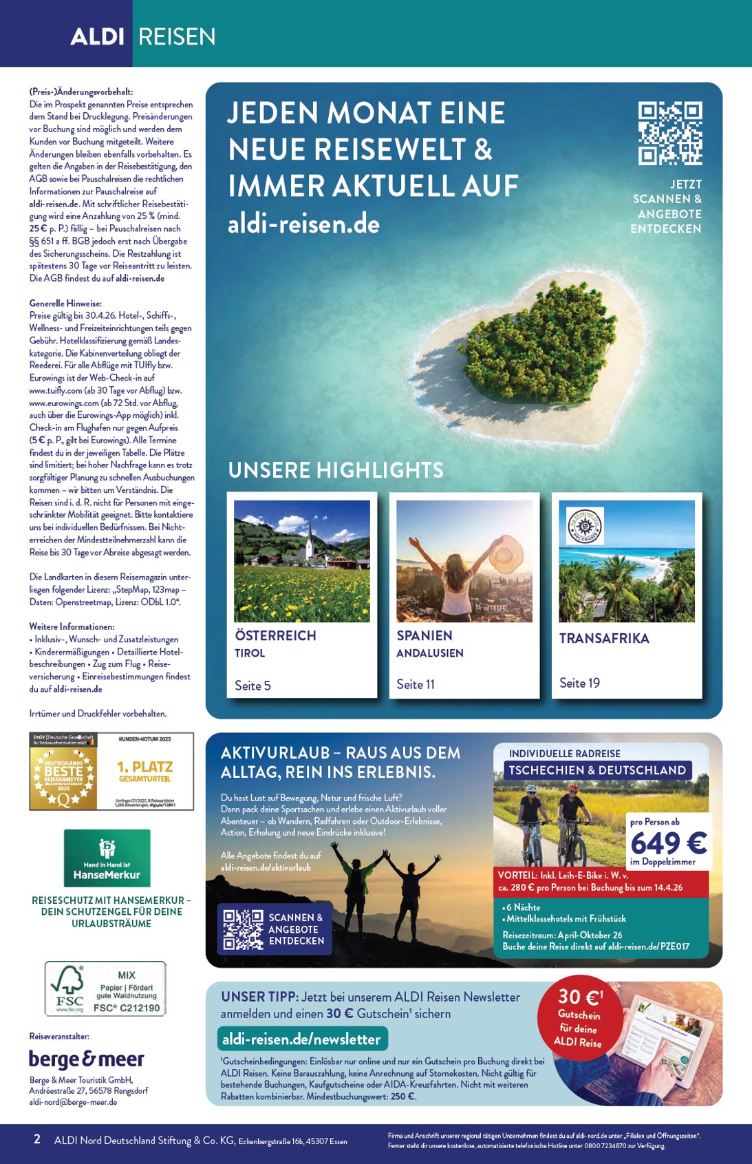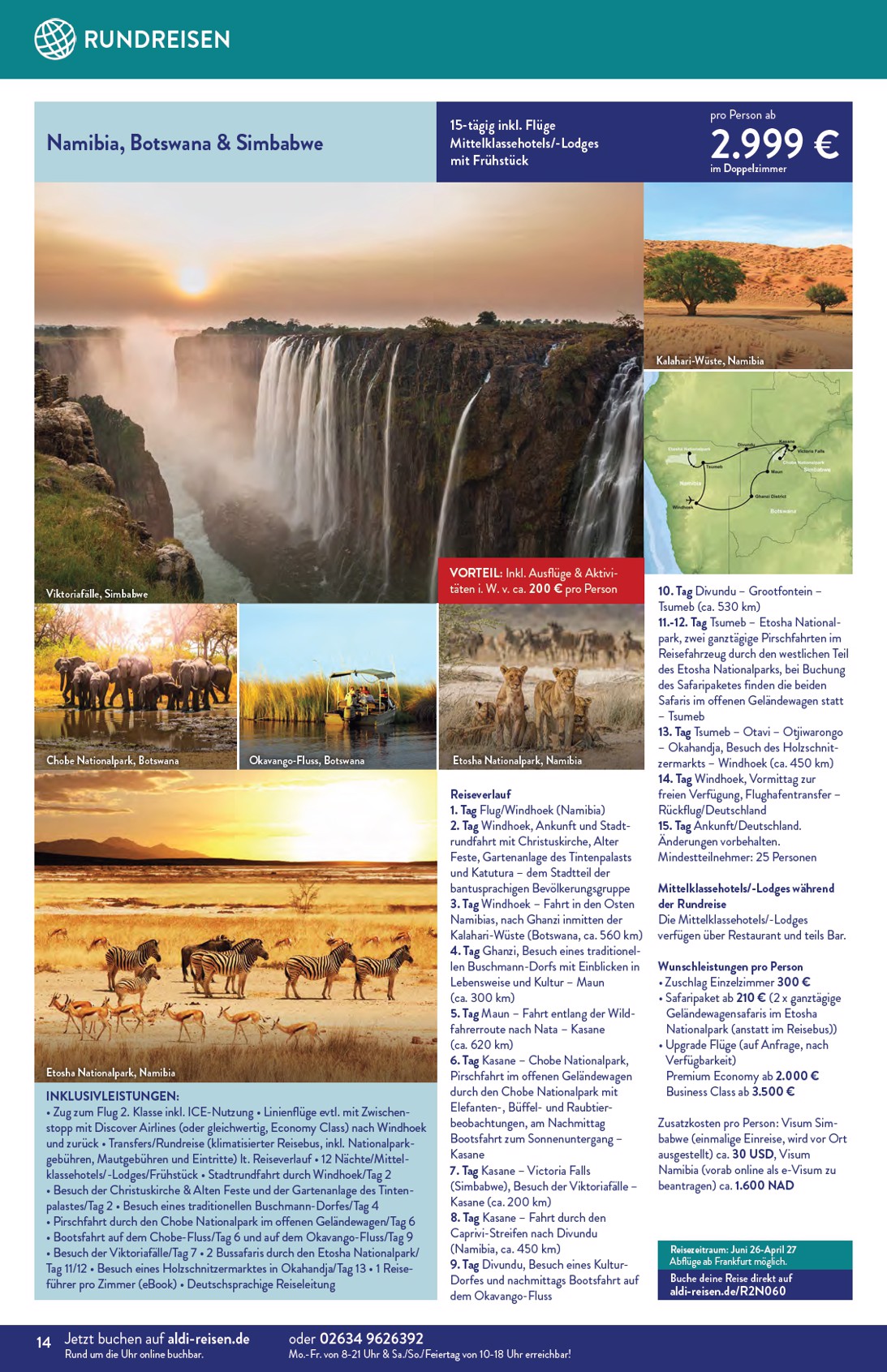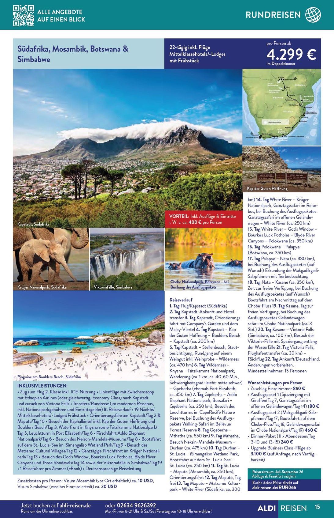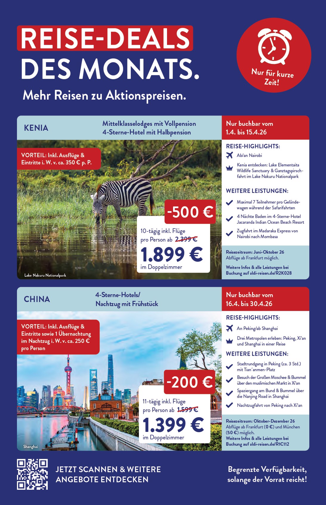Im Inneren des Prospekts warten weitere spektakuläre Angebote auf Abenteuerlustige. Die „Reise-Deals des Monats“ halten, was sie versprechen: Eine 10-tägige Safari in Kenia mit Aufenthalt in Mittelklasselodges und einem 4-Sterne-Hotel ist dank eines Rabatts von 500 € für nur 1.899 € zu haben. Auch Asien-Fans kommen auf ihre Kosten, denn der Aldi Nord Prospekt 01.04.2026 – 30.04.2026 Angebote nächste Woche beinhaltet eine 11-tägige China-Rundreise, die Peking, Xi’an und Shanghai umfasst, für nur 1.399 € statt 1.599 €. Diese Deals sind nur für kurze Zeit buchbar und bieten einzigartige Erlebnisse.
