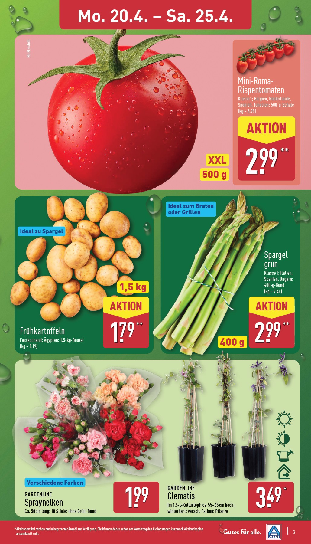Die Frische-Offensive geht weiter mit Tafelbirnen im 600-g-Beutel für 1,79 € und cremigen Avocados für nur 0,99 € pro Stück. Für die warme Küche gibt es 1,5 kg Frühkartoffeln für 1,79 € und 400 g grünen Spargel für 2,99 € – ideal zum Braten oder Grillen. Auch die UP2FASHION Sneaker für nur 12,99 € und die blühenden Gardenline Clematis sind einen Blick wert. Verpassen Sie diese und viele weitere Schnäppchen nicht und entdecken Sie alle Angebote im aktuellen Aldi Nord Prospekt.