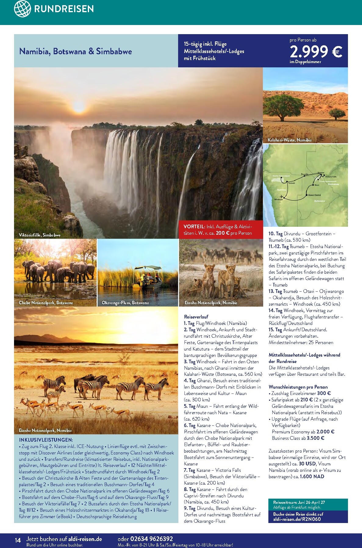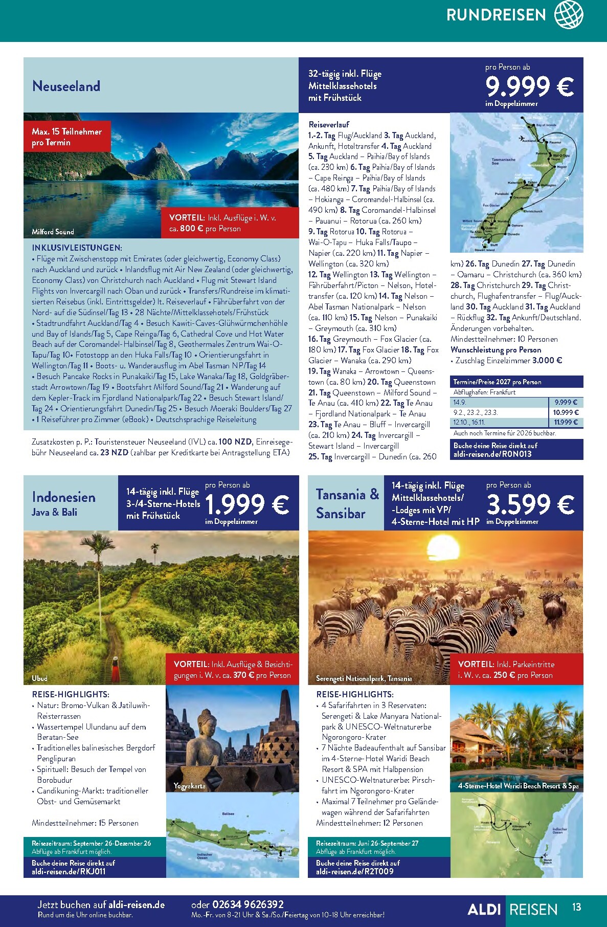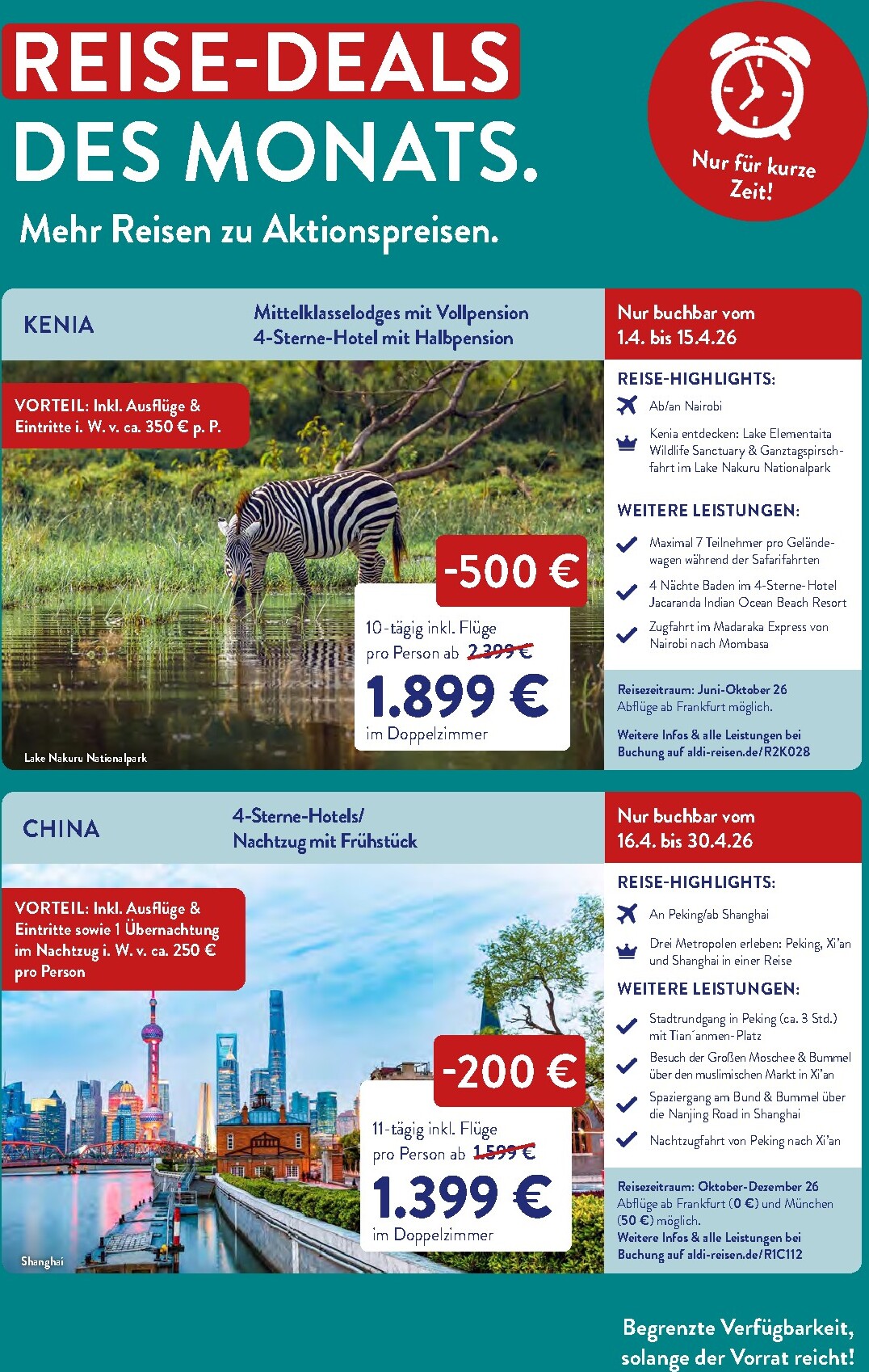 Jeden Monat gibt es besondere „Reise-Deals des Monats“, bei denen Sie kräftig sparen können. Im April sticht besonders das Kenia-Abenteuer hervor, bei dem Sie 500 € pro Person sparen. Für nur 1.899 € statt 2.399 € erleben Sie eine 10-tägige Reise mit Flügen, Wildtier-Safaris und einem Aufenthalt in einem 4-Sterne-Strandresort. Diese Aldi Sud angebote 01.04.2026 – 30.04.2026 zum Blättern Online Online ist ein unschlagbares Angebot für alle, die von der afrikanischen Wildnis träumen. Beachten Sie den begrenzten Buchungszeitraum vom 1.4. bis zum 15.4.26.