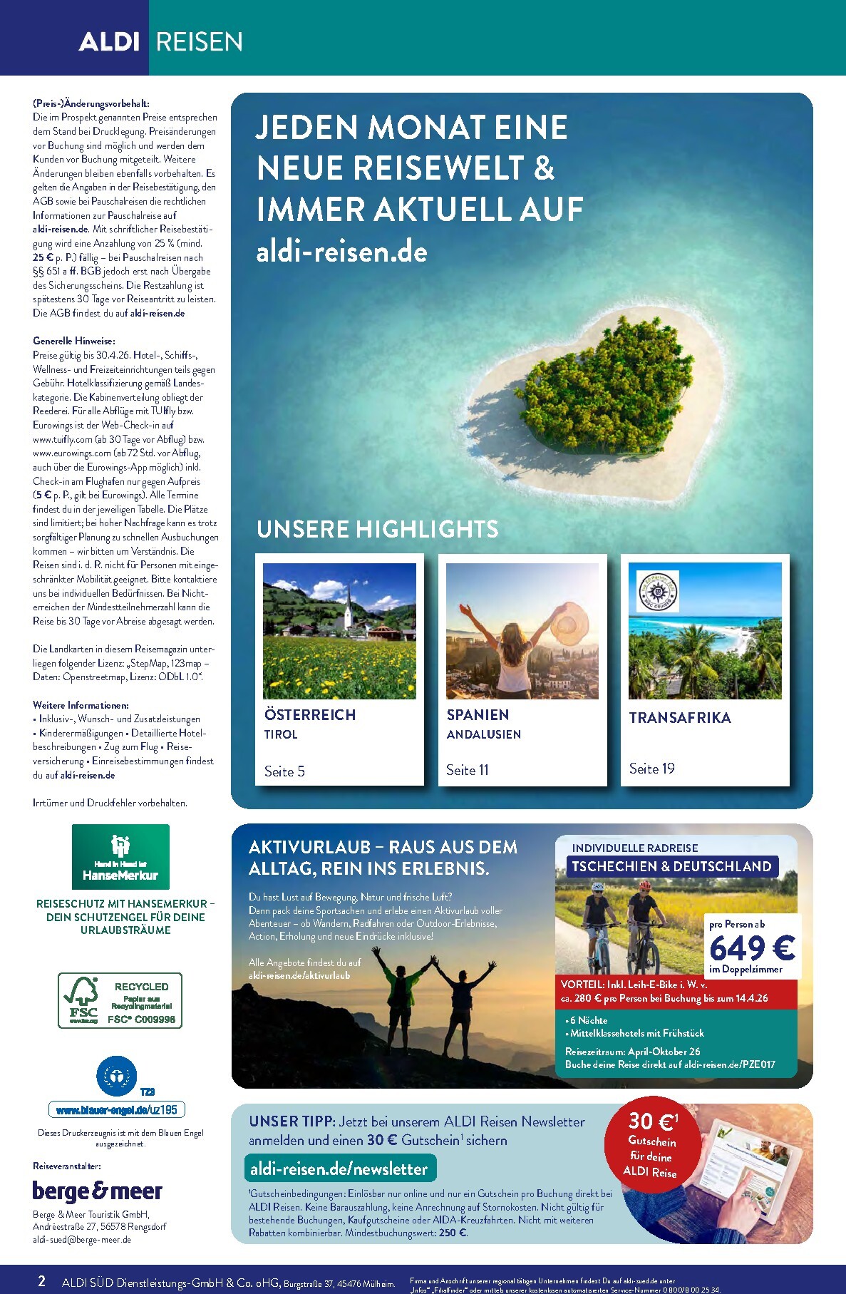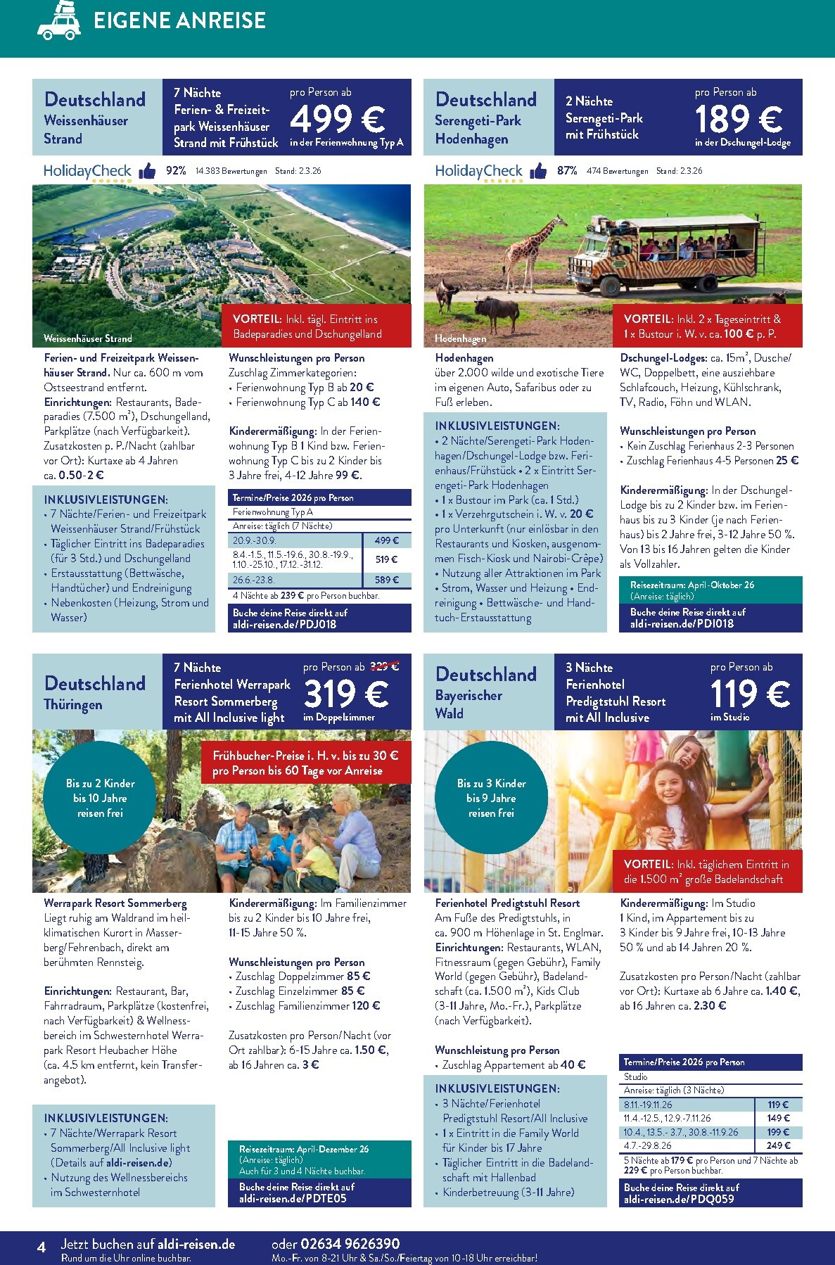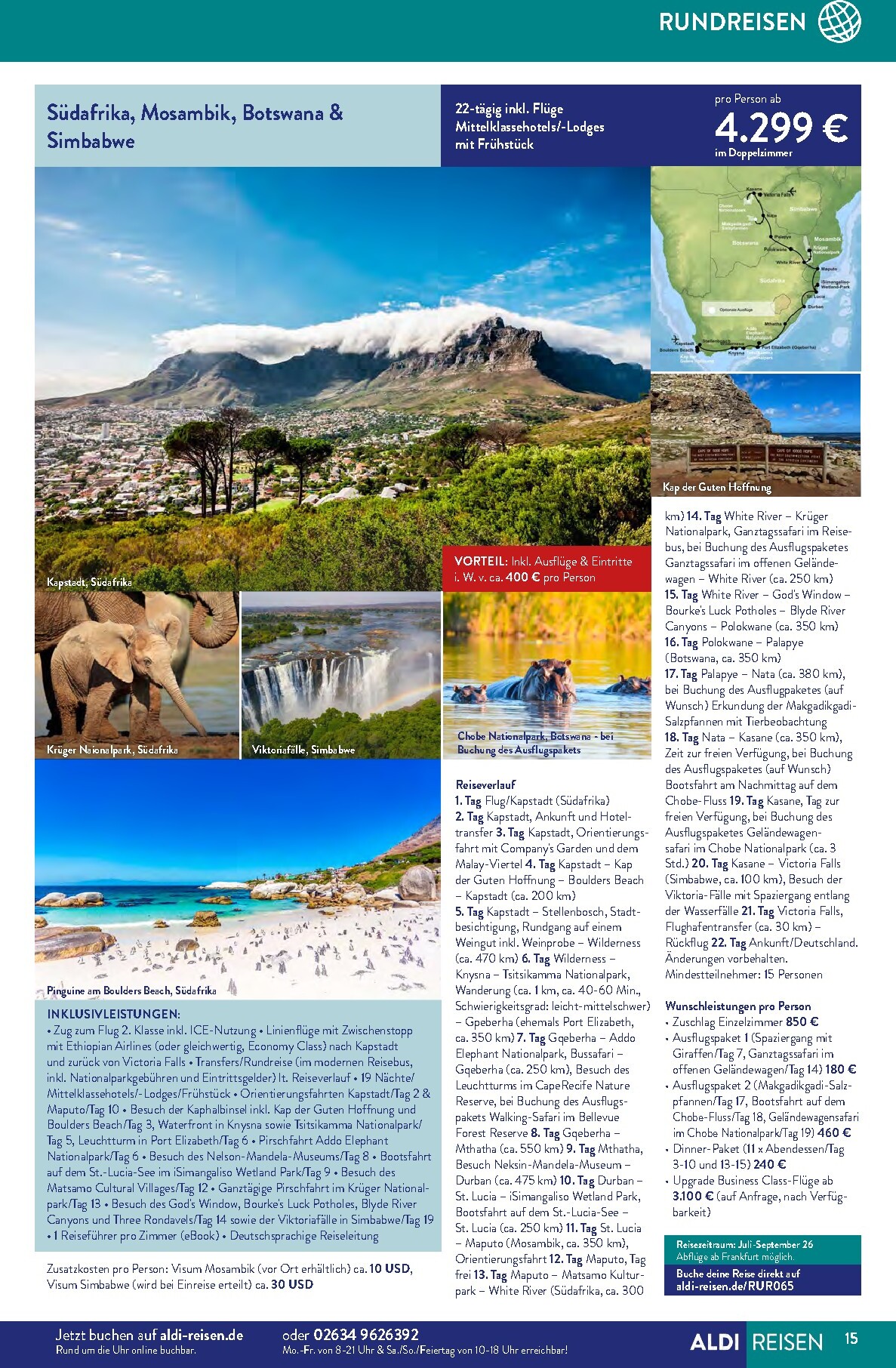 Jeden Monat gibt es besondere „Reise-Deals des Monats“, bei denen Sie kräftig sparen können. Im April sticht besonders das Kenia-Abenteuer hervor, bei dem Sie 500 € pro Person sparen. Für nur 1.899 € statt 2.399 € erleben Sie eine 10-tägige Reise mit Flügen, Wildtier-Safaris und einem Aufenthalt in einem 4-Sterne-Strandresort. Diese Aldi Sud angebote 01.04.2026 – 30.04.2026 zum Blättern Online Online ist ein unschlagbares Angebot für alle, die von der afrikanischen Wildnis träumen. Beachten Sie den begrenzten Buchungszeitraum vom 1.4. bis zum 15.4.26.