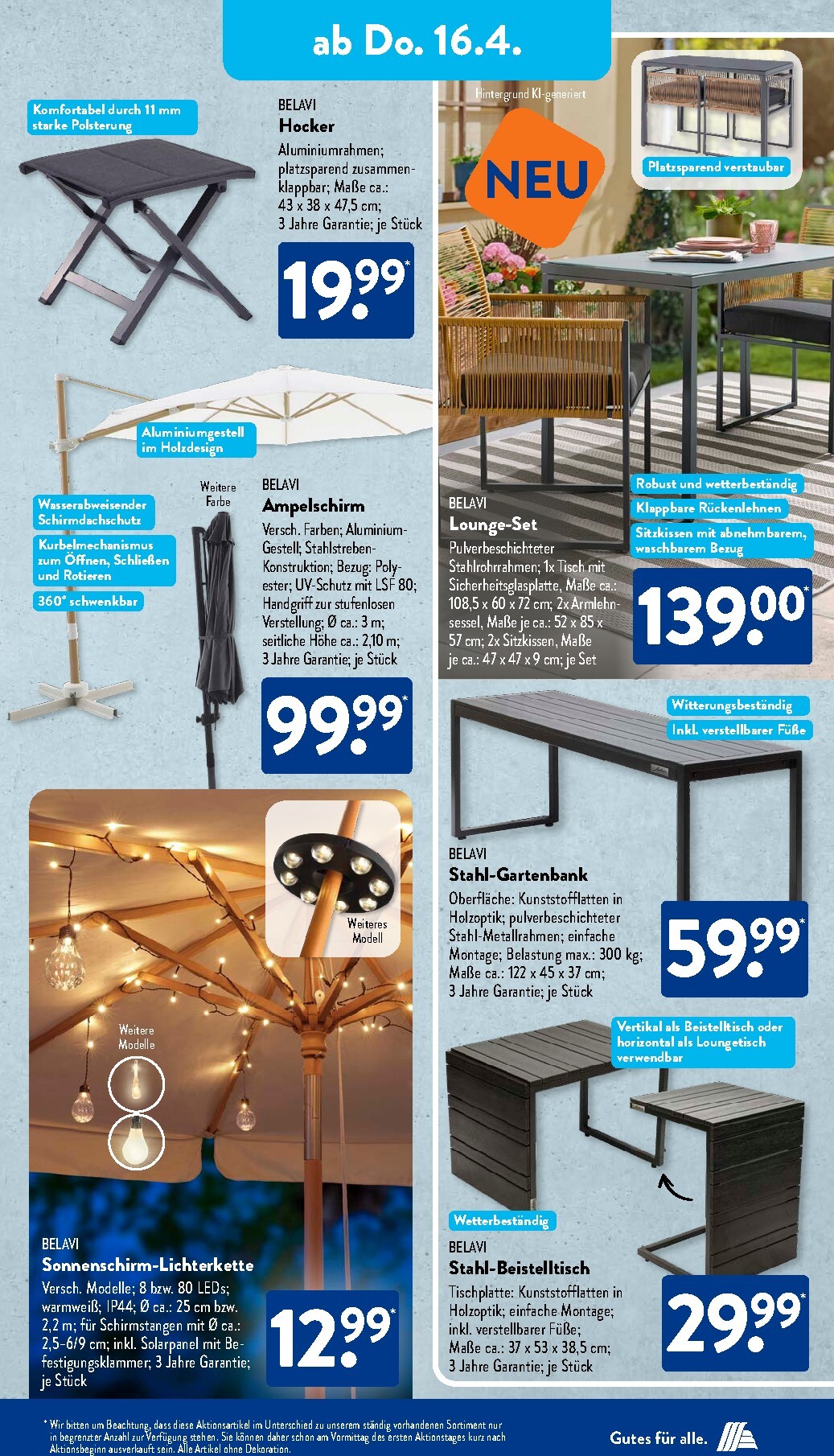 Die Spar-Aktionen gehen im Laufe der Woche weiter. Ab Donnerstag, dem 16. April, wartet ein besonderes Tiefpreis-Highlight auf alle Garten- und Balkonfreunde: Die bequeme BELAVI Niedriglehner-Auflage für nur 5,99 € macht Ihre Gartenstühle zur perfekten Wohlfühloase. Planen Sie schon Ihren Wochenendeinkauf? Dann sollten Sie die XXL-Angebote ab Freitag, dem 17. April 2026, nicht verpassen. Sichern Sie sich zum Beispiel den herzhaften Schwarzwälder Schinken in der XXL-Packung für nur 2,49 €. Der Aldi Süd Prospekt 13.04.2026 – 18.04.2026 digitaler Prospekt hilft Ihnen dabei, alle Top-Deals der Woche im Blick zu behalten und gezielt einzukaufen.
