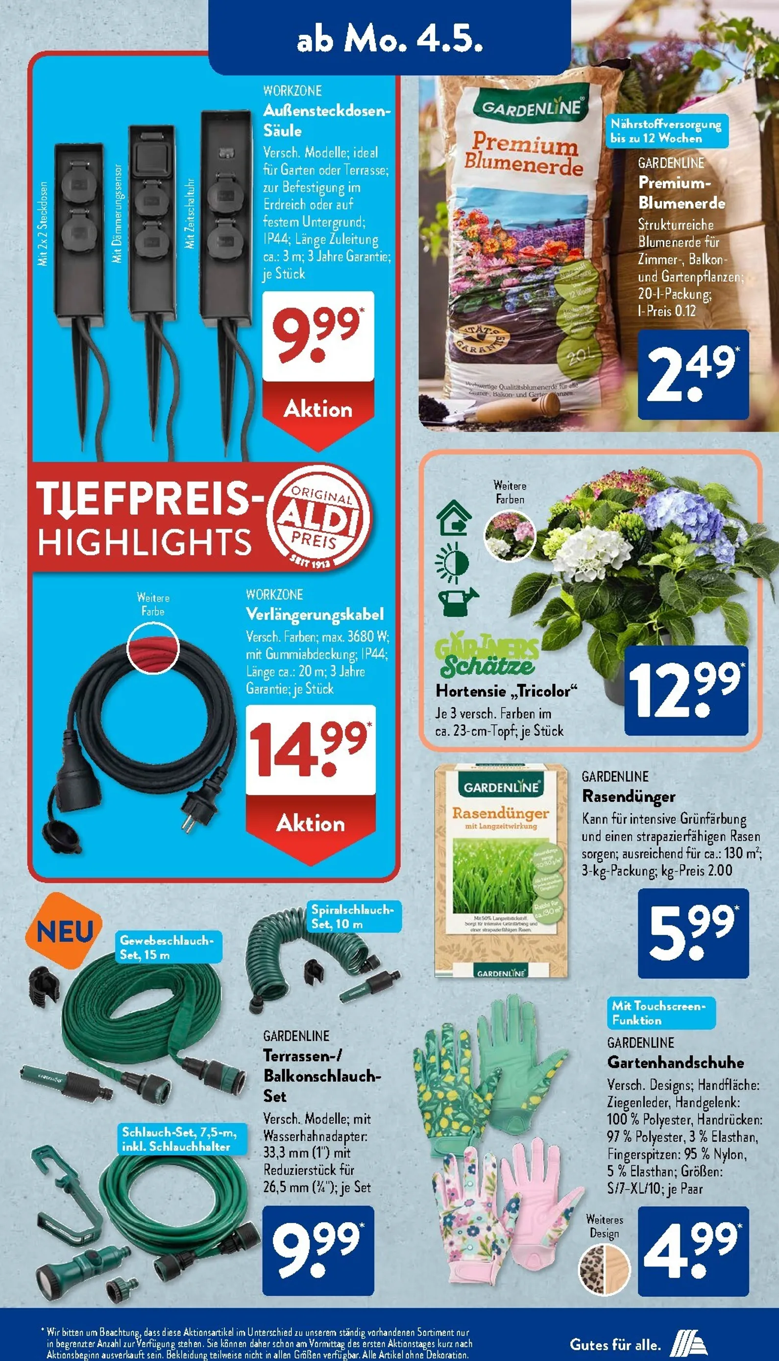 Gartenliebhaber kommen ebenfalls auf ihre Kosten. Die farbenprächtige Hortensie „Tricolor“ für 12,99 Euro wird zum Blickfang in jedem Beet. Passend dazu gibt es Premium Blumenerde und Rasendünger für einen gepflegten Rasen. Nützliche Helfer wie die Außensteckdosen-Säule für 9,99 Euro oder verschiedene Gartenschlauch-Sets erleichtern die Arbeit im Freien erheblich und sind Teil der aktuellen Deals.