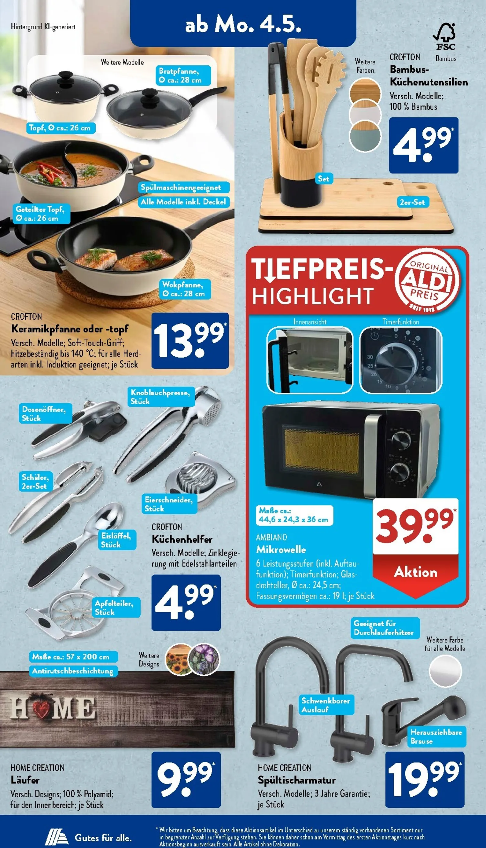 In der Küche warten ebenfalls unschlagbare Angebote. Die AMBIANO Mikrowelle für nur 39,99 Euro ist ein echtes Tiefpreis-Highlight mit praktischer Timerfunktion. Ergänzt wird das Sortiment durch CROFTON Keramikpfannen und schicke Bambus-Küchenutensilien. Werfen Sie einen Blick in den aktuellen Aldi Süd Prospekt, um keines dieser Schnäppchen zu verpassen. Bei dieser Auswahl ist sicher für jeden das richtige Aldi Süd Prospekt ab 04.05.2026 dabei.