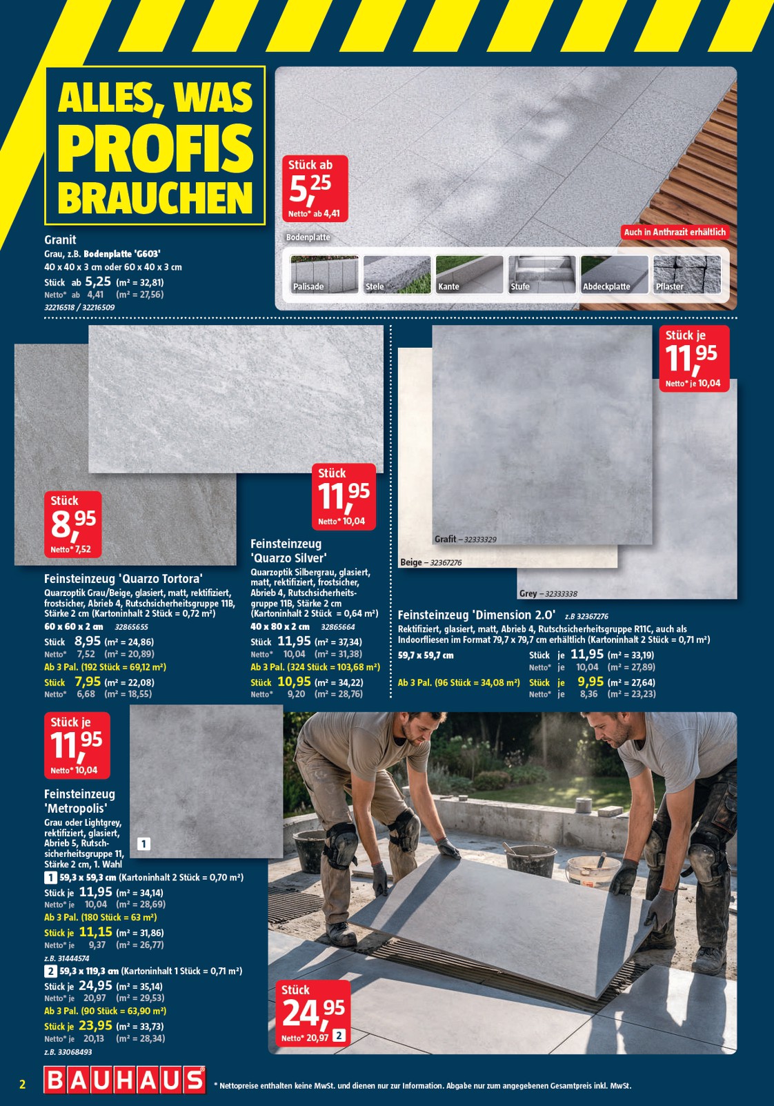 Auch für den Außenbereich hält der Prospekt zahlreiche Highlights bereit. Wer seine Terrasse oder Wege neu gestalten möchte, findet eine breite Palette an Bodenplatten und Feinsteinzeug. Der Bauhaus Prospekt 11.04.2026 – 25.04.2026 Angebote Angebote zum Blättern präsentiert hier unter anderem die elegante Feinsteinzeugfliese ‚Quarzo Tortora‘ für nur 8,95 € netto pro Stück oder die robuste Granit-Bodenplatte ‚G603‘ ab 5,25 € netto pro Stück. Diese Produkte überzeugen nicht nur durch ihre Optik, sondern auch durch ihre Witterungsbeständigkeit und Langlebigkeit.