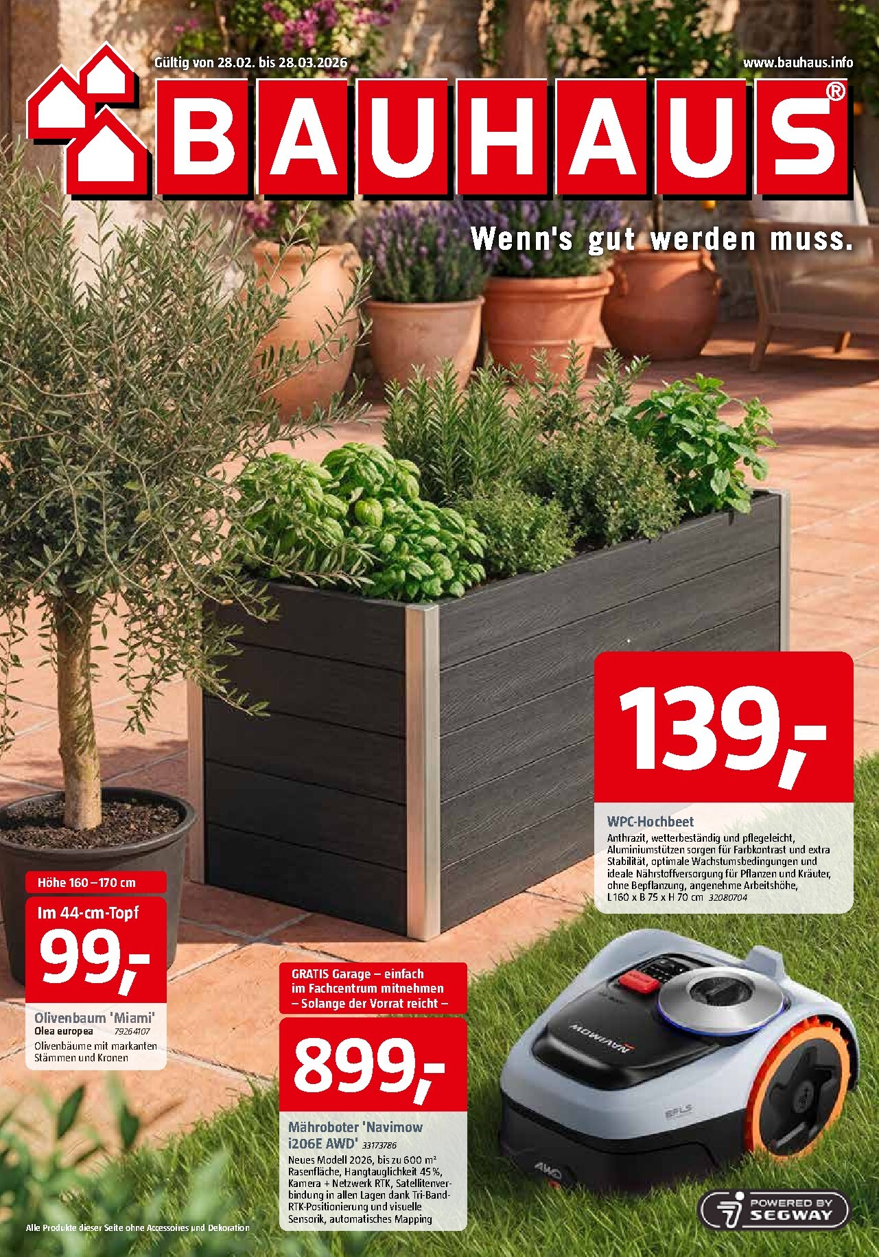 Für einen perfekt gepflegten Rasen ohne Mühe sorgt der Mähroboter ‚Navimow i206E AWD‘ zum Preis von 899,- €. Dieses hochmoderne Gerät ist ein wahrer Segen für Gartenbesitzer, denn die Bauhaus Prospekt 28.02.2026 – 28.03.2026 digitaler Prospekt machen die Rasenpflege so einfach wie nie. Geeignet für Flächen bis zu 600 m² und mit einer beeindruckenden Hangtauglichkeit von 45 %, meistert er dank Satellitenverbindung und visueller Sensorik auch komplexe Gärten. Das automatische Mapping und die präzise RTK-Positionierung garantieren ein makelloses Ergebnis. Als Bonus gibt es eine passende Garage gratis dazu, solange der Vorrat reicht.