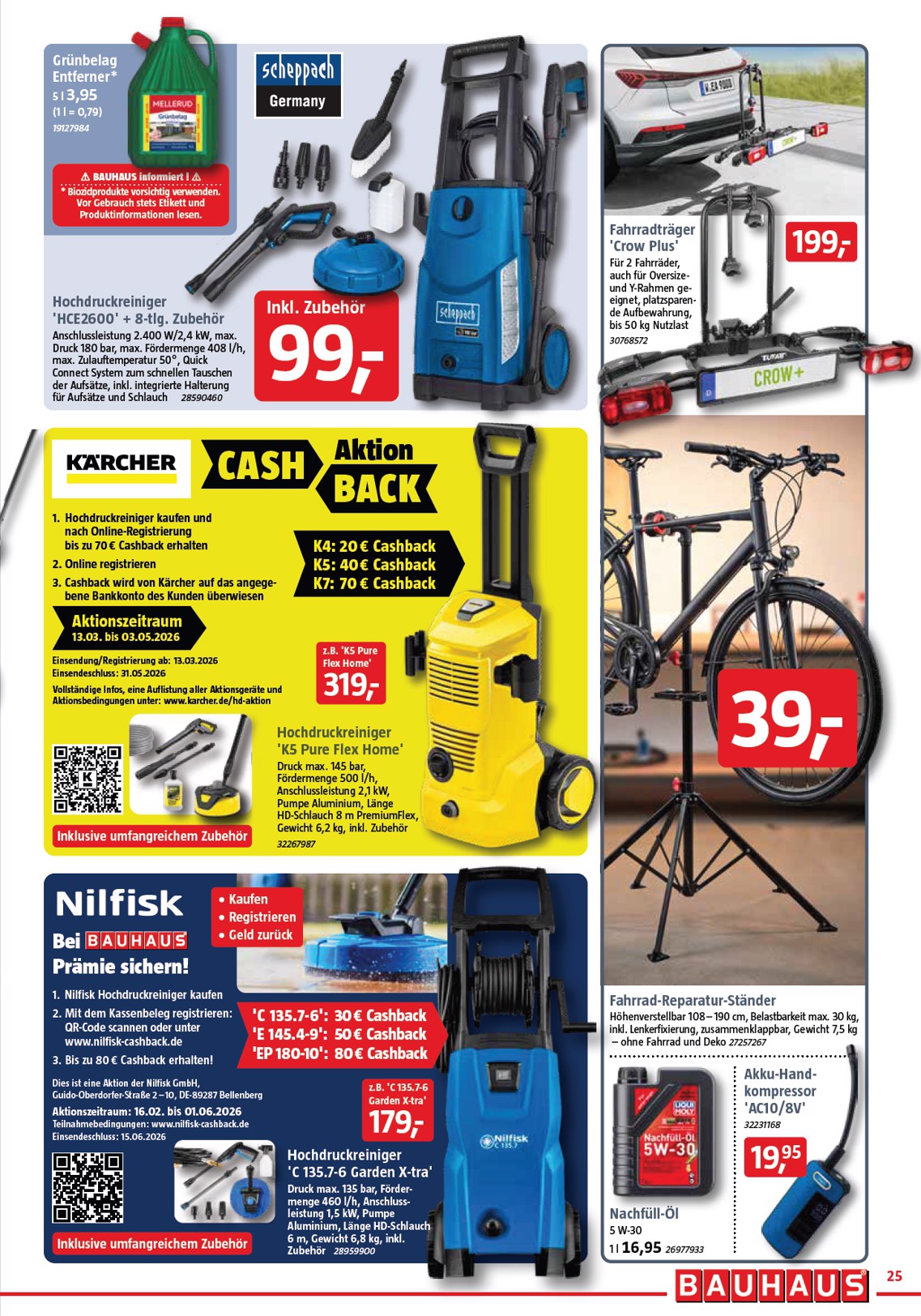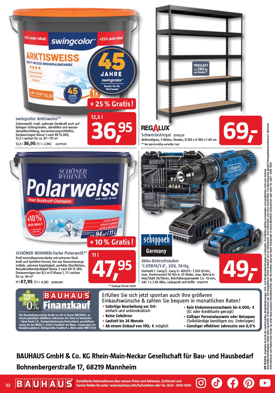 Auch für Heimwerker hält der aktuelle Bauhaus Prospekt 28.03.2026 – 11.04.2026 zum Blättern Online Online attraktive Deals bereit. Verleihen Sie Ihren Wänden einen neuen Anstrich mit der ‚Arktisweiss‘ Wandfarbe von swingcolor für 36,95 Euro oder der ‚Polarweiss‘ von Schöner Wohnen für 47,95 Euro. Für Ordnung in Keller oder Garage sorgt das Schwerlastregal von Regalux, das bis zu 265 kg pro Boden trägt und nur 69,- Euro kostet. Ein weiteres Highlight ist der leistungsstarke Akkuschrauber von scheppach für nur 49,- Euro, perfekt für jedes Projekt.