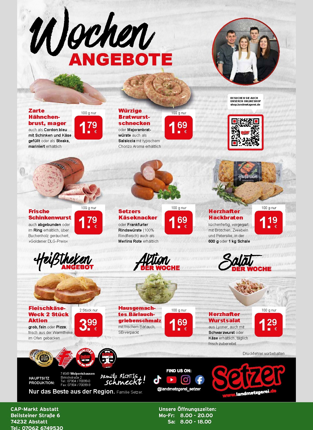 Neben den frischen Milchprodukten und Snacks bietet der Cap Markt in Abstatt auch eine hervorragende Auswahl an Fleisch- und Wurstwaren von der Landmetzgerei Setzer. Freuen Sie sich auf zarte Hähnchenbrust für 1,79 Euro pro 100g oder den herzhaften Hackbraten für nur 1,19 Euro pro 100g. Wenn Sie die Cap Markt angebote 07.04.2026 – 11.04.2026 zum Blättern Online Online durchstöbern, finden Sie auch unwiderstehliche Angebote für den schnellen Hunger, wie den Fleischkäse-Weck im Doppelpack für 3,99 Euro.