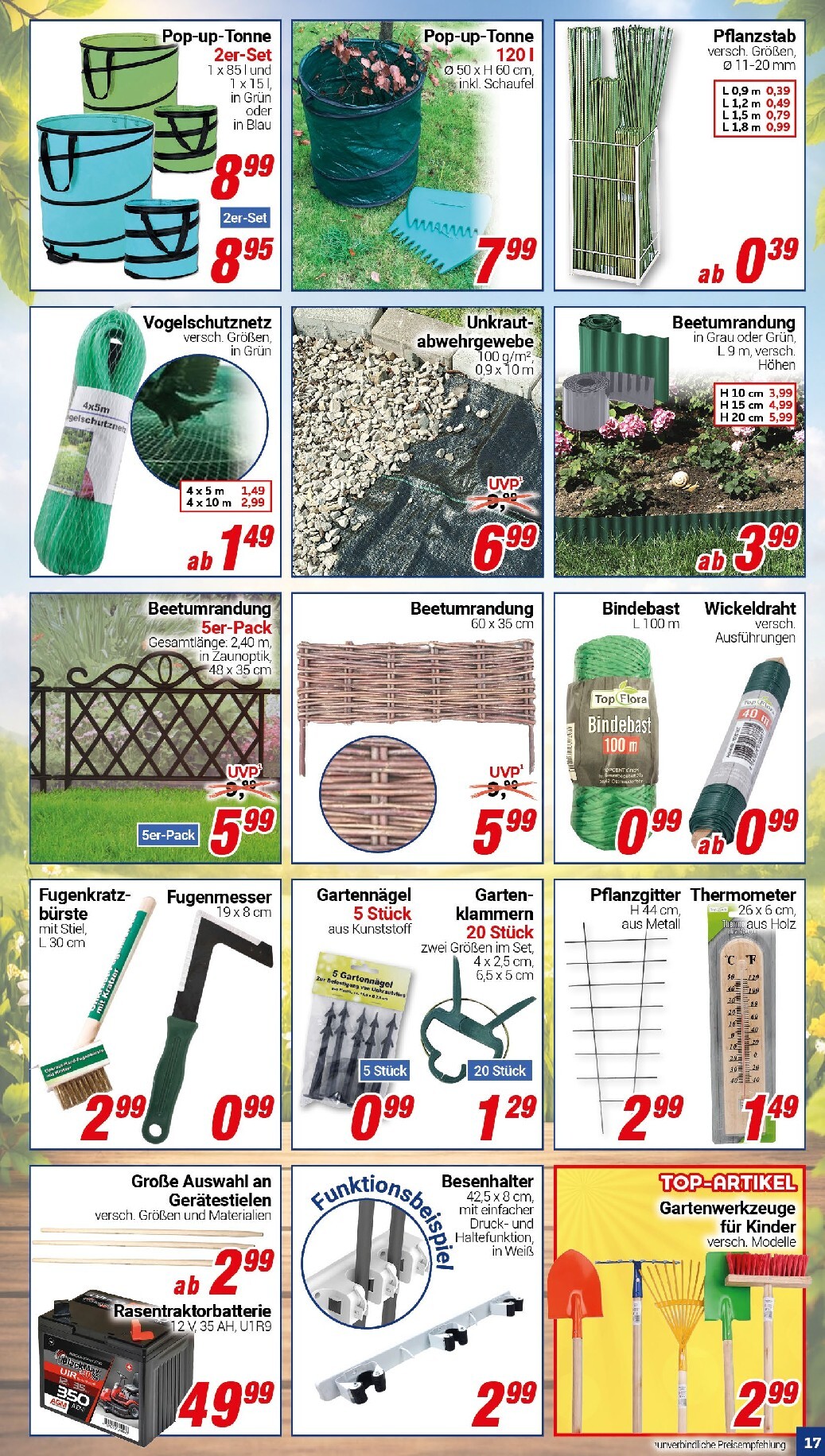 Darüber hinaus umfasst das Sortiment auch alles für größere Projekte, von Rasendünger und Hornspänen bis hin zu Brennstoffen wie Kaminholz und Briketts. Praktische Artikel wie Gießkannen, eine Profi-Schubkarre für 39,99 € oder verschiedene Zäune runden das Angebot ab und machen Centershop zur ersten Anlaufstelle für Haus, Garten und Freizeit. Entdecken Sie alle Details und viele weitere Schnäppchen im aktuellen Centershop Prospekt.