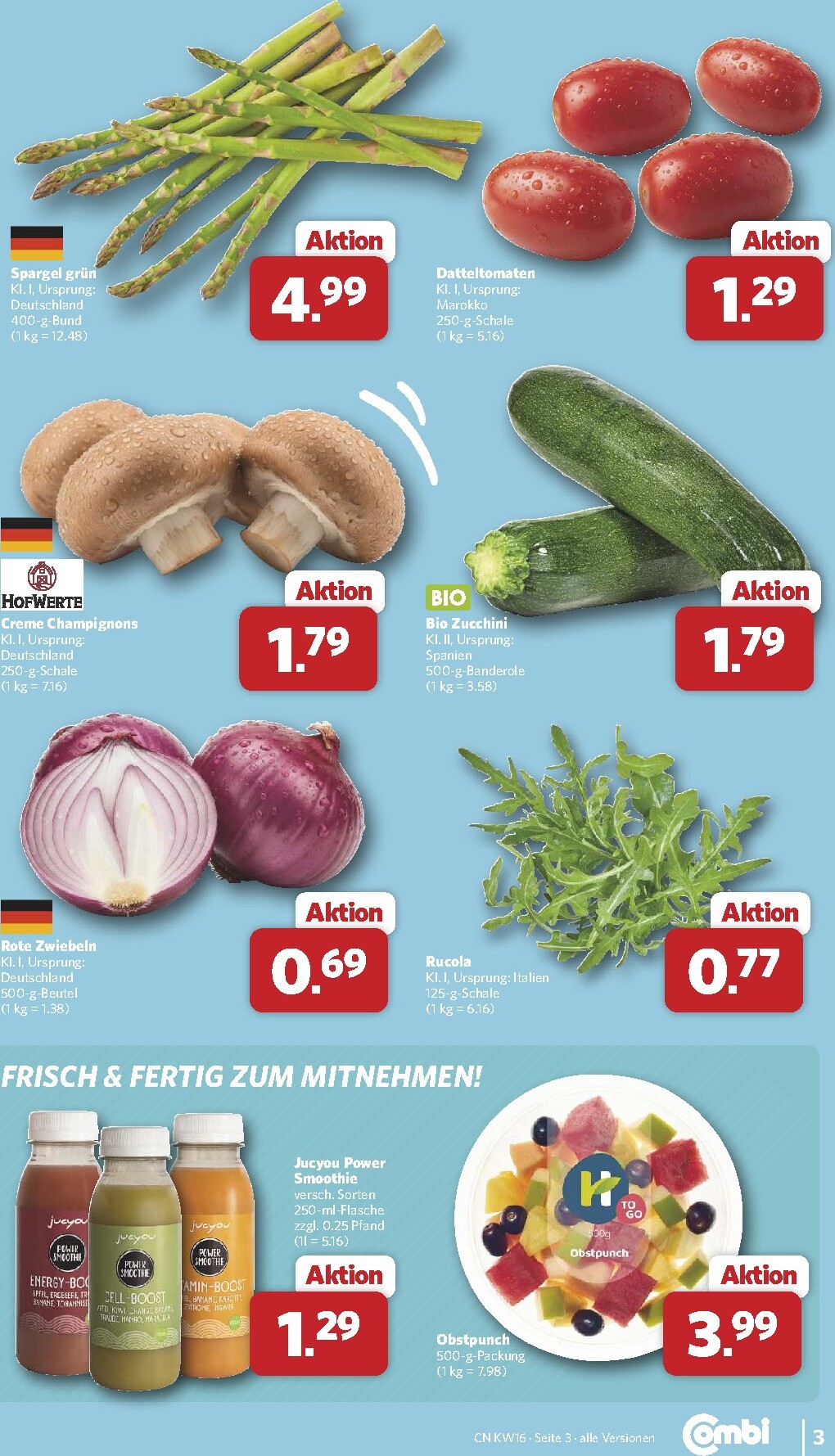 Ergänzen Sie Ihren Einkauf mit weiteren frischen Produkten wie knackigen Datteltomaten für 1,29 Euro oder Bio Zucchini für nur 1,79 Euro. Auch deutsche rote Zwiebeln sind für günstige 0,69 Euro pro Kilo zu haben. Für den schnellen Vitaminkick zwischendurch gibt es die Jutcyou Power Shots für 1,29 Euro oder einen fertigen Obstpunch für 3,99 Euro. Stöbern Sie durch den gesamten Combi Prospekt, um alle Angebote zu entdecken und Ihre Einkaufsliste zu planen.