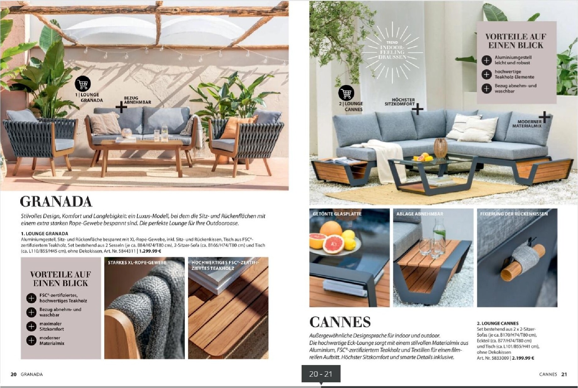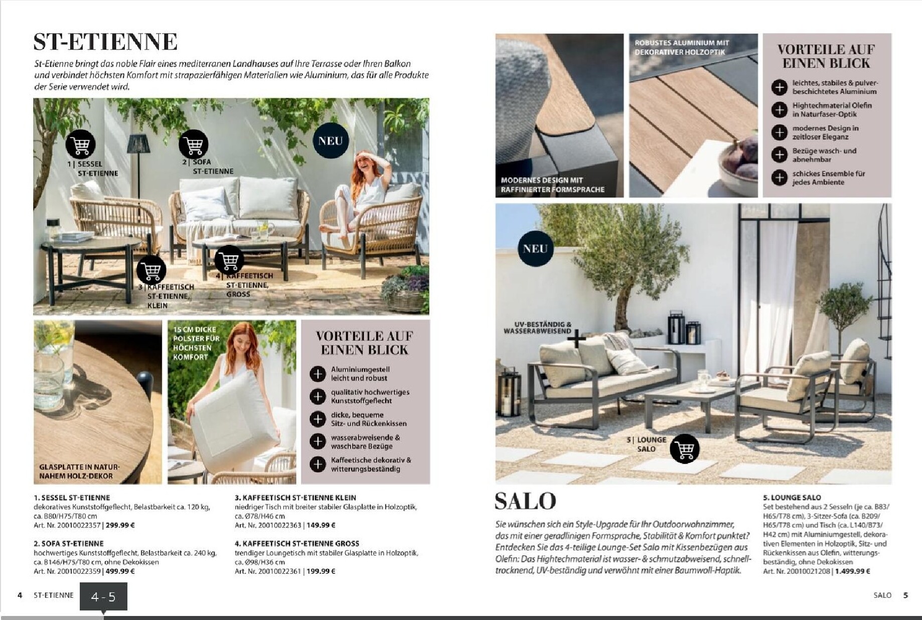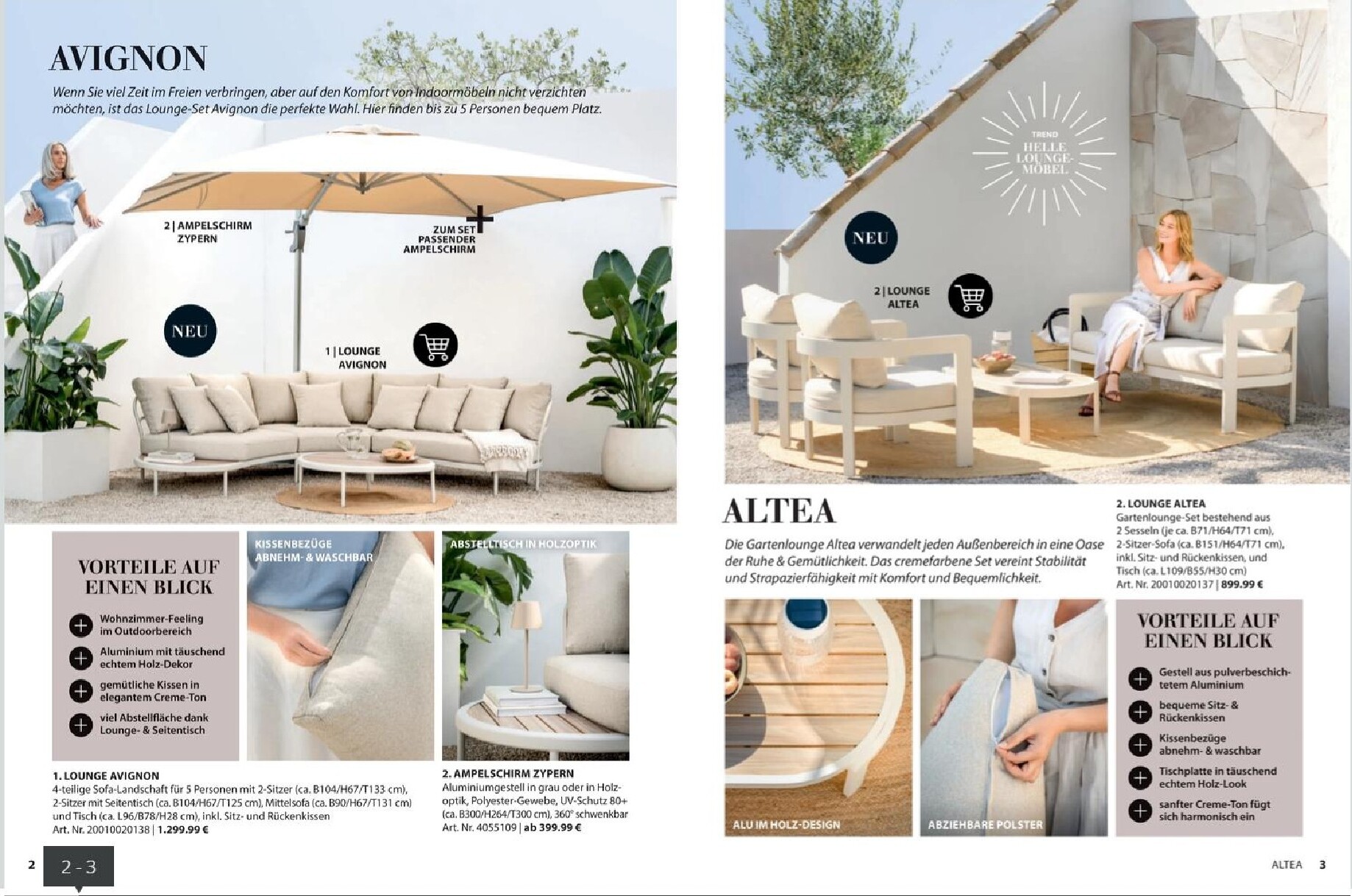 Besonders hervorzuheben ist die elegante Lounge ‚Avignon‘, eine vierteilige Sofa-Landschaft für bis zu fünf Personen, die mit ihrem zeitlosen Design und den bequemen, cremefarbenen Polstern überzeugt. Für 1.299,99 € erhalten Sie ein komplettes Set, das zum Verweilen einlädt. Ebenfalls neu ist die Gartengarnitur ‚Altea‘ für 899,99 €, die mit pulverbeschichtetem Aluminium und abnehmbaren, waschbaren Polstern punktet. Sie schafft eine gemütliche Atmosphäre für kleinere Runden und fügt sich harmonisch in jede Umgebung ein.