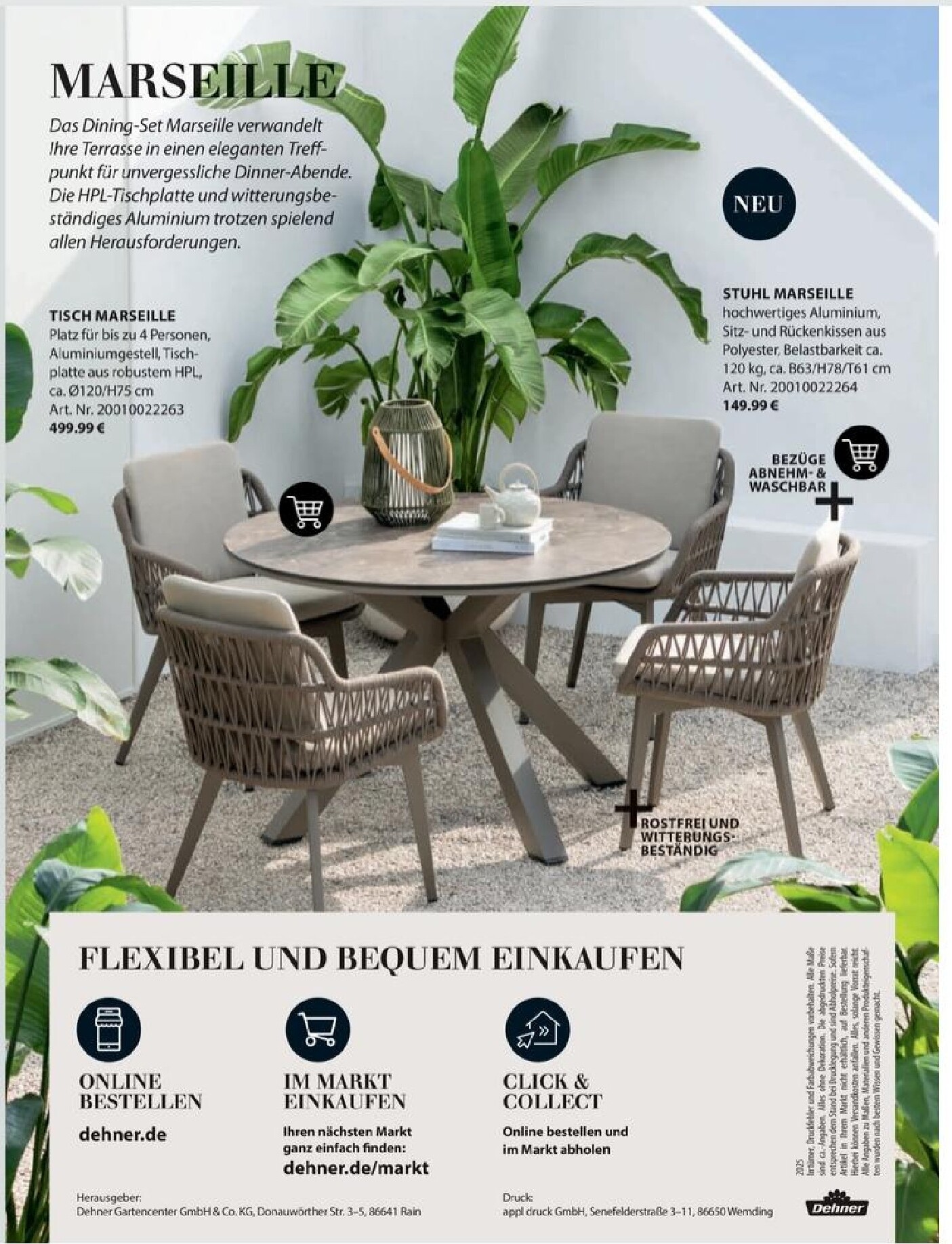 Abgerundet wird das Angebot durch das elegante Dining-Set ‚Marseille‘, das mit seinem witterungsbeständigen Aluminiumgestell und der robusten HPL-Tischplatte perfekt für Dinner-Abende im Freien ist. Die Stühle überzeugen mit einem bequemen Sitz- und Rückenkissen. Die Kollektion 2026 von Dehner beweist einmal mehr, dass Komfort, Funktionalität und ansprechendes Design Hand in Hand gehen können. Entdecken Sie alle Details und weitere Inspirationen im aktuellen Dehner Prospekt.