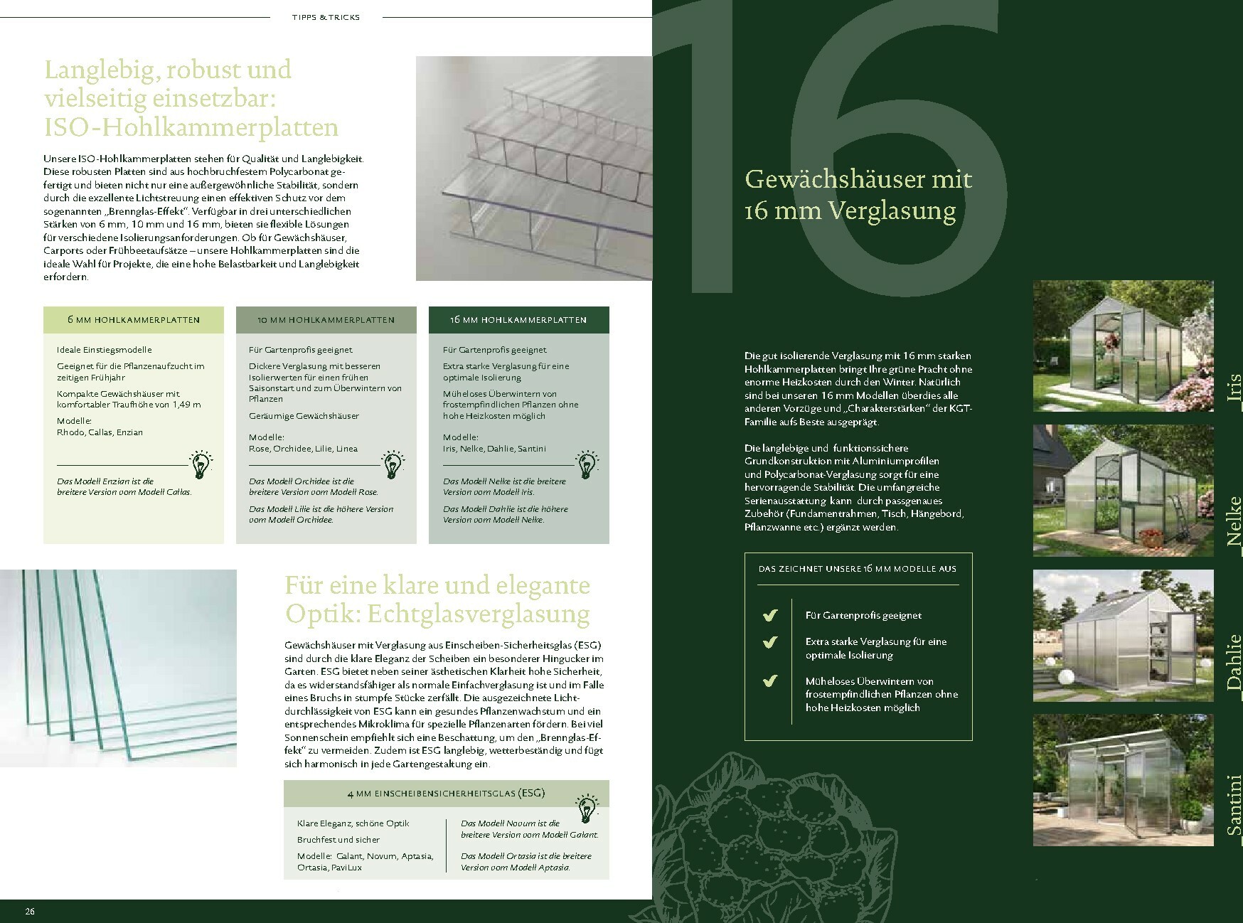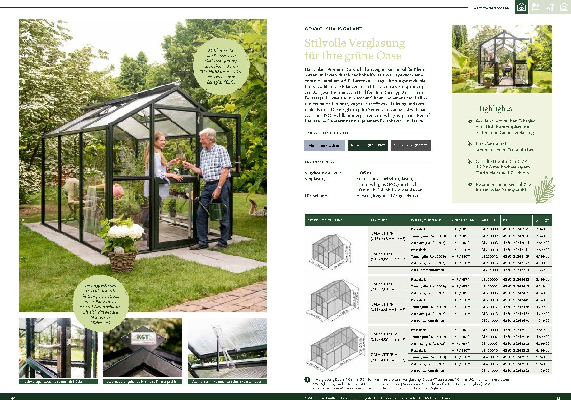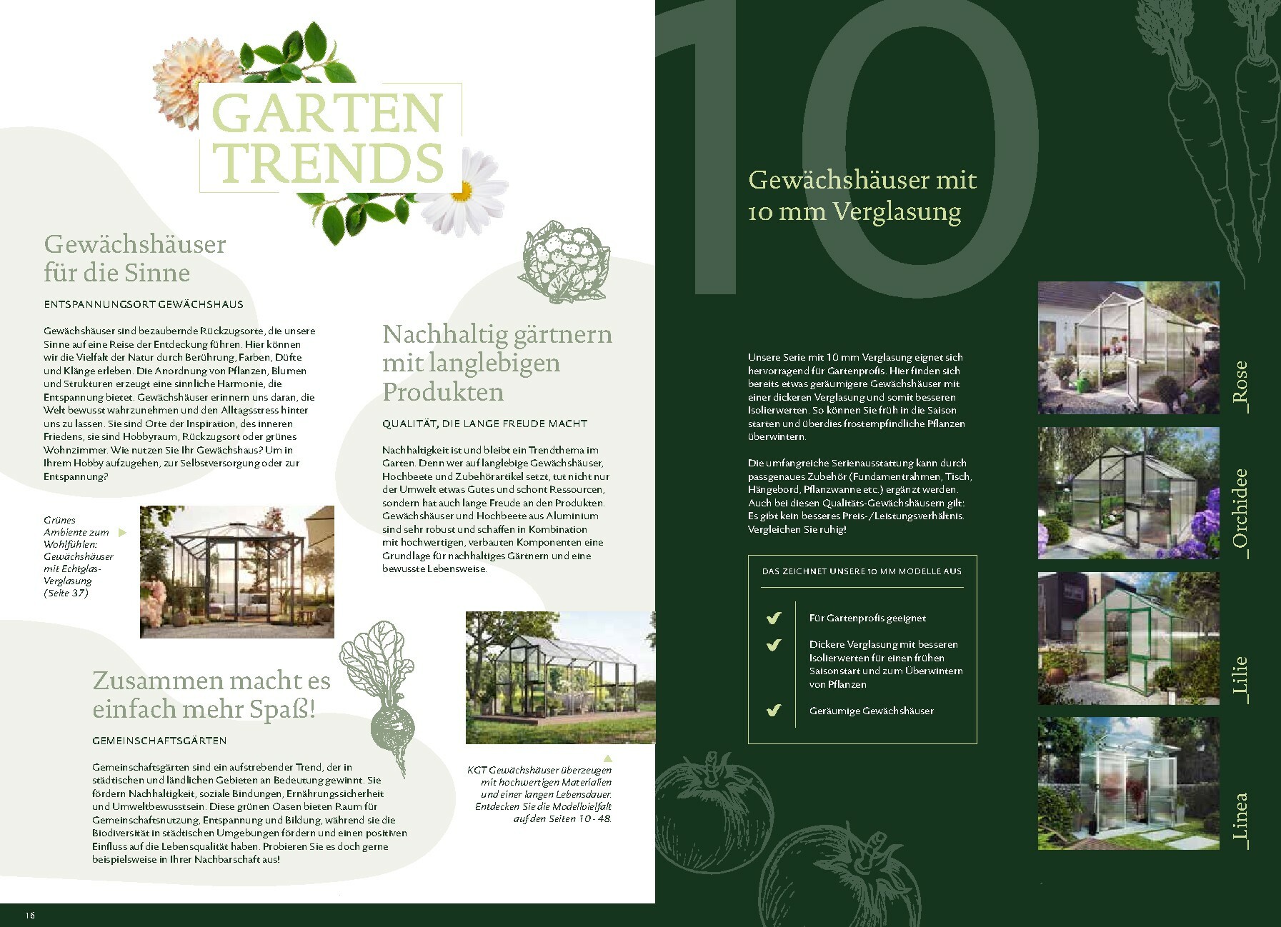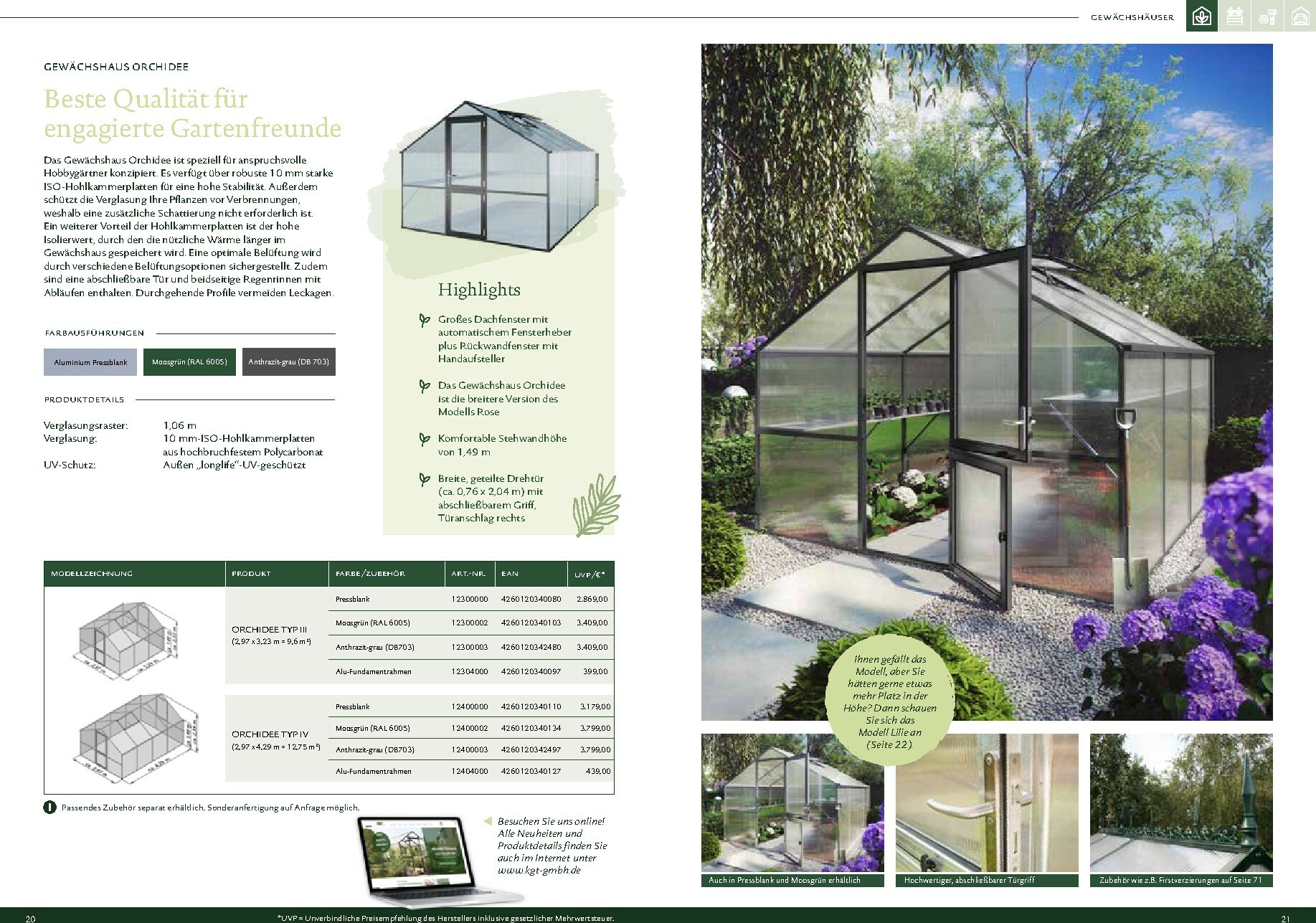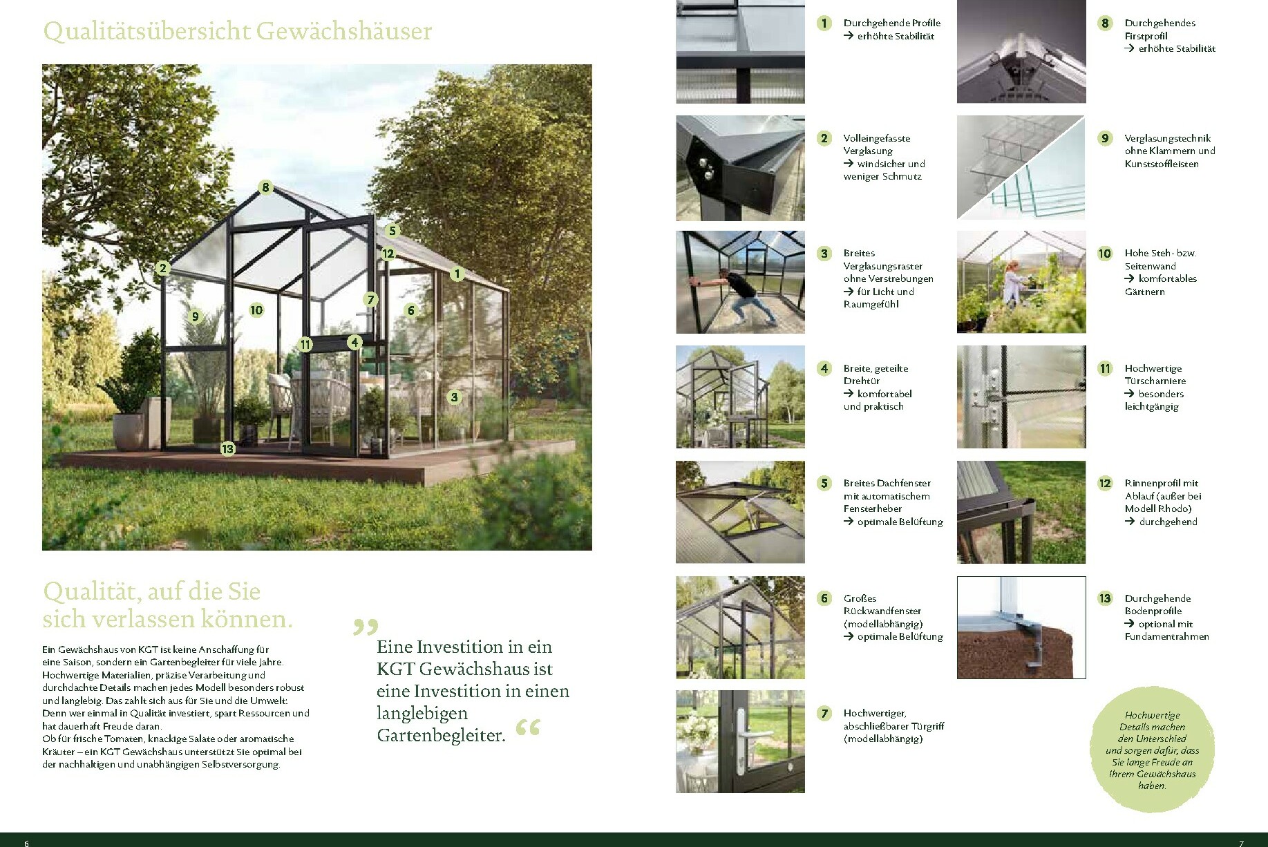 Die Gewächshäuser von KGT zeichnen sich durch ihre kompromisslose Qualität aus. Gefertigt in Deutschland, überzeugen sie mit stabilen Aluminium-Konstruktionen und hochwertigen Verglasungen, wahlweise mit ISO-Hohlkammerplatten oder Einscheiben-Sicherheitsglas (ESG). Modelle wie ‚Rion‘, ‚Orchidee‘ oder ‚Dahlia‘ bieten ideale Bedingungen für den Anbau von Obst und Gemüse. Dank durchdachter Details wie breiten Türen, optimaler Belüftung und einer robusten Bauweise, die durch eine 15-jährige Garantie auf Konstruktion und Rahmen untermauert wird, investieren Sie in eine langlebige und ertragreiche Zukunft für Ihren Garten.
