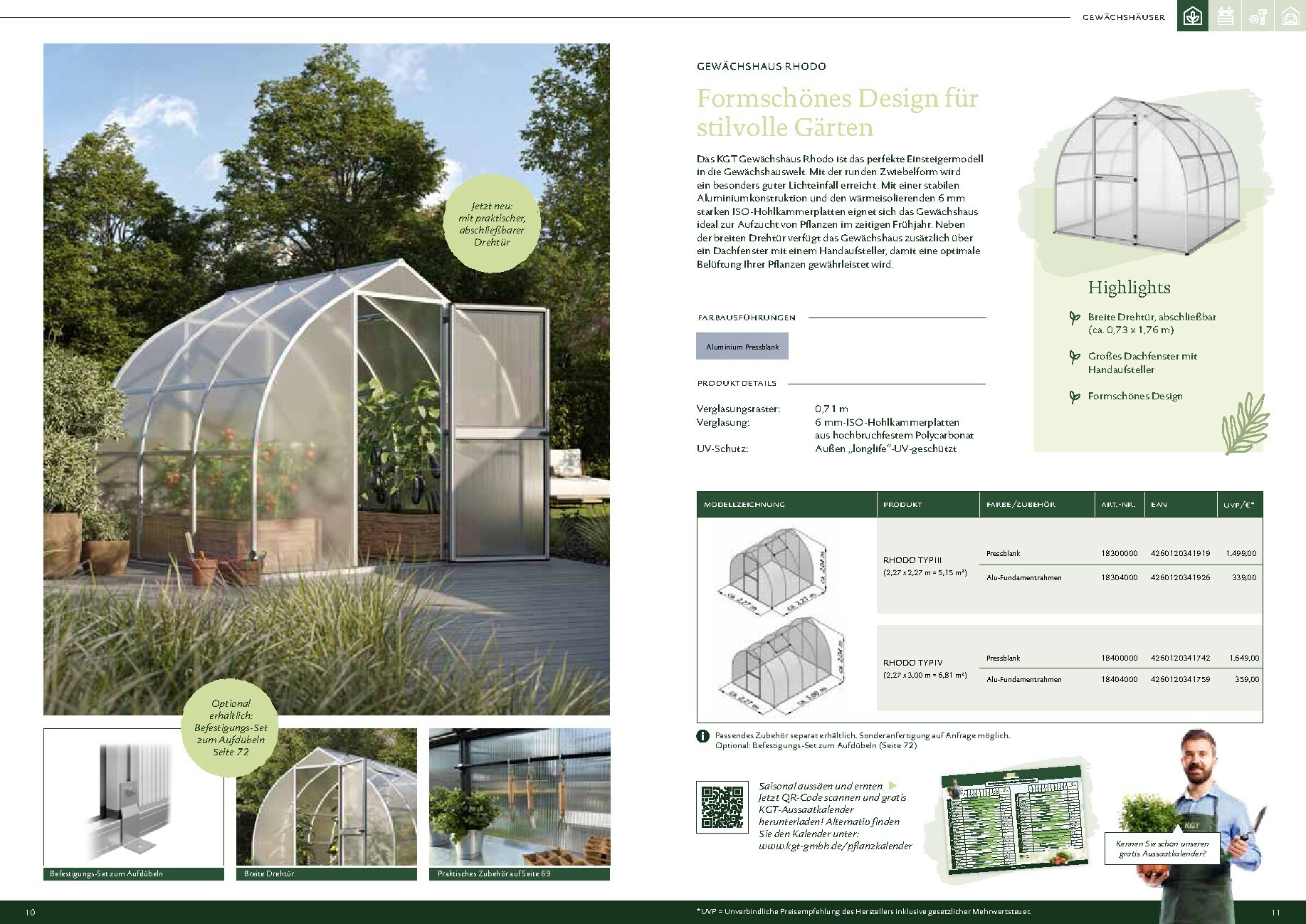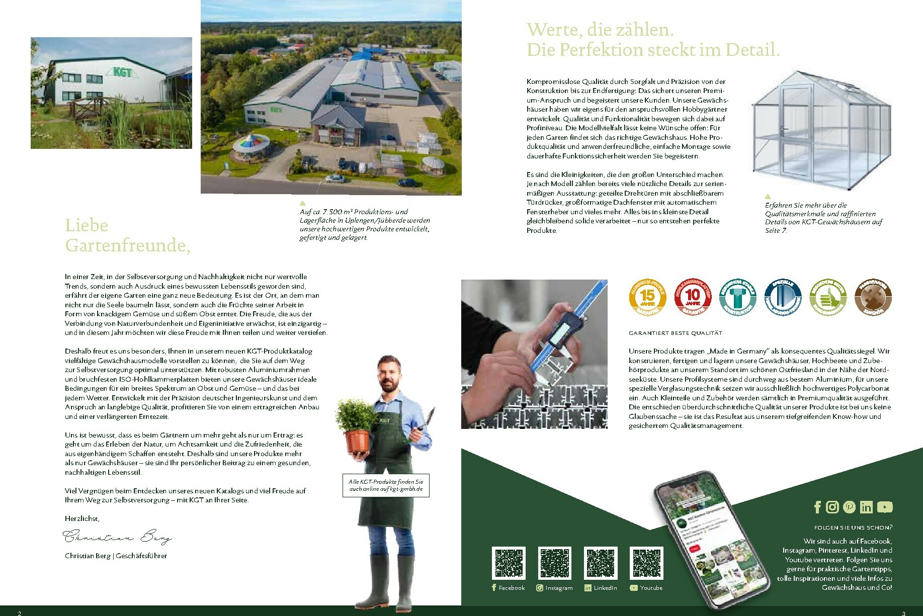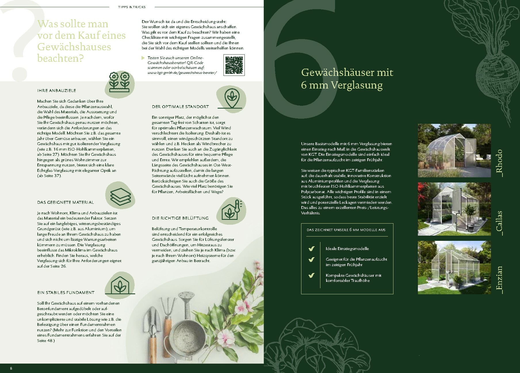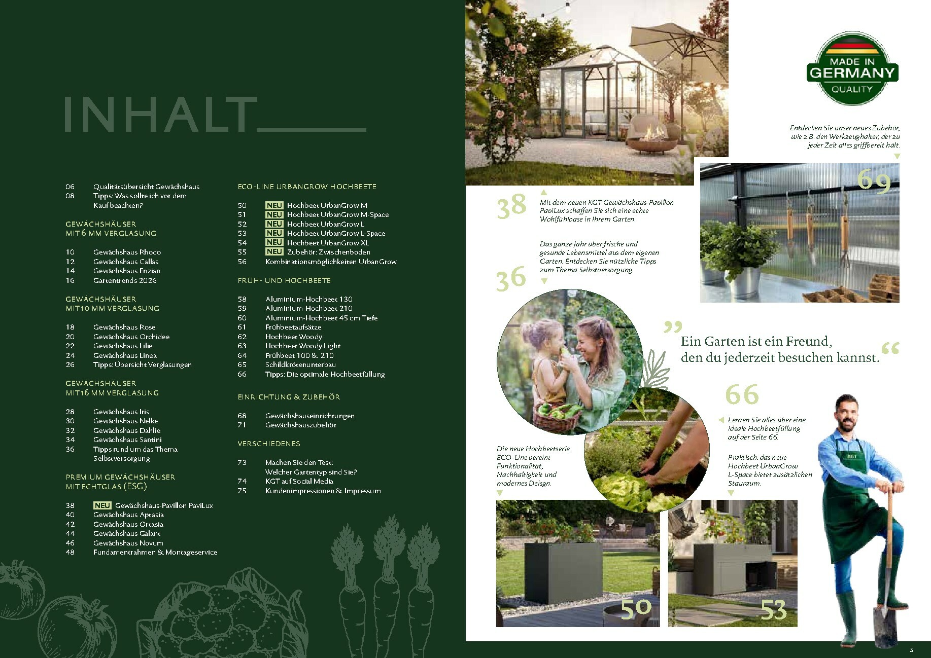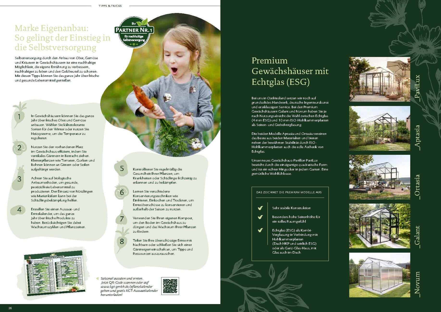 Die Gewächshäuser von KGT zeichnen sich durch ihre kompromisslose Qualität aus. Gefertigt in Deutschland, überzeugen sie mit stabilen Aluminium-Konstruktionen und hochwertigen Verglasungen, wahlweise mit ISO-Hohlkammerplatten oder Einscheiben-Sicherheitsglas (ESG). Modelle wie ‚Rion‘, ‚Orchidee‘ oder ‚Dahlia‘ bieten ideale Bedingungen für den Anbau von Obst und Gemüse. Dank durchdachter Details wie breiten Türen, optimaler Belüftung und einer robusten Bauweise, die durch eine 15-jährige Garantie auf Konstruktion und Rahmen untermauert wird, investieren Sie in eine langlebige und ertragreiche Zukunft für Ihren Garten.