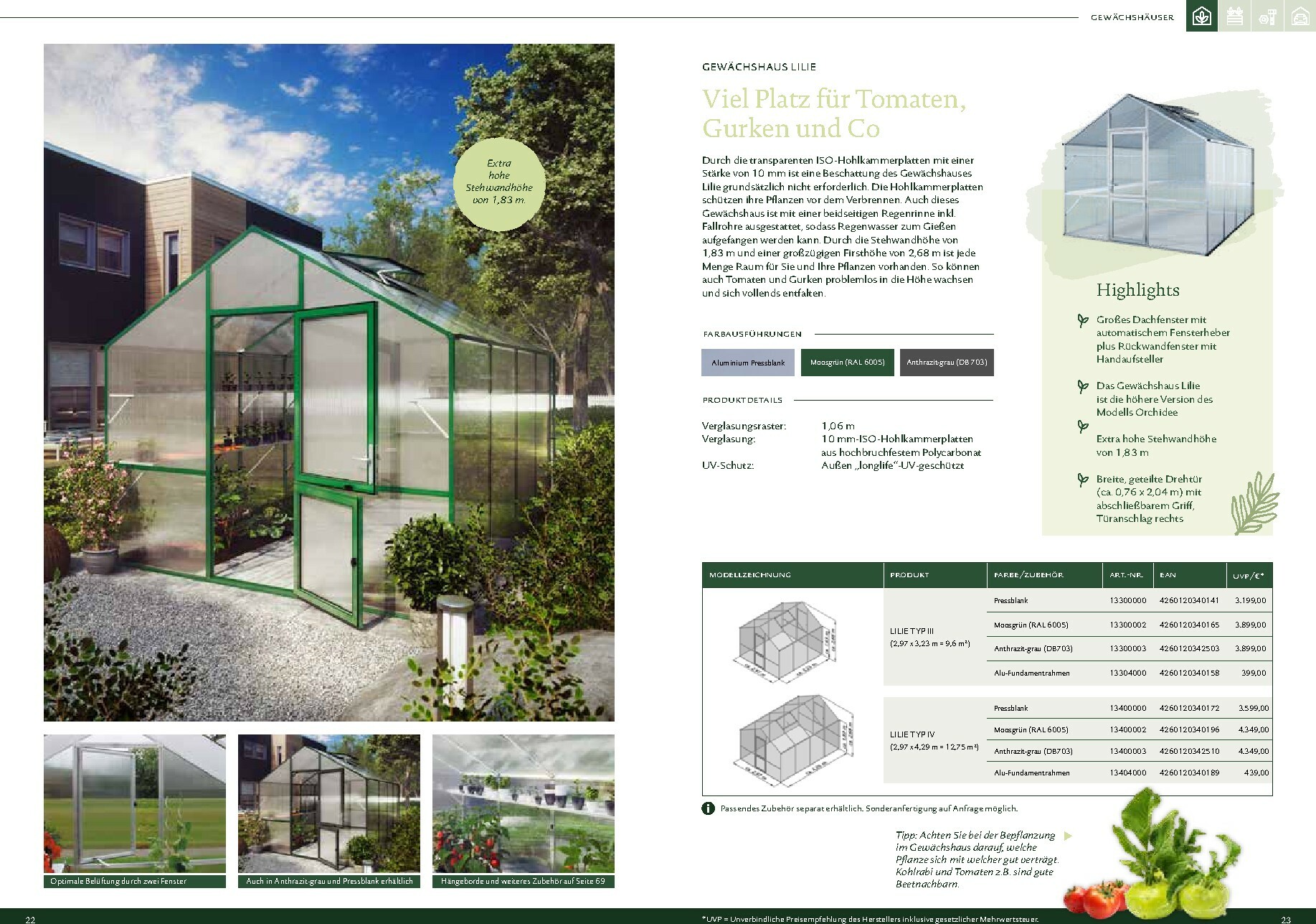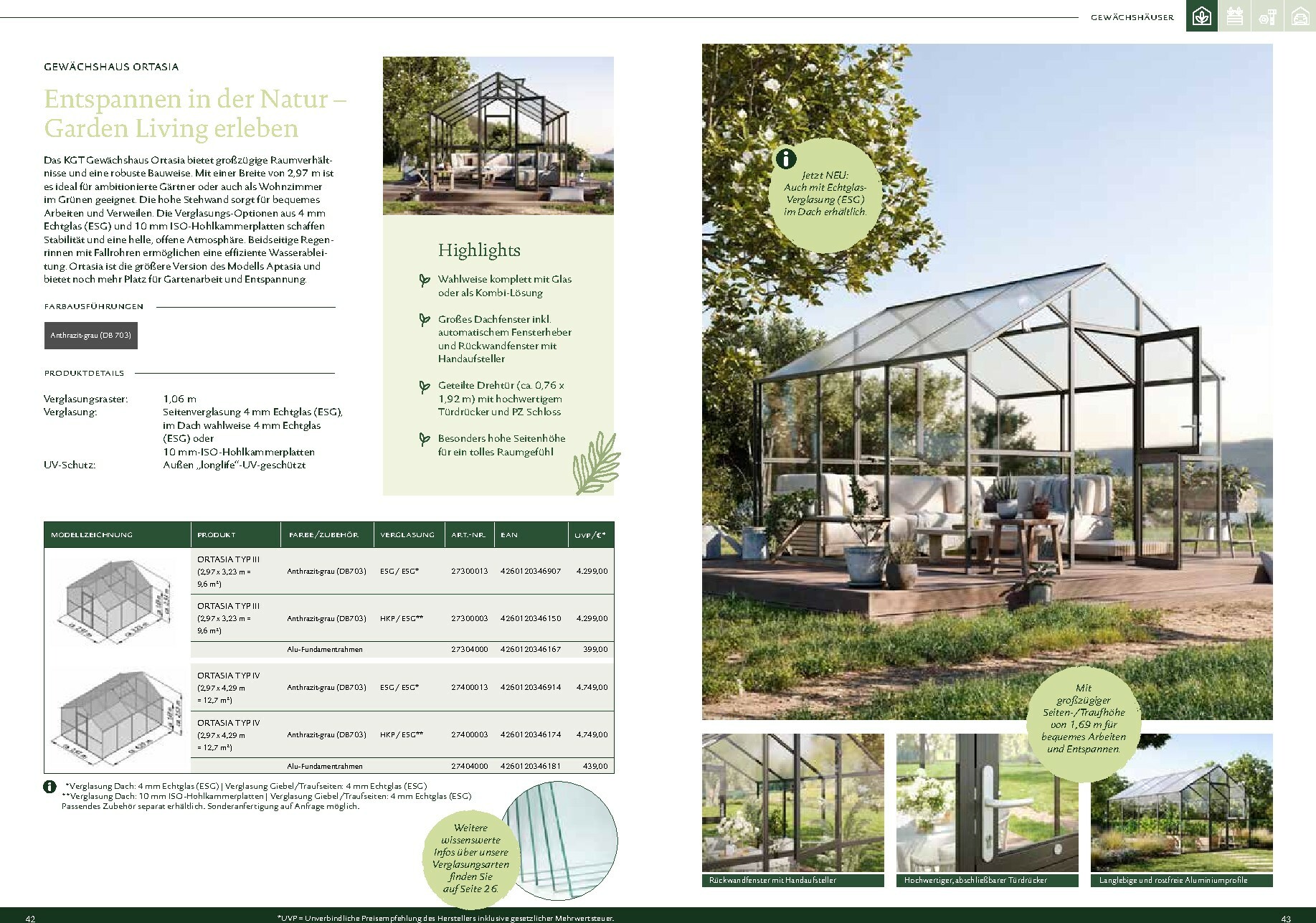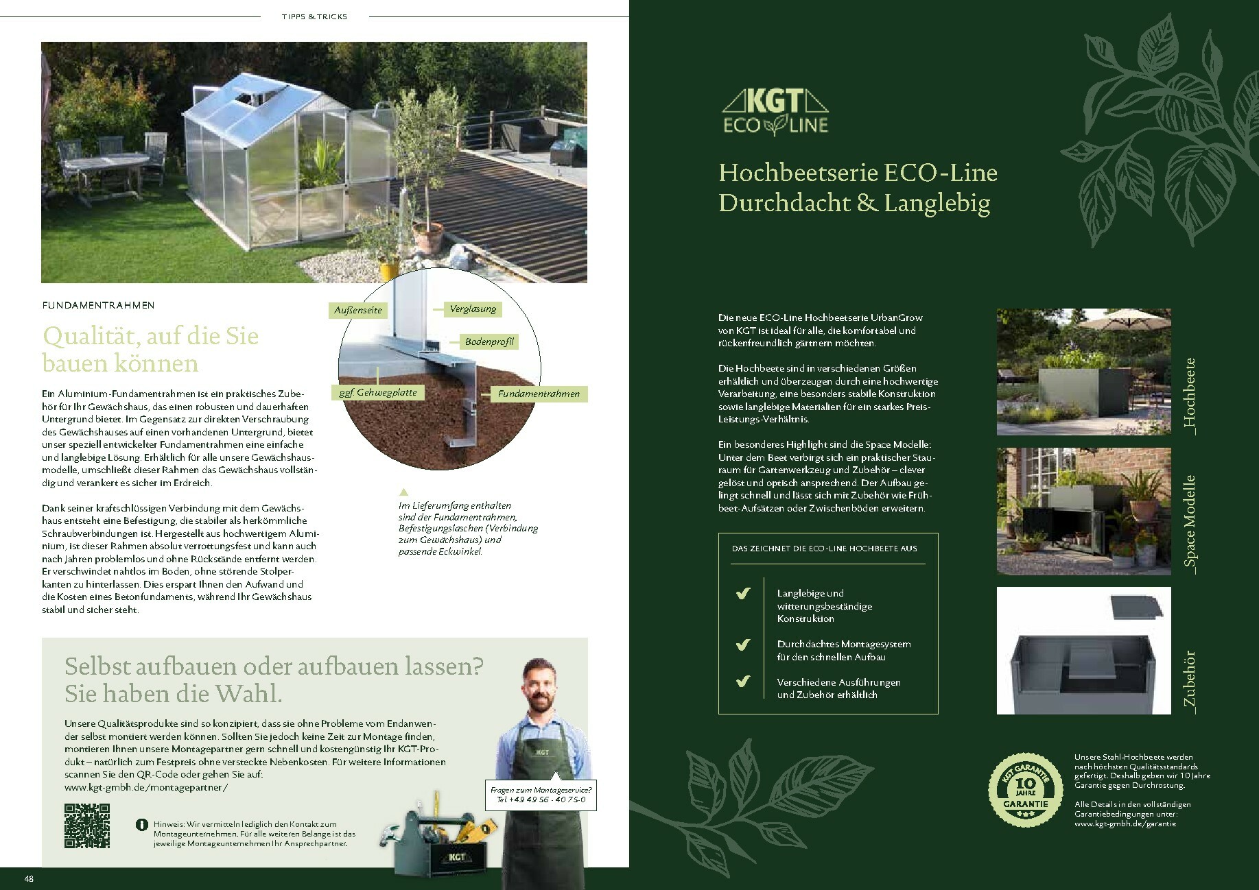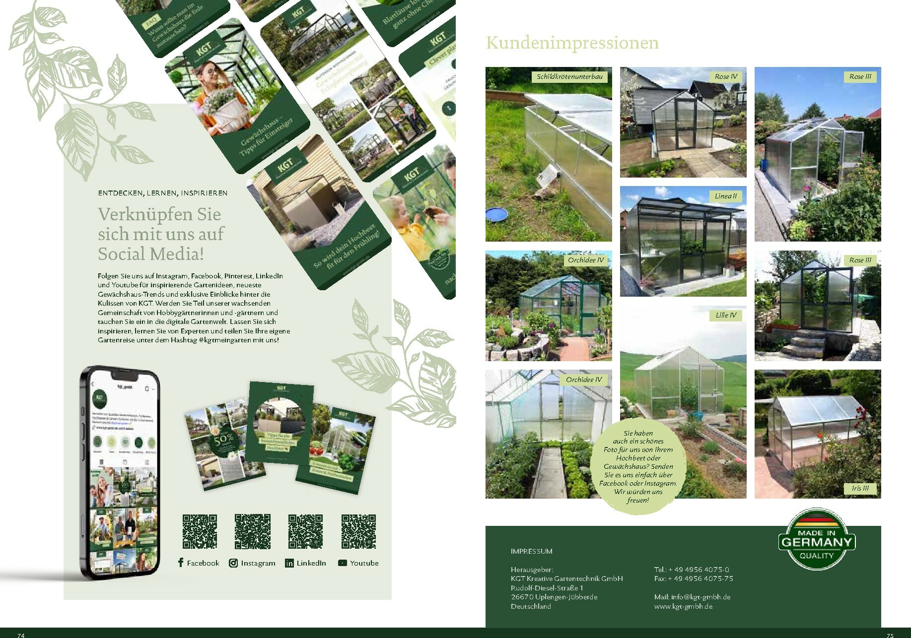 Die Gewächshäuser von KGT zeichnen sich durch ihre kompromisslose Qualität aus. Gefertigt in Deutschland, überzeugen sie mit stabilen Aluminium-Konstruktionen und hochwertigen Verglasungen, wahlweise mit ISO-Hohlkammerplatten oder Einscheiben-Sicherheitsglas (ESG). Modelle wie ‚Rion‘, ‚Orchidee‘ oder ‚Dahlia‘ bieten ideale Bedingungen für den Anbau von Obst und Gemüse. Dank durchdachter Details wie breiten Türen, optimaler Belüftung und einer robusten Bauweise, die durch eine 15-jährige Garantie auf Konstruktion und Rahmen untermauert wird, investieren Sie in eine langlebige und ertragreiche Zukunft für Ihren Garten.
