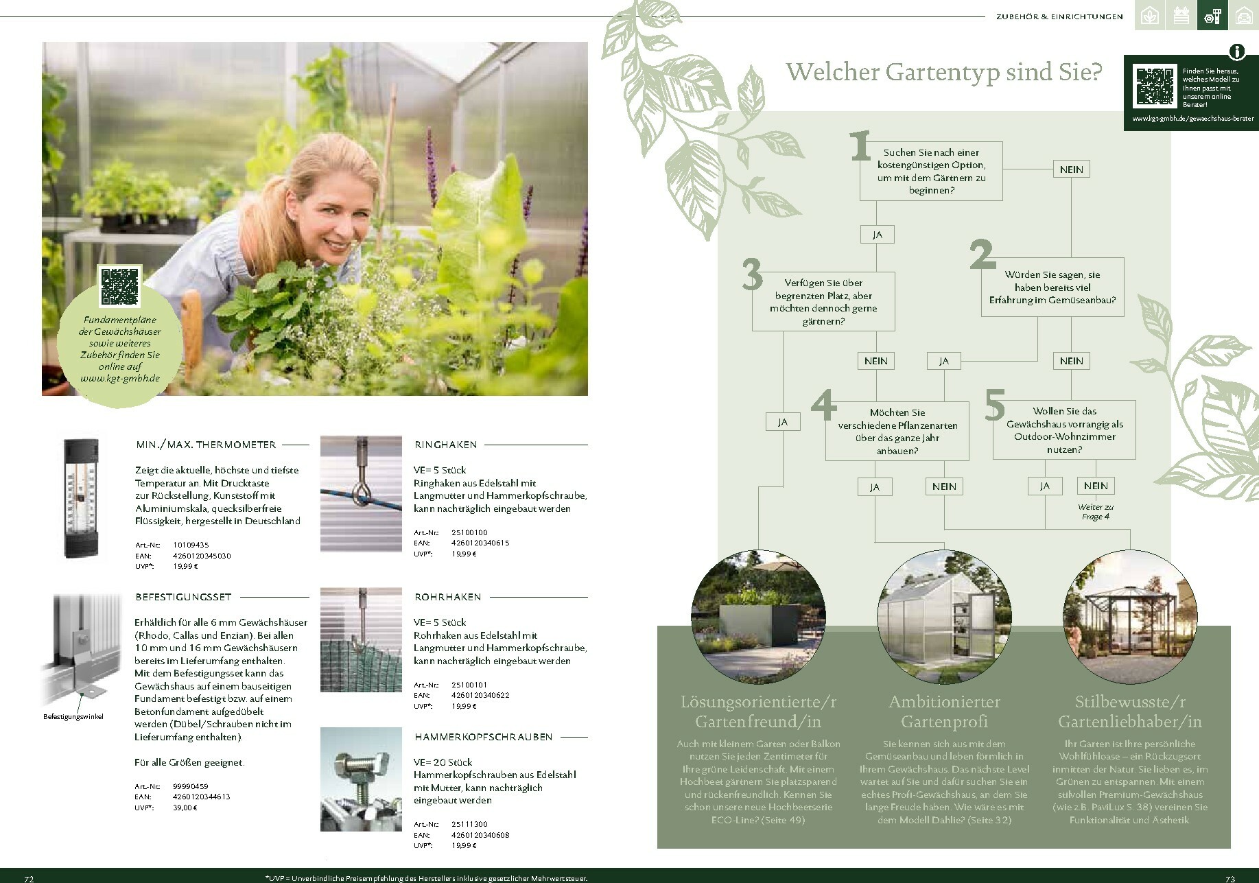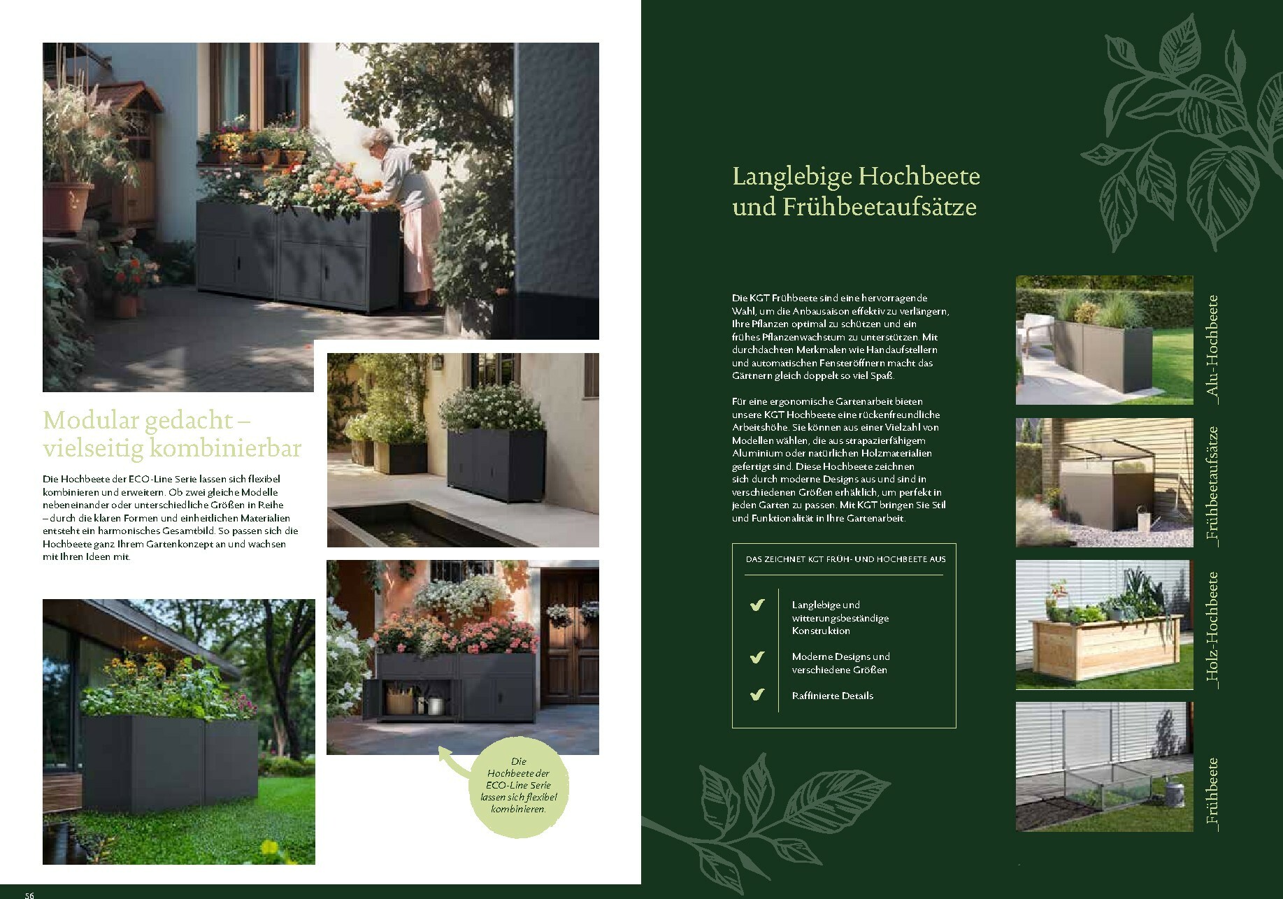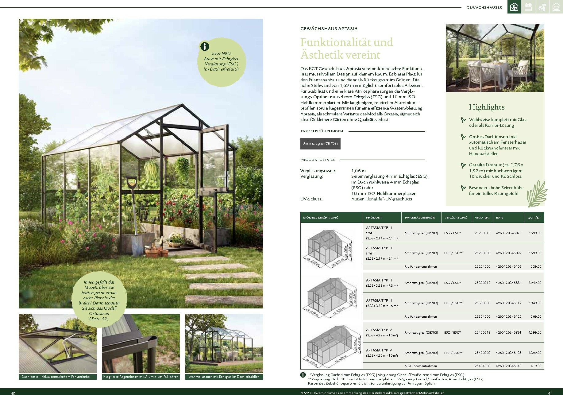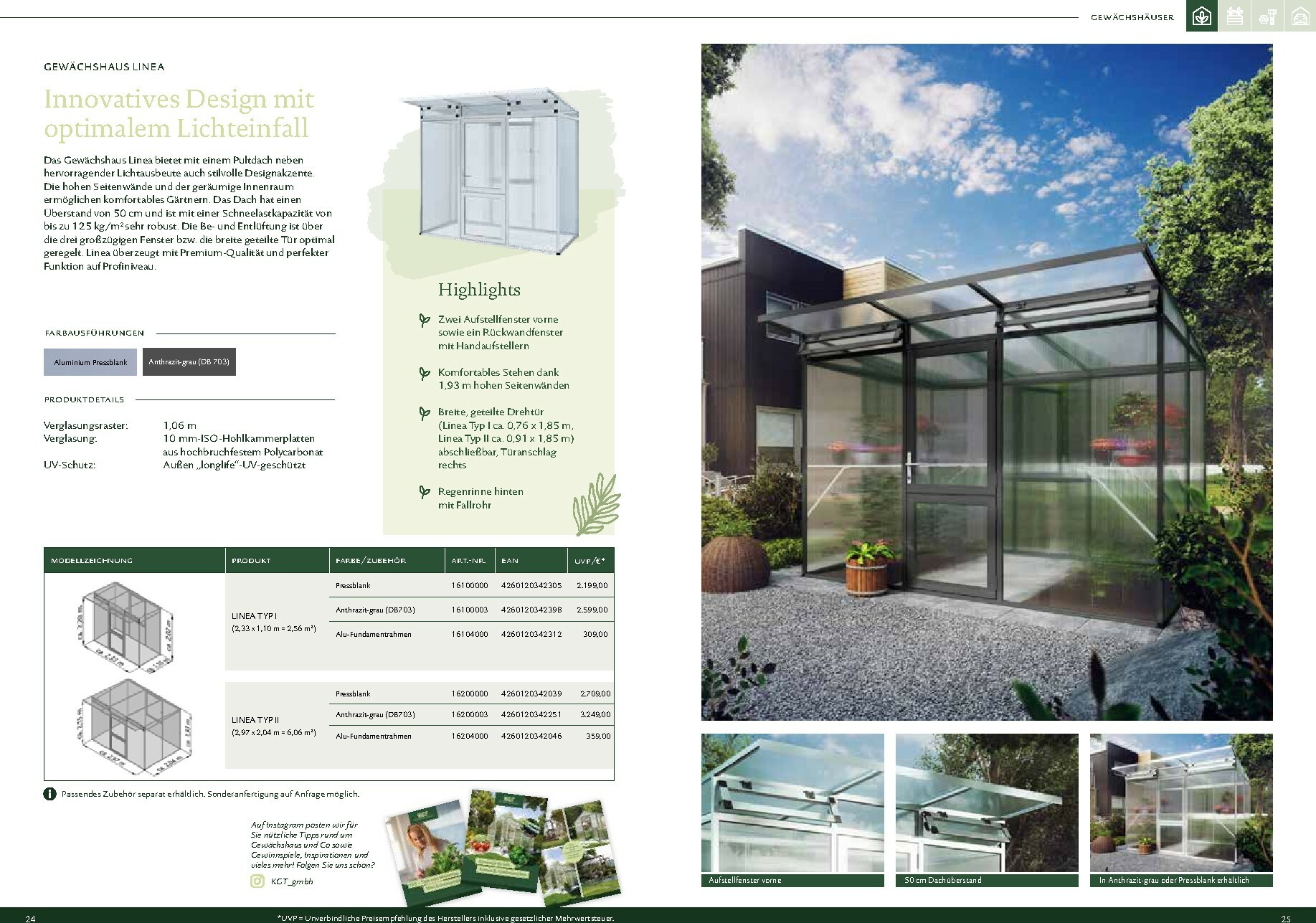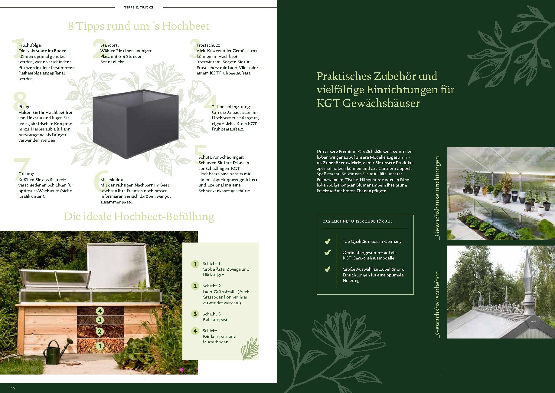 Die Gewächshäuser von KGT zeichnen sich durch ihre kompromisslose Qualität aus. Gefertigt in Deutschland, überzeugen sie mit stabilen Aluminium-Konstruktionen und hochwertigen Verglasungen, wahlweise mit ISO-Hohlkammerplatten oder Einscheiben-Sicherheitsglas (ESG). Modelle wie ‚Rion‘, ‚Orchidee‘ oder ‚Dahlia‘ bieten ideale Bedingungen für den Anbau von Obst und Gemüse. Dank durchdachter Details wie breiten Türen, optimaler Belüftung und einer robusten Bauweise, die durch eine 15-jährige Garantie auf Konstruktion und Rahmen untermauert wird, investieren Sie in eine langlebige und ertragreiche Zukunft für Ihren Garten.