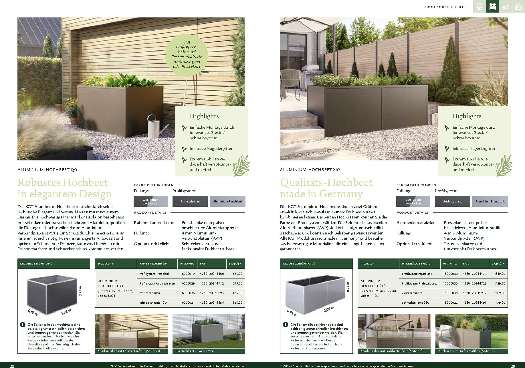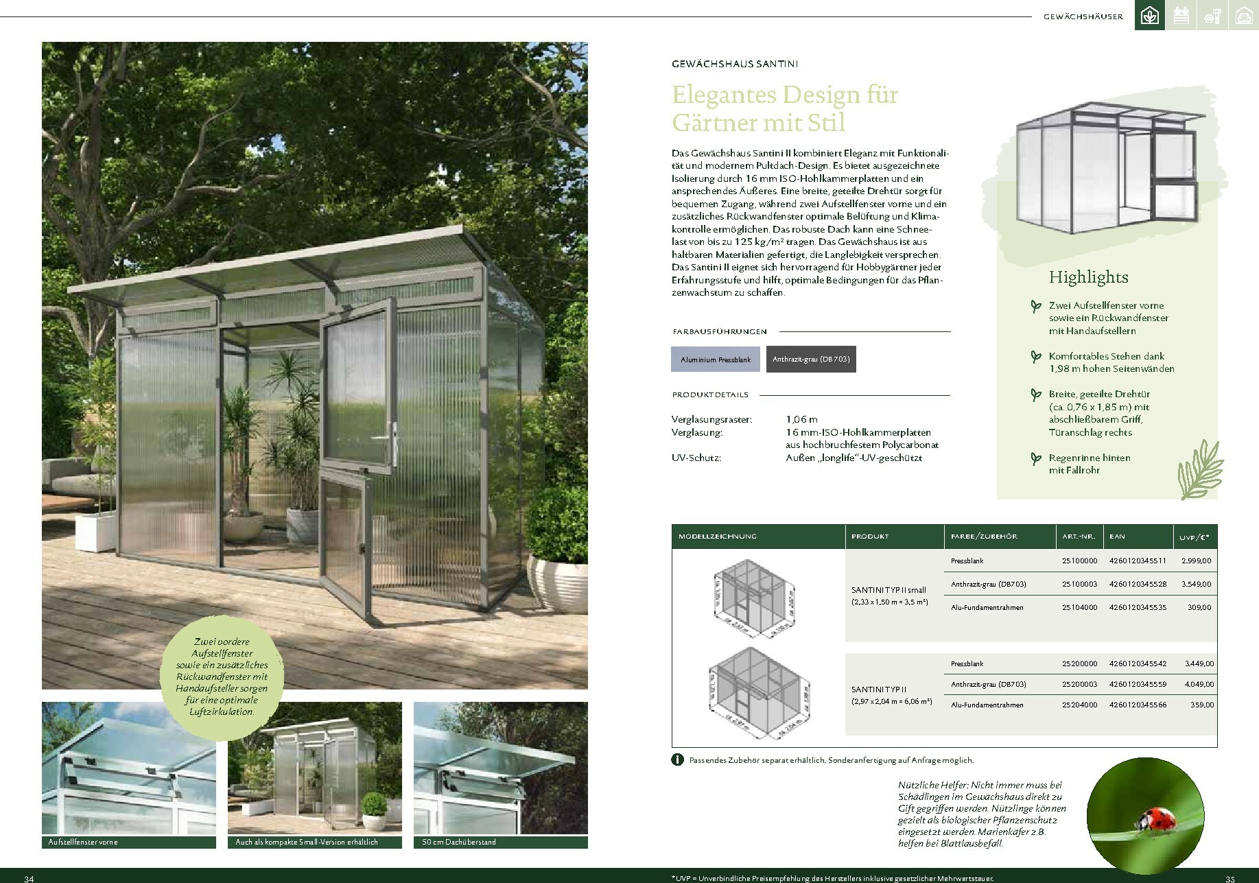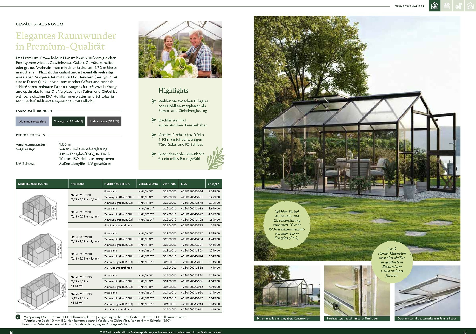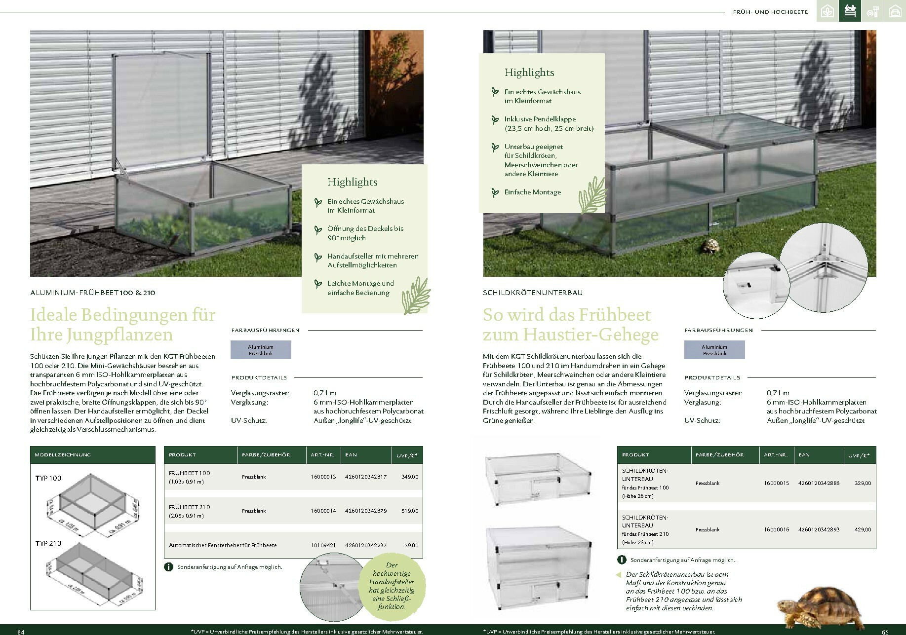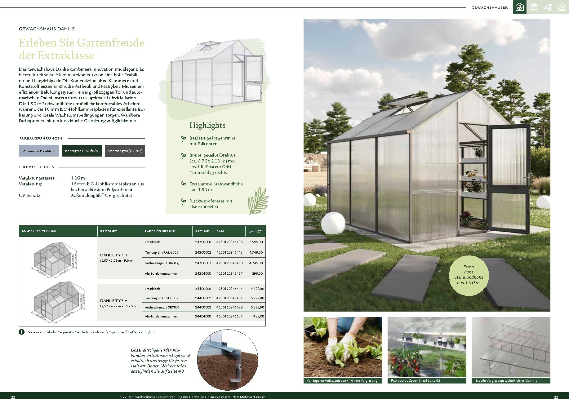 Die Gewächshäuser von KGT zeichnen sich durch ihre kompromisslose Qualität aus. Gefertigt in Deutschland, überzeugen sie mit stabilen Aluminium-Konstruktionen und hochwertigen Verglasungen, wahlweise mit ISO-Hohlkammerplatten oder Einscheiben-Sicherheitsglas (ESG). Modelle wie ‚Rion‘, ‚Orchidee‘ oder ‚Dahlia‘ bieten ideale Bedingungen für den Anbau von Obst und Gemüse. Dank durchdachter Details wie breiten Türen, optimaler Belüftung und einer robusten Bauweise, die durch eine 15-jährige Garantie auf Konstruktion und Rahmen untermauert wird, investieren Sie in eine langlebige und ertragreiche Zukunft für Ihren Garten.
