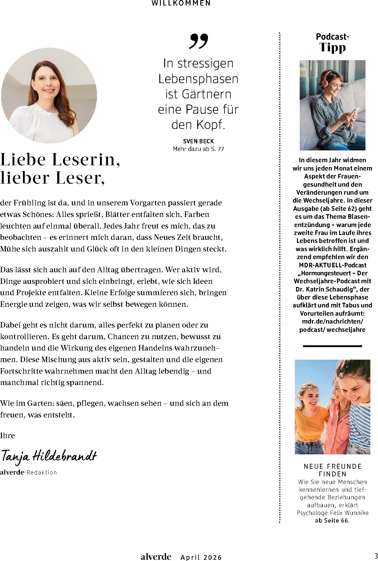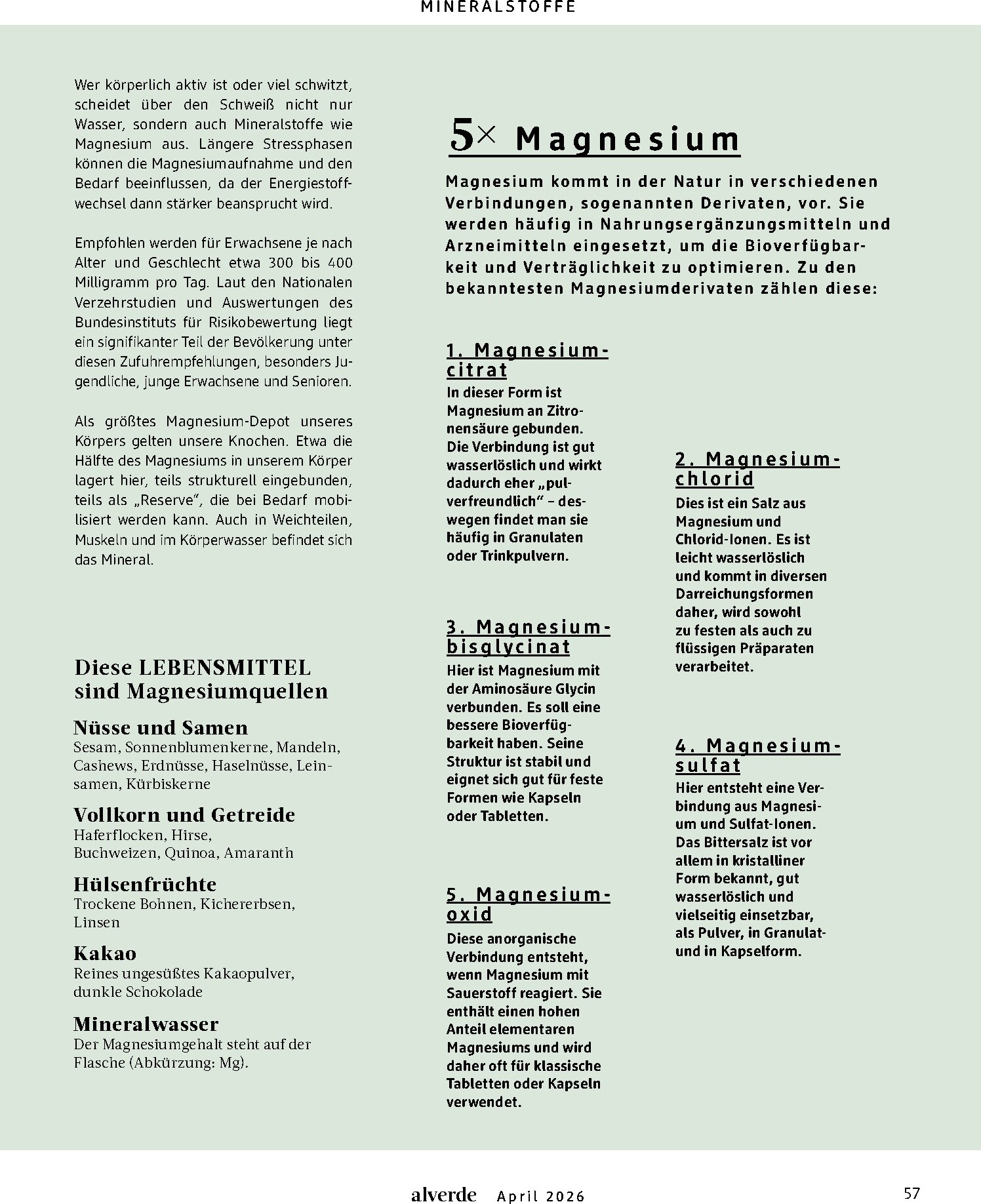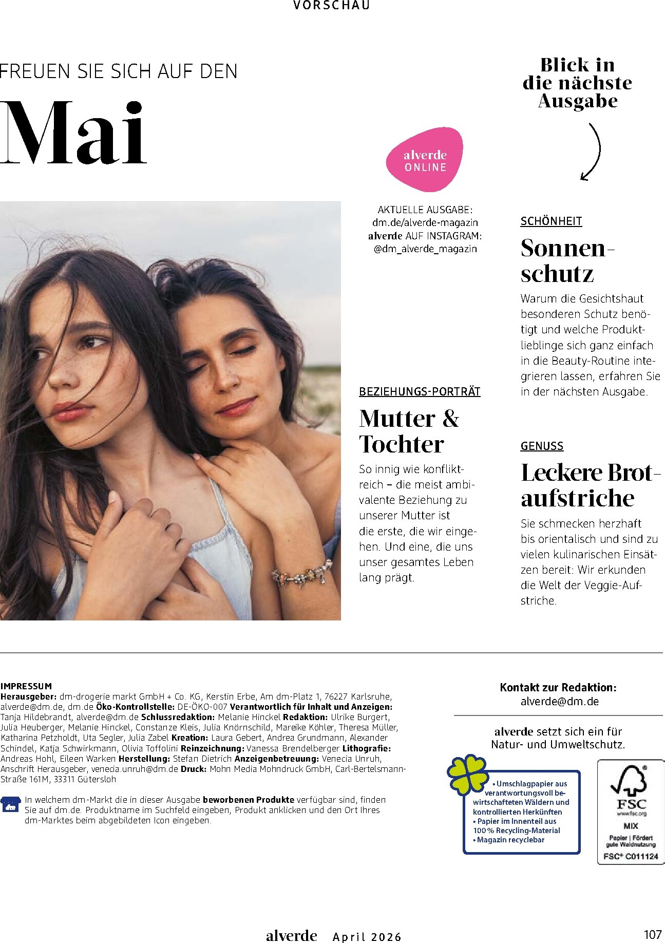 Neben dem bewegenden Interview mit Michaela May widmet sich das Magazin weiteren spannenden Themen. Erfahren Sie alles Wissenswerte über Magnesium und seine vielfältigen Aufgaben im Körper. Für einen frischen Start in den Tag gibt es wertvolle Pflege- und Make-up-Tipps für wache Augen, die müde Blicke im Nu verschwinden lassen. Ein weiterer Artikel gibt Ratschläge, wie man neue Freundschaften knüpfen kann – ein Thema, das besonders nach den langen Wintermonaten an Bedeutung gewinnt. Diese Inhalte machen das alverde Magazin zu einem unverzichtbaren Begleiter für einen bewussten und schönen Frühling.