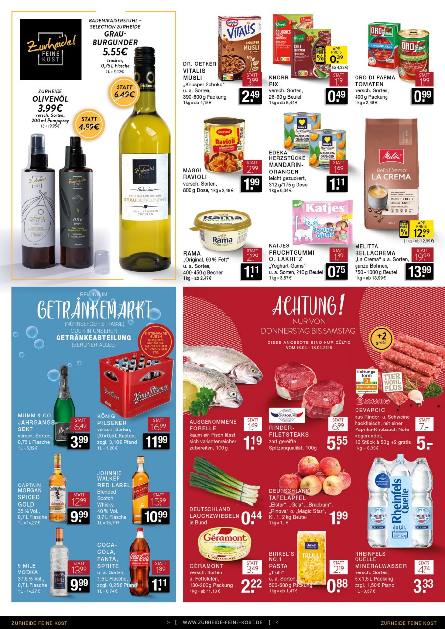 Auch der Getränkemarkt und das Trockensortiment halten attraktive Deals bereit. Der badische Graue Burgunder vom Weingut Kaiserstuhl ist für 5,55 € pro 0,75L-Flasche erhältlich und passt hervorragend zu vielen Gerichten. Für Erfrischung sorgen Coca-Cola, Fanta oder Sprite in der 1,5L-Flasche für nur 1,89 €. Zum Frühstück empfiehlt sich das Dr. Oetker Vitalis Müsli für 2,49 €. Kaffeegenießer freuen sich über die Melitta BellaCrema Bohnen für 13,99 € pro Kilogramm. Entdecken Sie alle weiteren Schnäppchen und planen Sie Ihren Einkauf mit dem aktuellen Edeka Zurheide Prospekt.