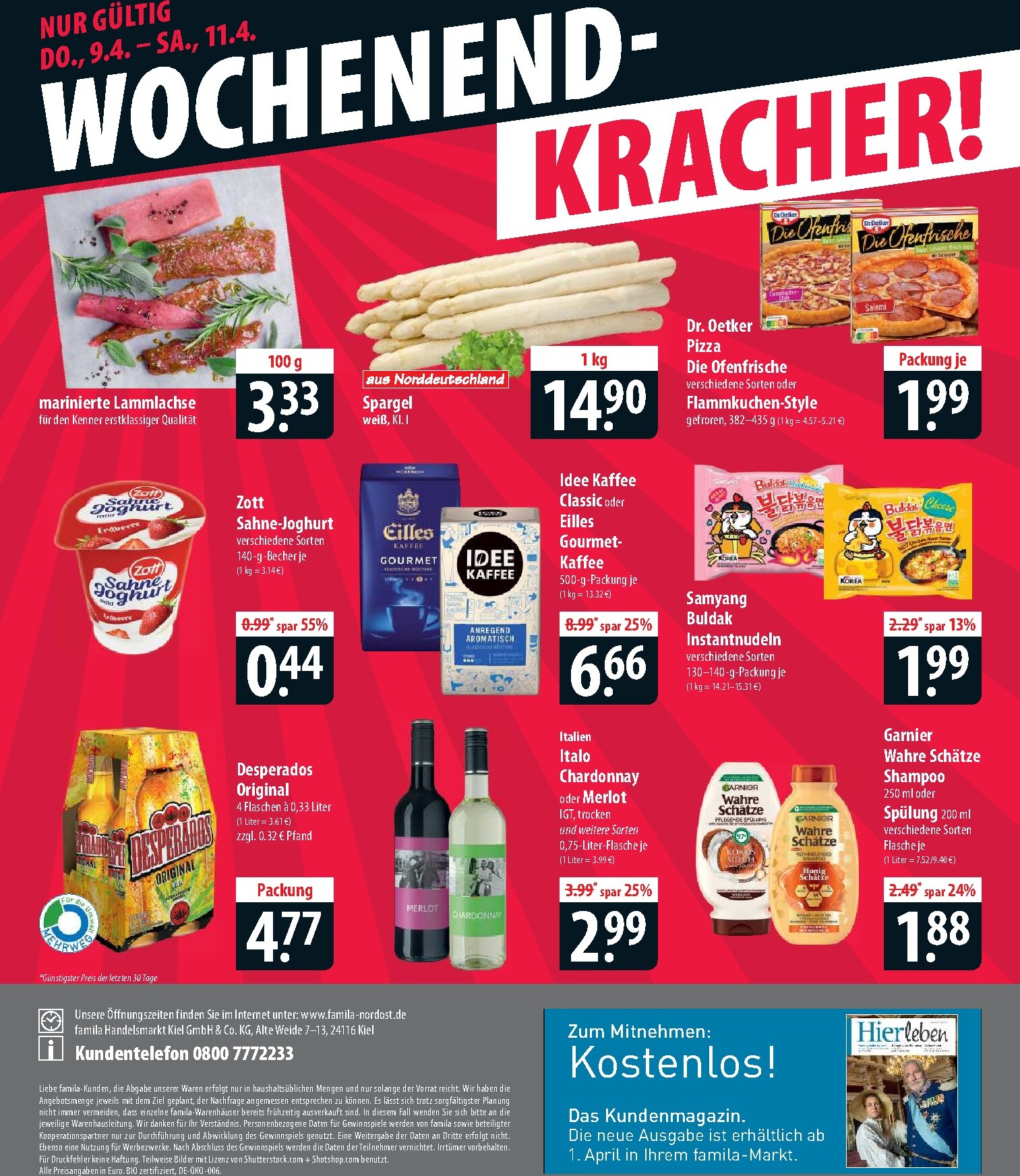 Besonders am Wochenende lohnt sich der Einkauf bei Famila. Die „Wochenend-Kracher“ ab Donnerstag locken mit sensationellen Preisen. Der Zott Sahne-Joghurt ist mit 55 % Rabatt für nur 0,44 € pro Becher erhältlich. Ein weiteres Highlight ist der frische deutsche Spargel für 14,90 € pro Kilo. Für ein schnelles Abendessen ist die Dr. Oetker Pizza oder der Flammkuchen für nur 1,99 € ideal. Weinliebhaber freuen sich über italienischen Chardonnay oder Merlot für 2,99 €. Alle weiteren Angebote finden Sie im aktuellen Famila Nordost Prospekt.
