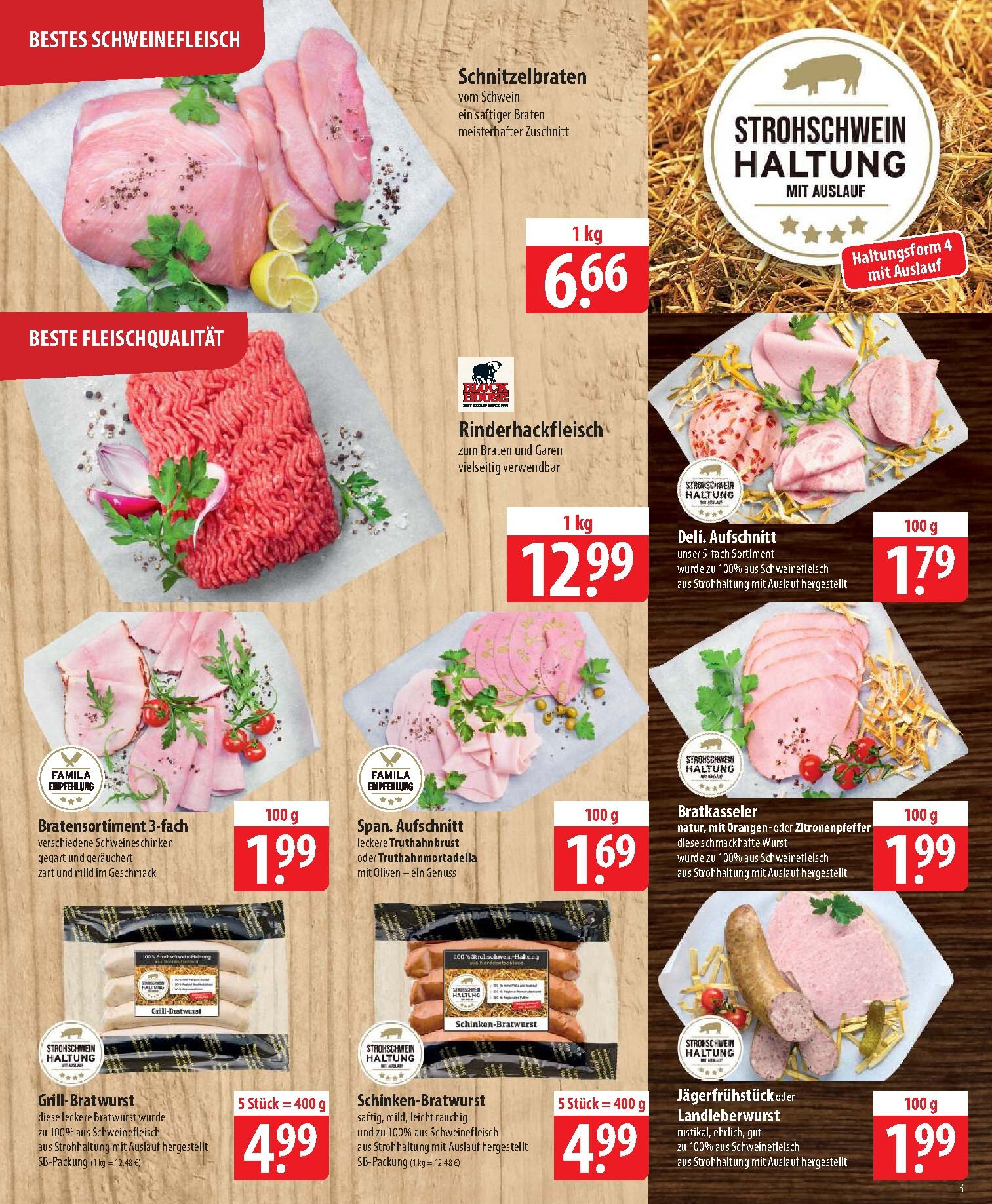 Die Qualitätsfleischerei von Famila präsentiert eine beeindruckende Auswahl für alle Grillfans und Liebhaber von gutem Fleisch. Das zarte Rib-Eye-Steak von Block House für 3,33 € pro 100 g ist ein Genuss für Kenner. Auch die vielfältigen Grillplatten, wie die „Beef-Grillplatte“ oder die „Iberische Grillplatte“ für je 2,99 € pro 100 g, bieten Abwechslung und höchste Qualität. Mit dem Famila Nordost Prospekt 07.04.2026 – 11.04.2026 Angebote Angebote zum Blättern entdecken Sie auch die exklusiven Strohschwein-Produkte, wie die Wiener Würstchen oder die Curry-Bratwurst, die für hervorragenden Geschmack und artgerechte Haltung stehen. Der Schnitzelbraten für 6,66 € pro Kilo rundet das Fleischangebot ab.