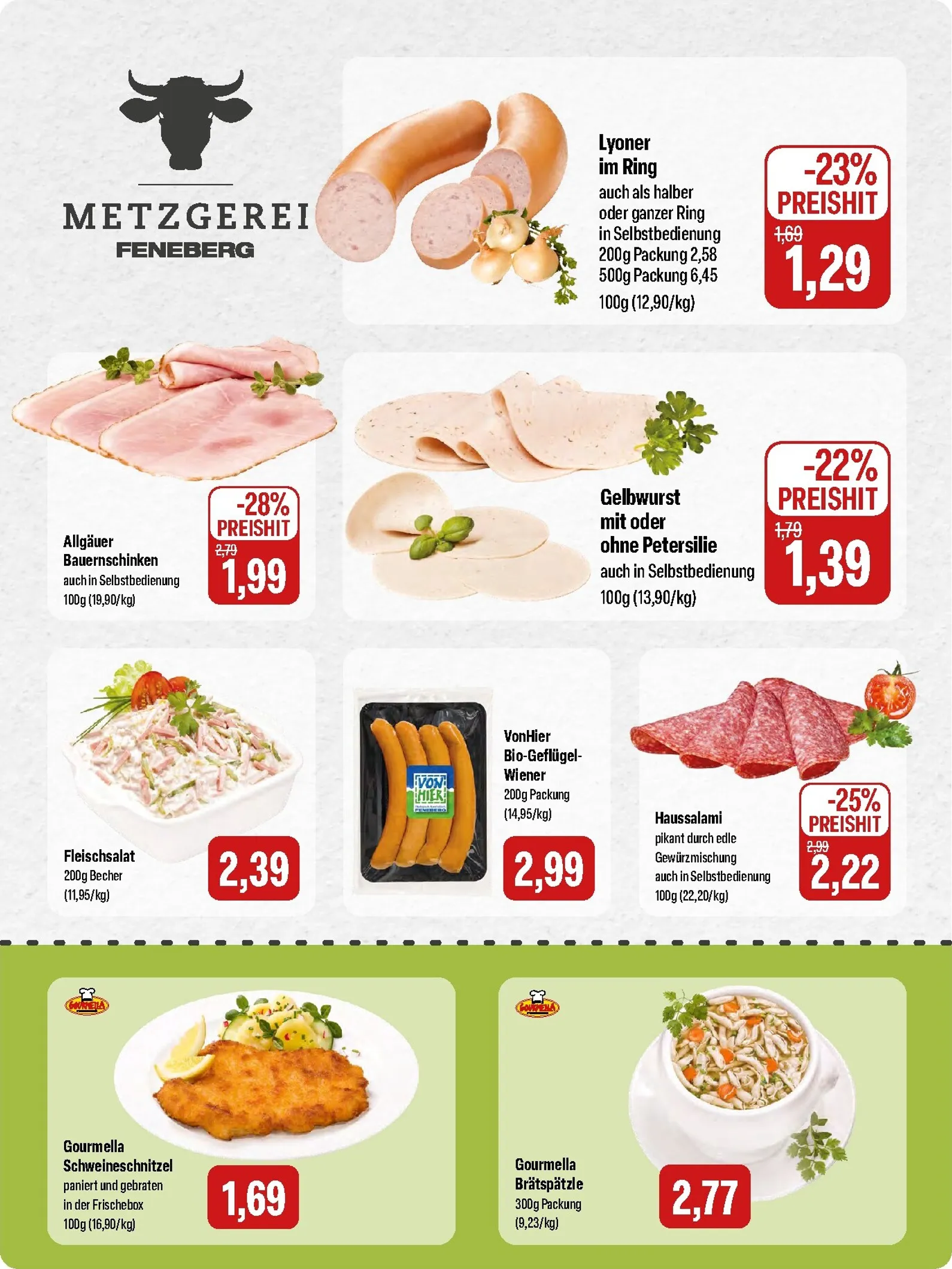 Die Metzgerei Feneberg überzeugt mit Qualität zu Top-Preisen. Der Allgäuer Bauernschinken für 1,99 € pro 100g oder die Lyoner im Ring für nur 1,29 € sind ideal für eine deftige Brotzeit. Für Grillfreunde bietet sich das frische Schweinerückensteak für 3,49 € an. Fischliebhaber kommen ebenfalls auf ihre Kosten: Das marinierte Lachsfilet für 2,99 € verspricht eine köstliche Mahlzeit. Diese Angebote garantieren Genuss für die nächste Zeit.