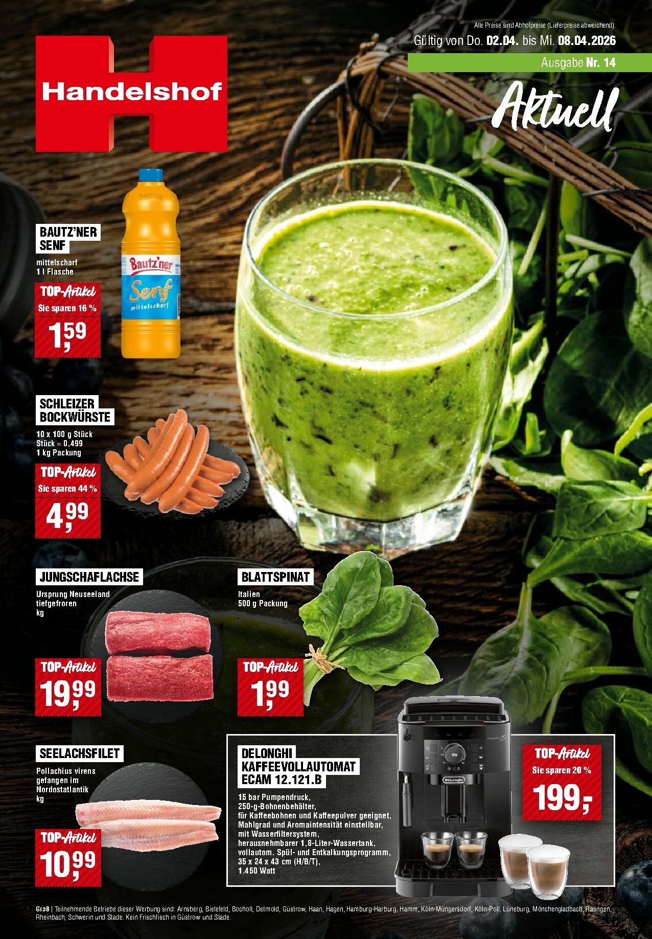 Ab dem 2. April bis zum 8. April 2026 präsentiert Handelshof eine neue Ausgabe seiner aktuellen Angebote, die jeden Gaumen erfreuen. In dieser Woche finden Sie eine Fülle an Top-Artikeln zu unschlagbaren Preisen. Ein besonderes Highlight für alle Kaffeeliebhaber ist der De’Longhi Kaffeevollautomat ECAM 221.A B für nur 199 Euro, bei dem Sie ganze 26 % sparen. Die aktuellen Handelshof Prospekt 02.04.2026 – 08.04.2026 Angebote nächste Woche bieten die perfekte Gelegenheit, Ihre Küche mit hochwertigen Produkten auszustatten und dabei den Geldbeutel zu schonen. Von frischen Lebensmitteln bis hin zu Haushaltsgeräten ist für jeden etwas dabei.