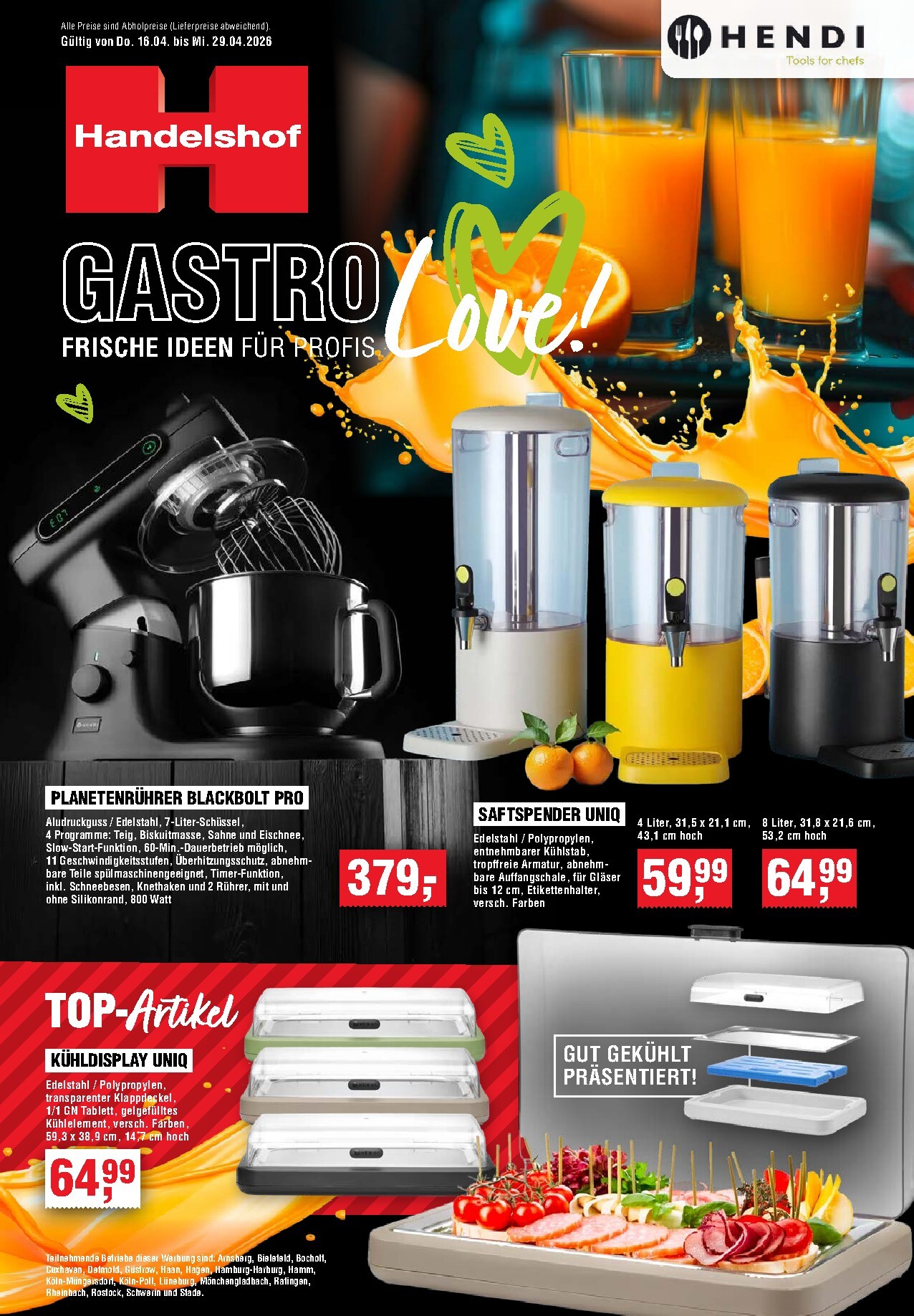 Handelshof läutet mit der Aktion „Gastro Love“ eine besondere Angebotswoche für alle Profis und ambitionierten Hobbyköche ein. Vom 16. bis zum 29. April 2026 finden Sie bei Handelshof eine exklusive Auswahl an hochwertiger Gastronomieausstattung der Marke Hendi zu unschlagbaren Preisen. Diese Aktion ist die perfekte Gelegenheit, Ihre Küche aufzurüsten, und der aktuelle Handelshof Prospekt 16.04.2026 – 29.04.2026 Werbung bietet Ihnen einen umfassenden Überblick über die besten Deals. Ein absolutes Highlight ist die Planetenrührmaschine Blackbolt Pro für nur 379,00 €, die mit vier Programmen und umfangreichem Zubehör selbst anspruchsvollste Teige mühelos meistert. Sie ist ideal für Bäckereien, Restaurants oder für jeden, der Wert auf professionelle Ergebnisse legt.