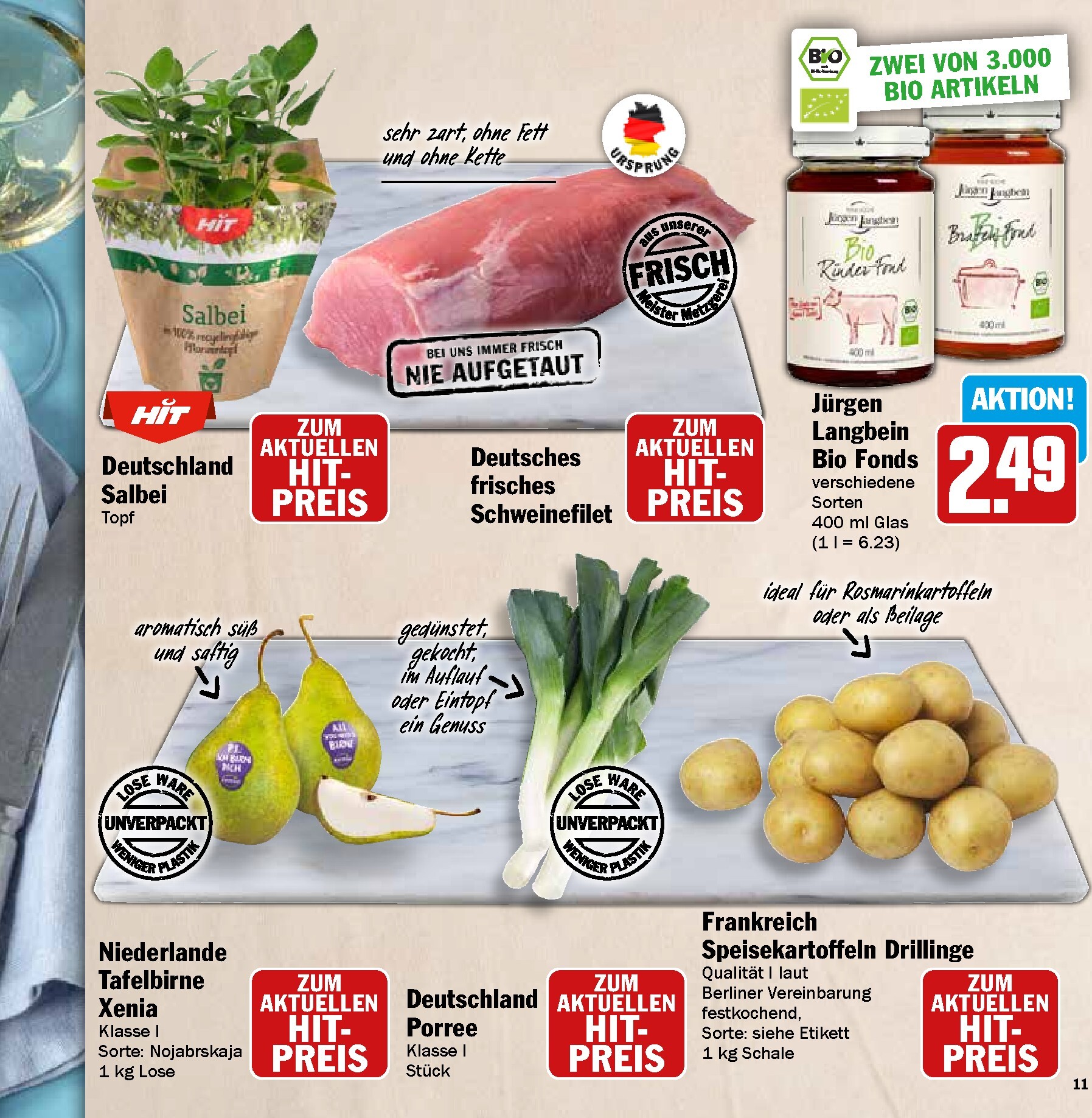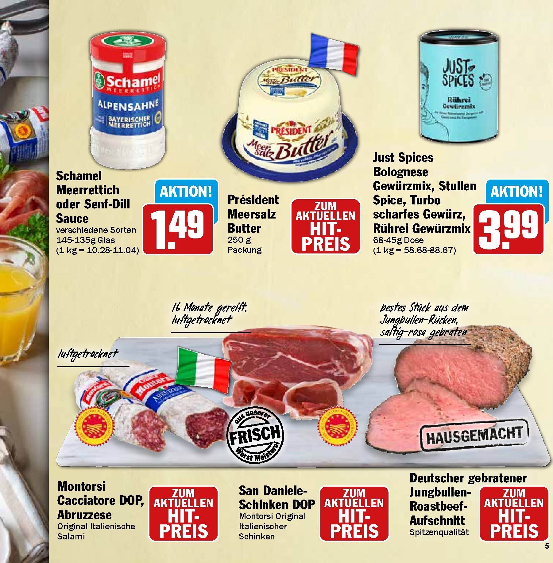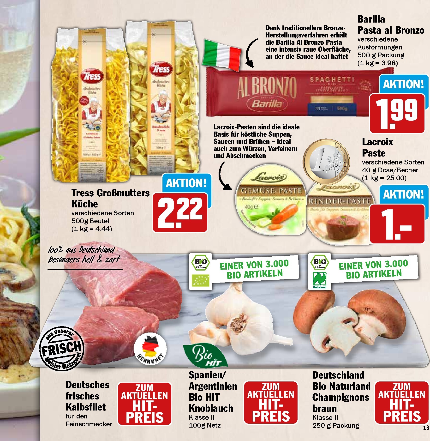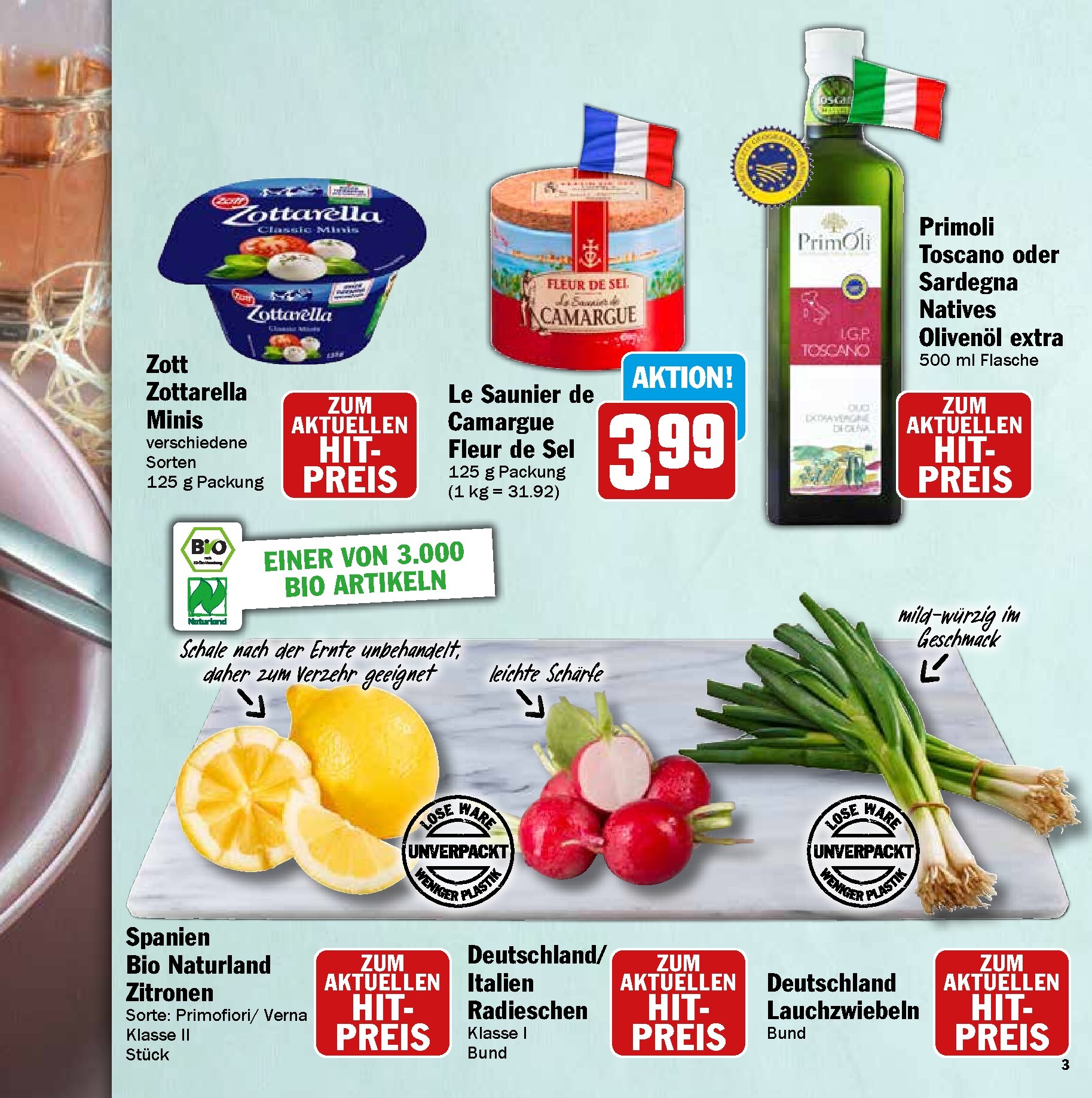 Neben dem festlichen Braten bietet HIT eine Fülle weiterer Köstlichkeiten. Verfeinern Sie Ihre Salate und Vorspeisen mit den Zottarella Minis von Zott oder dem exquisiten Le Saunier de Camargue Fleur de Sel für 3,99 € je 125-g-Packung. Für die mediterrane Note sorgt das Primoli Toscano oder Sardegna Olivenöl extra. Auch die Frischeabteilung überzeugt mit Bio-Artikeln wie spanischen Zitronen und deutschen Radieschen oder Lauchzwiebeln. Diese Zutaten sind die ideale Basis für leichte und frühlingshafte Gerichte, wie den im Prospekt vorgestellten Mozzarella-Salat mit Erbsen und Radieschen, der Frische und Geschmack auf den Teller bringt.