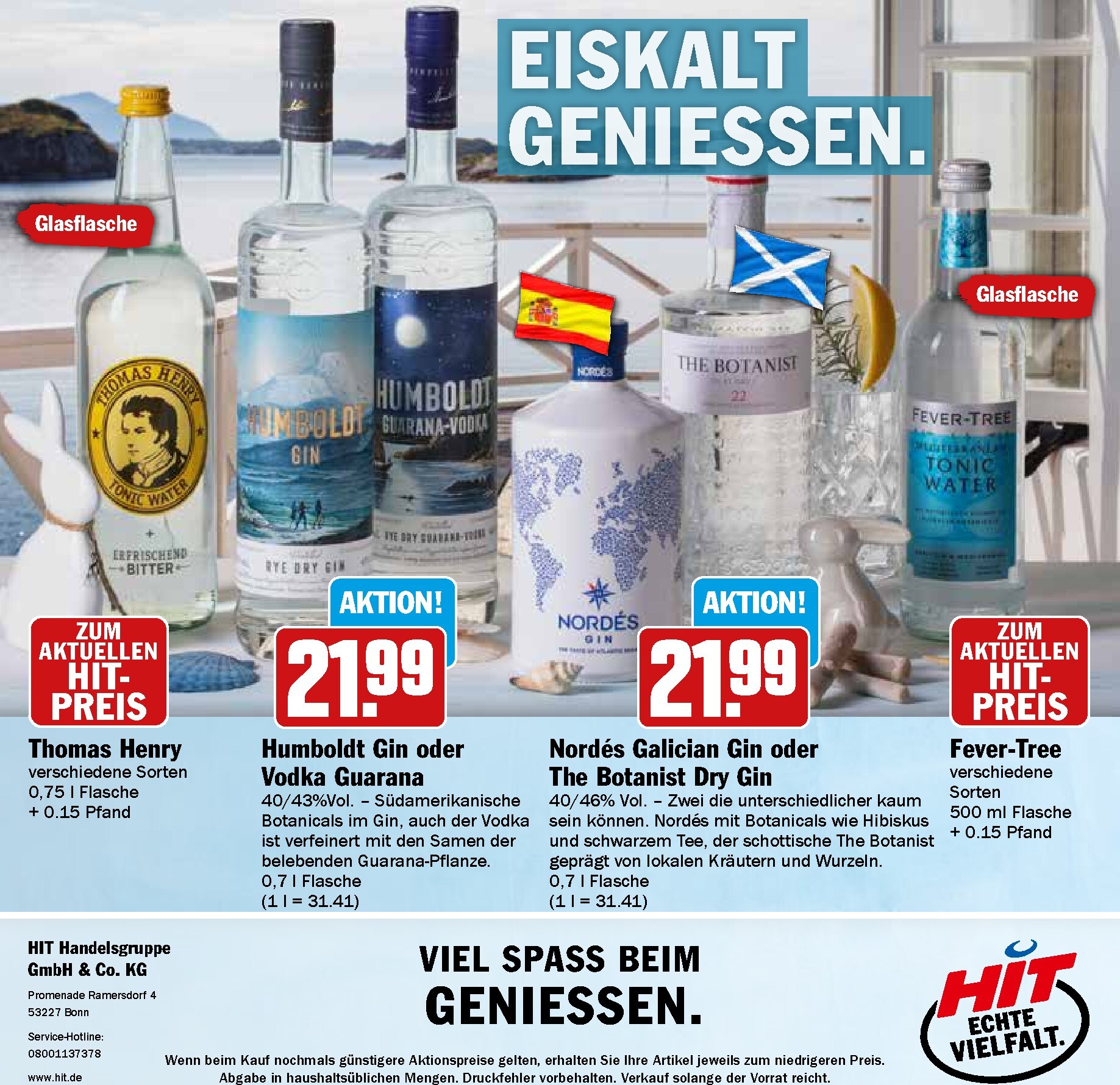 Für alle, die es etwas hochprozentiger mögen, hält die „EISKALT GENIESSEN“-Aktion besondere Highlights bereit. Entdecken Sie Premium-Spirituosen wie den Nordés Galician Gin oder The Botanist Dry Gin, die beide für den Aktionspreis von 21,99 € pro 0,7-l-Flasche angeboten werden. Auch der Humboldt Gin oder Vodka Guarana ist zum selben Preis erhältlich. Die passenden Mixer dürfen natürlich nicht fehlen: Thomas Henry Tonic Water und verschiedene Sorten von Fever-Tree runden das Angebot ab und sind die ideale Basis für erfrischende Longdrinks und Cocktails. Alle aktuellen Angebote und noch viel mehr finden Sie im neuesten Hit Prospekt.