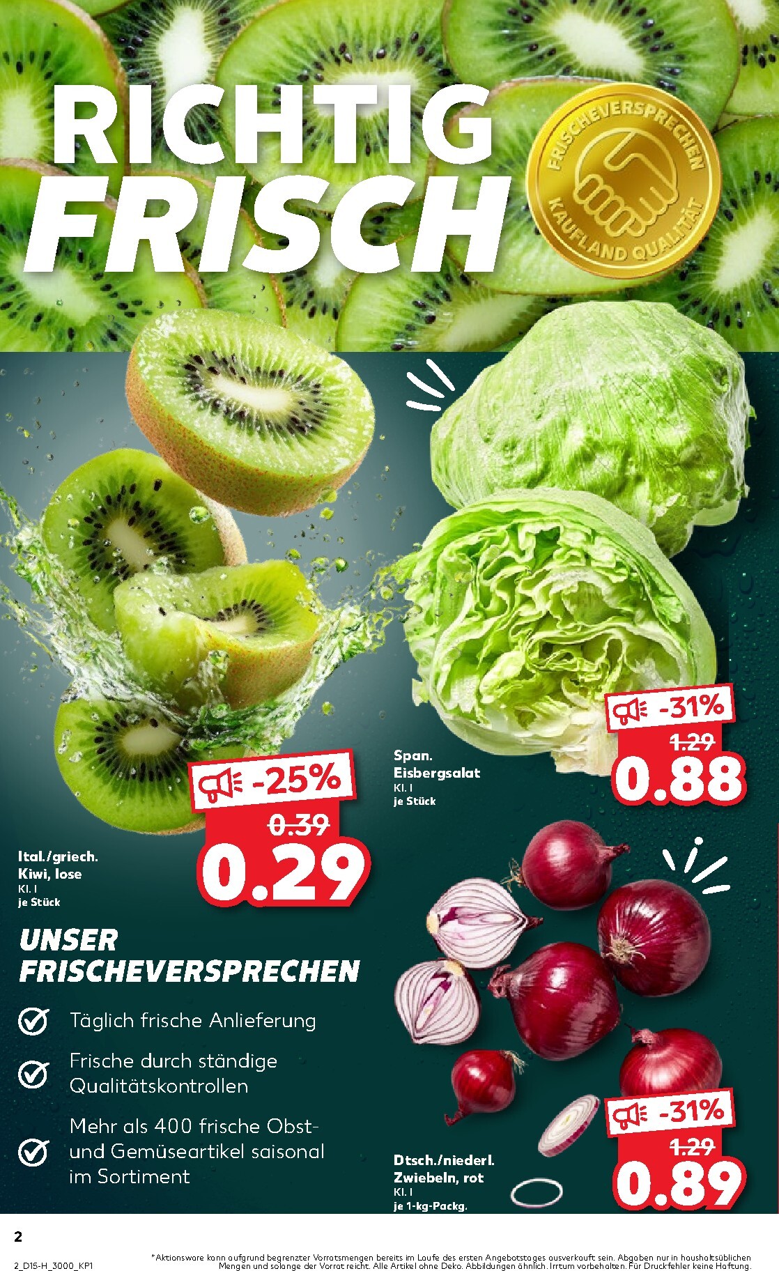 Die Frischeabteilung bei Kaufland überzeugt ebenfalls mit attraktiven Preisen. Ideal für einen gesunden Start in den Tag oder als vitaminreicher Snack zwischendurch sind die Kiwis aus Italien oder Griechenland für nur 0,29 Euro pro Stück. Die aktuellen Kaufland Prospekt 09.04.2026 – 15.04.2026 Werbung beinhalten auch knackigen Eisbergsalat für 0,88 Euro und rote Zwiebeln für nur 0,89 Euro pro 1-kg-Packung. An der Frischetheke wartet der würzige Andechser Natur Bio-Alpenblumen-Käse für nur 1,99 Euro pro 100 g darauf, entdeckt zu werden.
