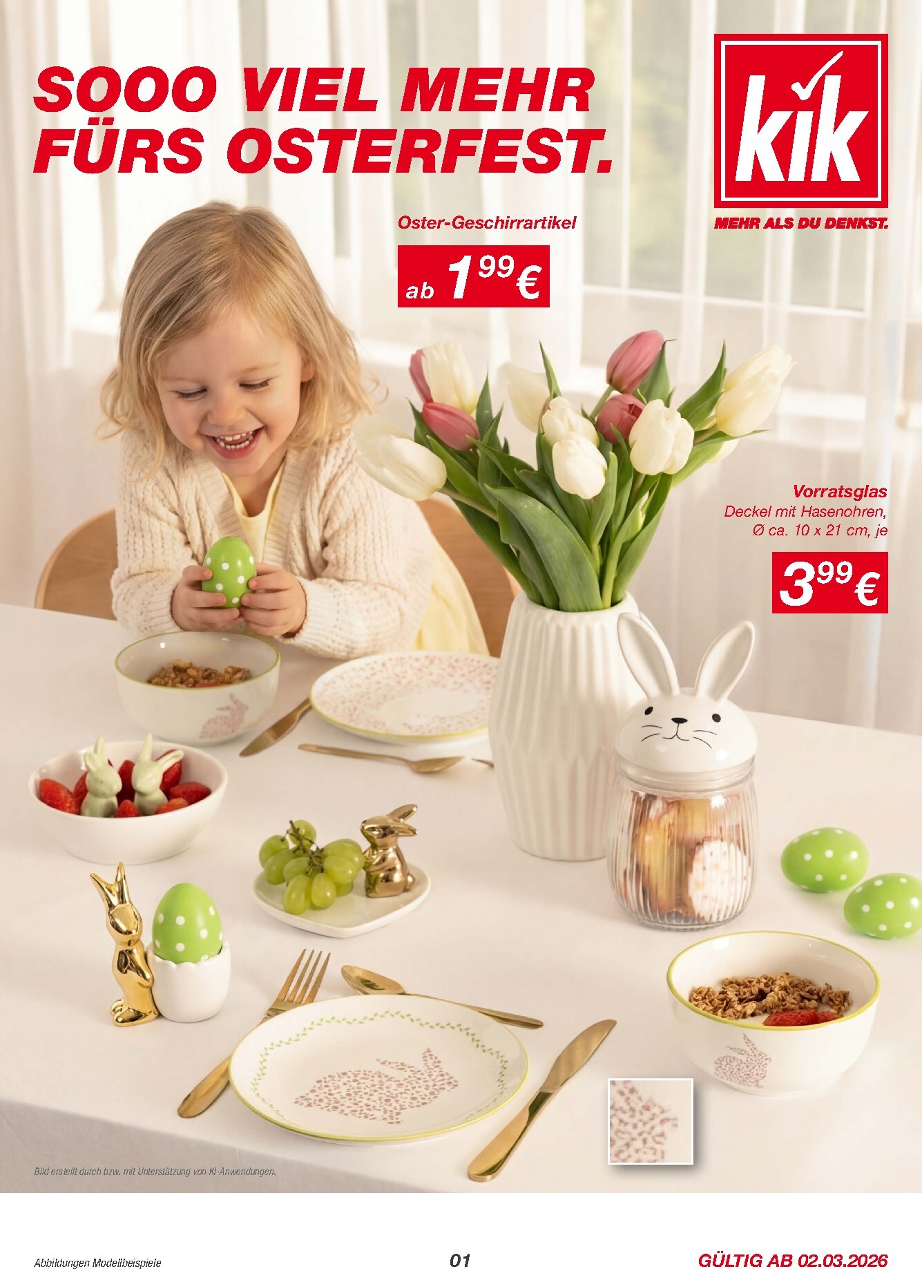 Das Osterfest rückt näher und KiK läutet die Feiertage mit einer bezaubernden Kollektion ein, die unter dem Motto „Sooo viel mehr fürs Osterfest“ steht. Wer sein Zuhause festlich schmücken möchte, findet hier alles, was das Herz begehrt. Die neuen Angebote bieten eine wunderbare Gelegenheit, die Osterzeit stilvoll und preiswert zu gestalten, denn der KiK Prospekt 02.03.2026 zum Blättern Online Online sorgt für strahlende Augen bei Groß und Klein. Von Geschirr bis hin zu Dekorationselementen ist für jeden Geschmack etwas dabei, um eine einladende Atmosphäre zu schaffen.