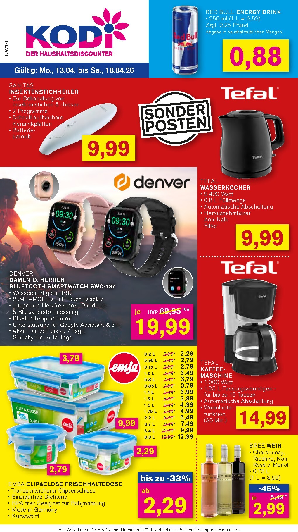 Der Haushaltsdiscounter Kodi läutet die Woche vom 13. April bis zum 18. April 2026 mit einer Fülle an unschlagbaren Angeboten ein. Wer auf der Suche nach praktischen Helfern für den Alltag oder moderner Technik zu kleinen Preisen ist, wird in diesem Prospekt fündig. Die aktuellen Kodi Prospekt 13.04.2026 – 18.04.2026 Angebote Angebote zum Blättern umfassen eine breite Palette von Produkten, die das Leben einfacher und angenehmer machen. Ein echtes Highlight für den Energiekick zwischendurch ist die 250-ml-Dose Red Bull für nur 0,88 €. Für die kommende Sommersaison ist der Sanitas Insektenstichheiler für nur 9,99 € ein unverzichtbarer Begleiter, um lästige Stiche und Bisse schnell zu behandeln.