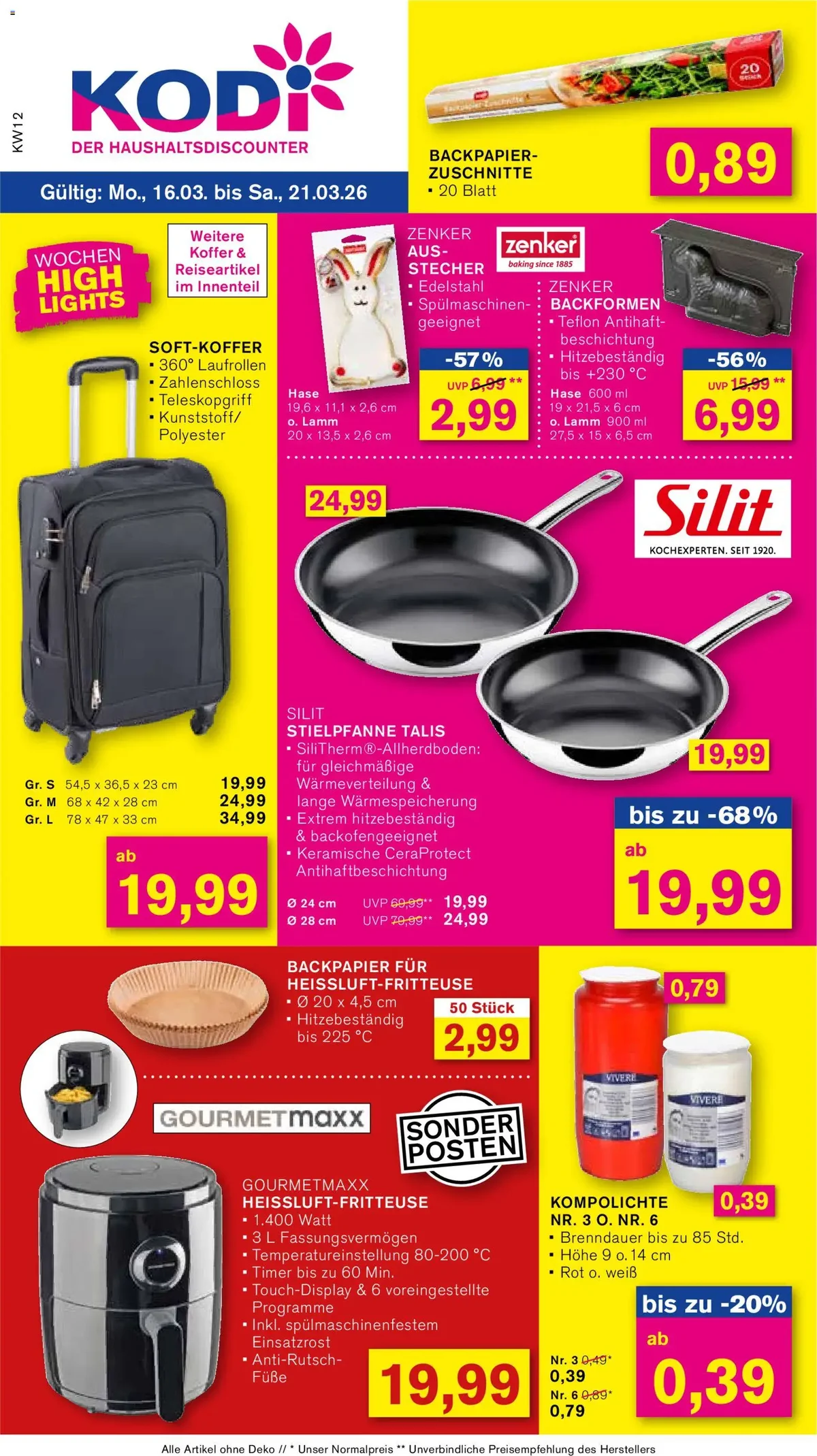 Ab Montag, dem 16.03.2026, präsentiert Kodi seine neuen "Wochen High Lights ab Montag", die eine Fülle an attraktiven Angeboten für Haushalt, Auto und Freizeit bereithalten. Wer auf der Suche nach dem aktuellen Kodi Prospekt ab 16.03.2026 ist, wird hier fündig. Besonders hervorzuheben sind die Backartikel, die perfekt auf die kommende Saison abgestimmt sind. So gibt es die charmanten ZENKER BACKFORMEN Hase o. Lamm für nur 6,99 Euro mit satten 56% Rabatt, ideal für festliche Leckereien. Dazu passen die praktischen BACKPAPIER-ZUSCHNITTE für nur 0,89 Euro. Auch für die Küche bietet Kodi ein echtes Highlight: die hochwertige Silit Stielpfanne Talis (Ø 24 cm) ist mit bis zu 68% Rabatt für unschlagbare 19,99 Euro erhältlich.