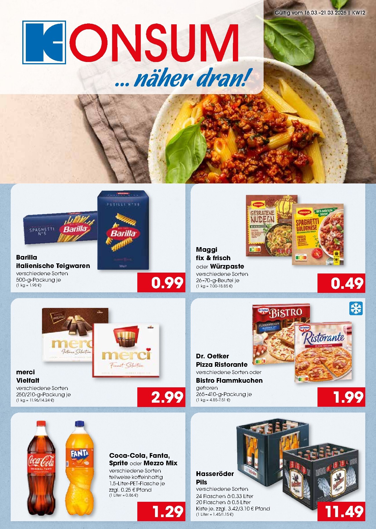 Die neue Woche bei Konsum Leipzig startet mit unwiderstehlichen Angeboten, die vom 16. bis 21. März 2026 gültig sind. Tauchen Sie ein in eine Welt voller Geschmack und sparen Sie bei Ihrem Wocheneinkauf. Ein absolutes Highlight ist die Barilla italienische Teigware in verschiedenen Sorten. Die 500-g-Packung erhalten Sie für nur 0,99 €. Das ist die perfekte Grundlage für Ihre Lieblingspasta-Gerichte, von klassischer Bolognese bis hin zu kreativen Eigenkreationen. Entdecken Sie die besten Konsum Leipzig Prospekt 16.03.2026 – 21.03.2026 Angebote nächste Woche und bringen Sie italienisches Flair direkt auf Ihren Teller.