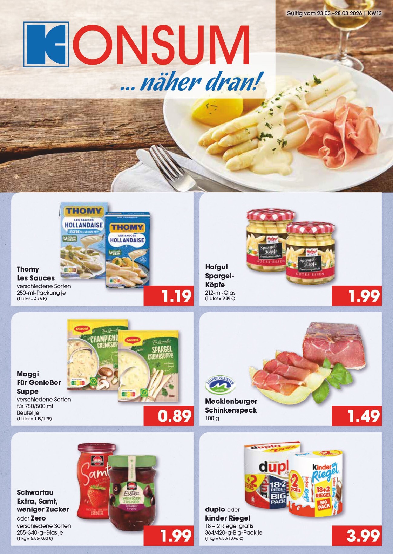 Der Frühling hält Einzug bei Konsum Leipzig und bringt vom 23. bis zum 28. März 2026 eine Fülle an verlockenden Angeboten mit sich. Pünktlich zum Start der Spargelsaison finden Sie alles, was das Herz begehrt, um das königliche Gemüse in vollen Zügen zu genießen. Die aktuellen Konsum Leipzig Prospekt 23.03.2026 – 28.03.2026 zum Blättern Online Online machen den Einkauf zu einem wahren Vergnügen und füllen Ihren Korb mit hochwertigen Produkten zu unschlagbaren Preisen. Ein absolutes Muss für jedes Spargelgericht ist die passende Sauce. Sichern Sie sich Thomy Les Sauces in verschiedenen Sorten, wie die klassische Hollandaise, für nur 1,19 € pro 250-ml-Packung. Damit gelingt Ihnen im Handumdrehen eine cremige und geschmackvolle Ergänzung zu Ihrem frischen Spargel, die wie hausgemacht schmeckt und die ganze Familie begeistern wird. Starten Sie genussvoll in die neue Saison!