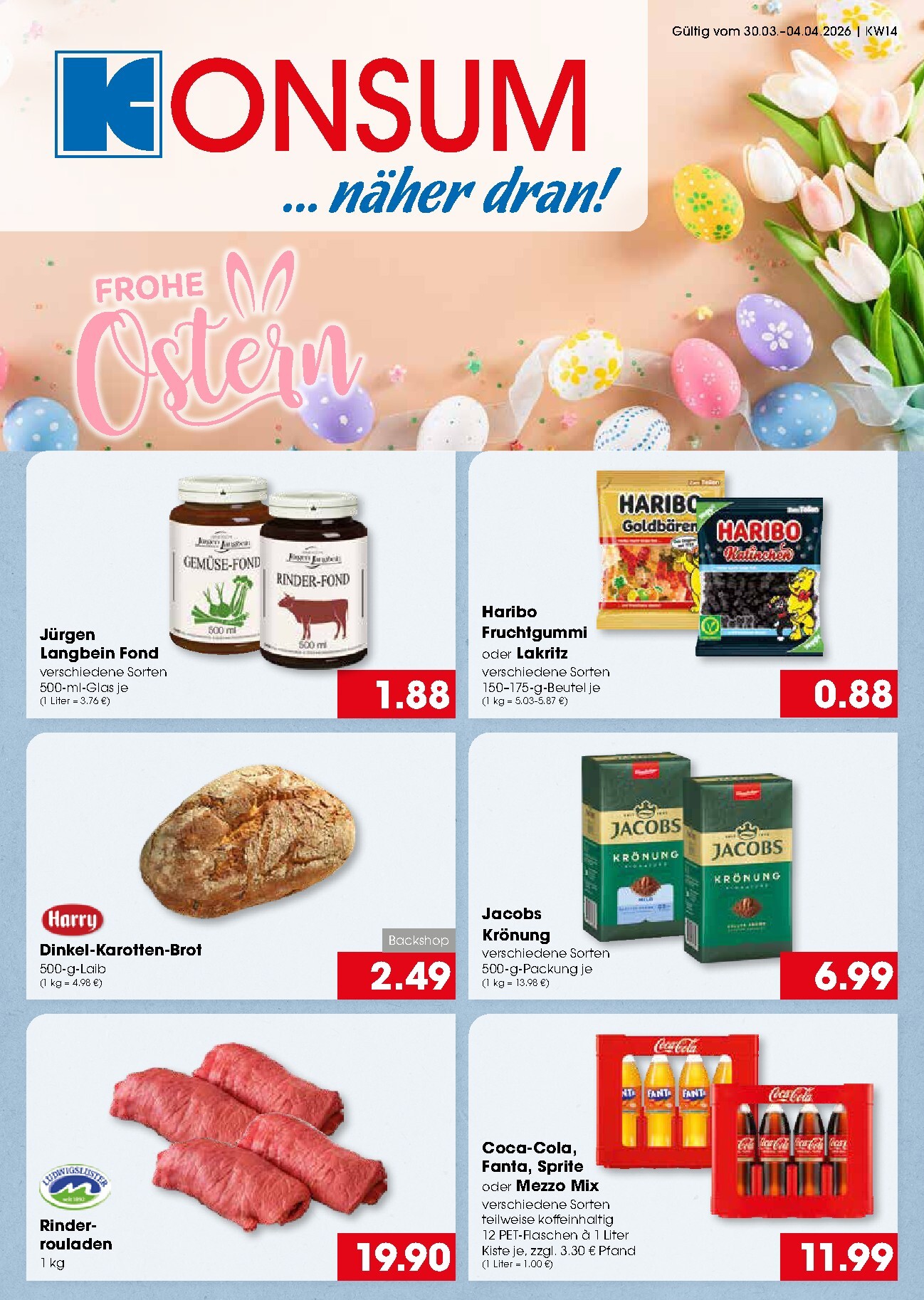 Die Osterwoche bei Konsum läutet die Festtage mit fantastischen Angeboten ein, gültig vom 30. März bis zum 4. April 2026. Ob für den Osterbrunch oder das festliche Abendessen, die Regale sind gefüllt mit verlockenden Produkten zu unschlagbaren Preisen. Für alle, die nach den besten Deals suchen, ist der aktuelle Konsum Leipzig Prospekt 30.03.2026 – 04.04.2026 Angebote Angebote zum Blättern eine wahre Fundgrube. Süßes von Haribo für nur 0,88 € pro Beutel oder Jacobs Krönung Kaffee für 6,99 € sorgen für Genussmomente. Auch Getränke wie Coca-Cola, Fanta oder Sprite im Mega-Mix Kasten sind für nur 11,99 € erhältlich, perfekt für die Feiertagsrunde.