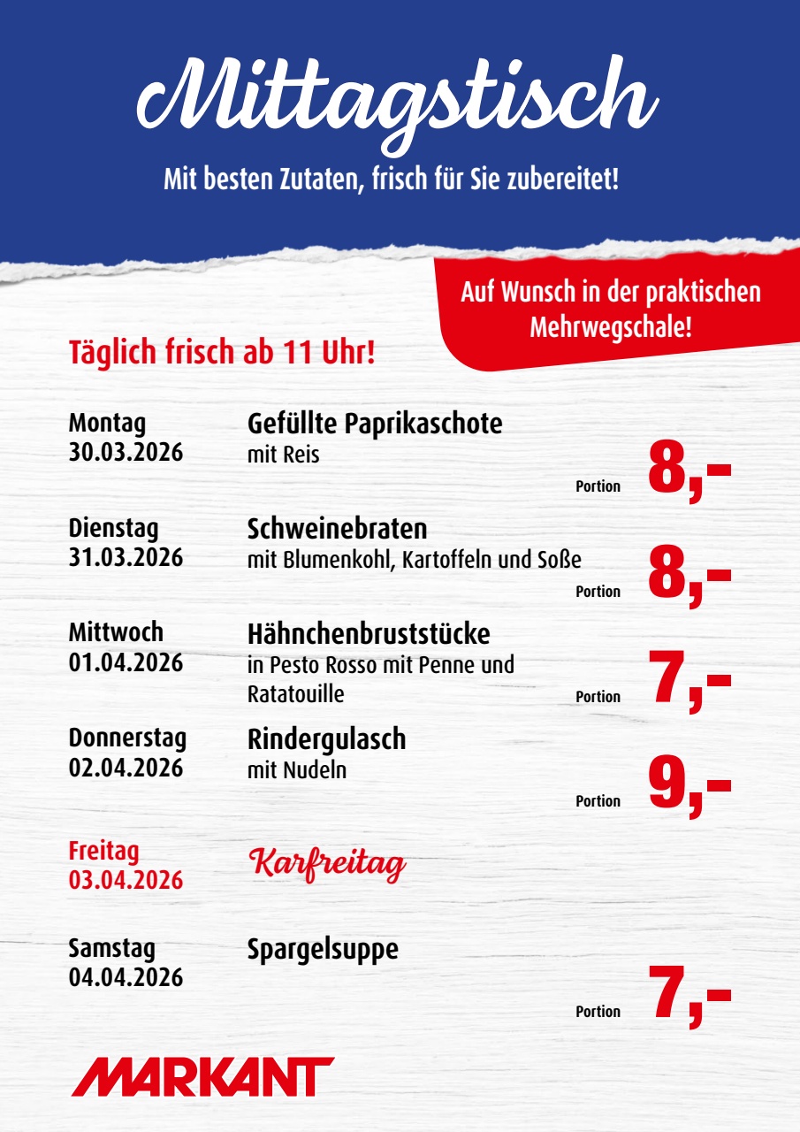 Beginnen Sie Ihre Woche vom 30. März bis zum 4. April 2026 mit den köstlichen und frisch zubereiteten Gerichten des Markant Mittagstischs. Täglich ab 11 Uhr erwartet Sie eine neue, schmackhafte Mahlzeit, die mit besten Zutaten für Sie gekocht wird. Dieses Angebot ist die perfekte Lösung für eine schnelle, aber hochwertige Mittagspause. Wenn Sie nach Abwechslung und Genuss suchen, bietet der Markant Prospekt 30.03.2026 – 04.04.2026 Aktuelle Angebote genau das Richtige für jeden Geschmack. Alle Gerichte werden auf Wunsch auch in einer praktischen Mehrwegschale serviert, was nicht nur umweltfreundlich, sondern auch ideal für unterwegs ist.