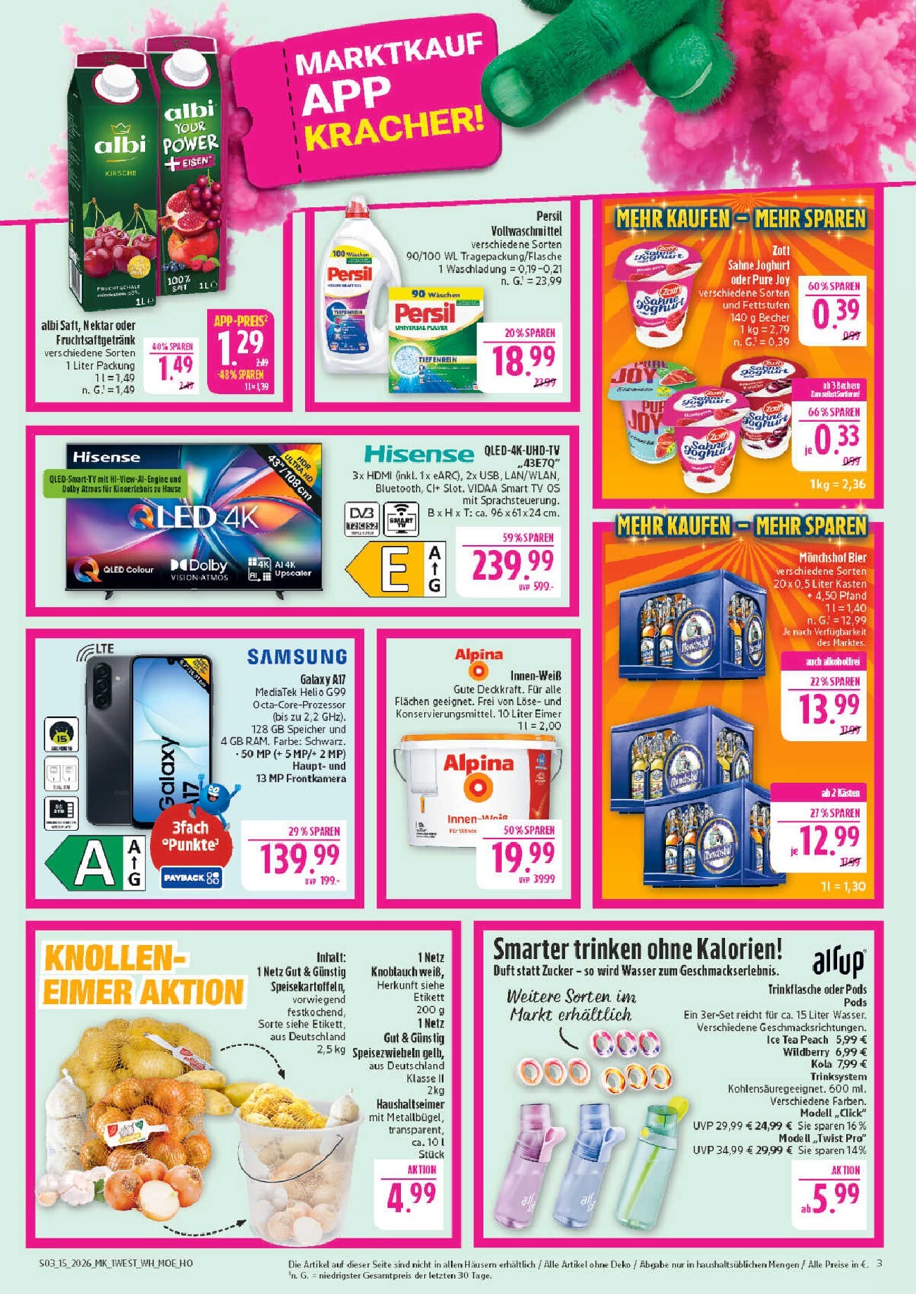 Auch die Getränkeabteilung hält einige Highlights bereit. Eine Kiste Mönchshof Bier in verschiedenen Sorten gibt es bereits ab 12,99 €. Wer es lieber alkoholfrei mag, kann sich über Albi Saft für nur 1,29 € pro Liter mit der App freuen. Ein praktisches Angebot für die Küche ist die „Knollen-Eimer Aktion“: 2,5 kg Speisekartoffeln, 2 kg Speisezwiebeln und ein Netz Knoblauch im praktischen Eimer für nur 4,99 €. Um keine dieser fantastischen Offerten zu verpassen, sollten Sie regelmäßig den aktuellen Marktkauf Prospekt durchstöbern.