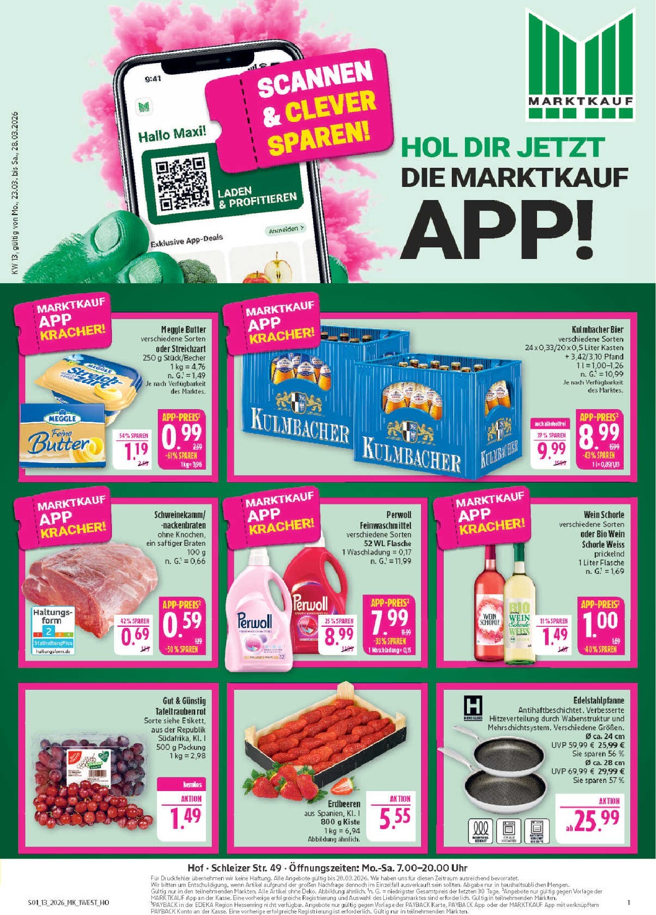 Der neue Marktkauf-Prospekt für Hof ist da und verspricht vom 23. bis zum 28. März 2026 sensationelle Sparmöglichkeiten, besonders für Nutzer der Marktkauf App. Unter dem Motto ‚Scannen & Clever Sparen‘ warten exklusive ‚App-Kracher‘ auf Sie. Ein Highlight ist die Meggle Butter oder Streichzart in verschiedenen Sorten, die mit der App für unschlagbare 0,99 € pro 250g-Packung erhältlich ist – eine Ersparnis von bis zu 61 %! Mit dem Marktkauf Prospekt 23.03.2026 – 28.03.2026 zum Blättern Online Online sichern Sie sich die besten Preise für Ihren Wocheneinkauf.