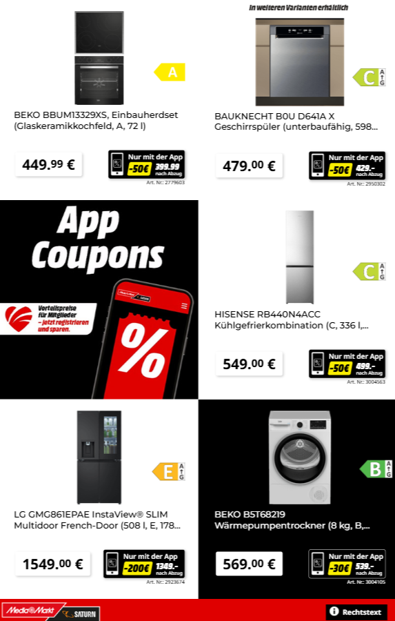 Besonders attraktiv sind die Angebote im Bereich Haushalt und Unterhaltung. Kaffeeliebhaber können sich den JURA E8 (ED) Kaffeevollautomaten für nur 999 € statt 1149 € sichern, indem sie den 150-€-App-Coupon nutzen. Ein weiteres Highlight ist der LG OLED65B59LA OLED TV mit 65 Zoll, der nach Abzug des 50-€-Coupons für beeindruckende 999 € erhältlich ist. Auch für den Haushalt gibt es Top-Deals, wie die LG Waschmaschine Serie 7, die mit dem App-Vorteil von 50 € nur noch 499 € kostet. Diese Angebote zeigen, wie einfach es ist, bei hochwertigen Markengeräten bares Geld zu sparen.