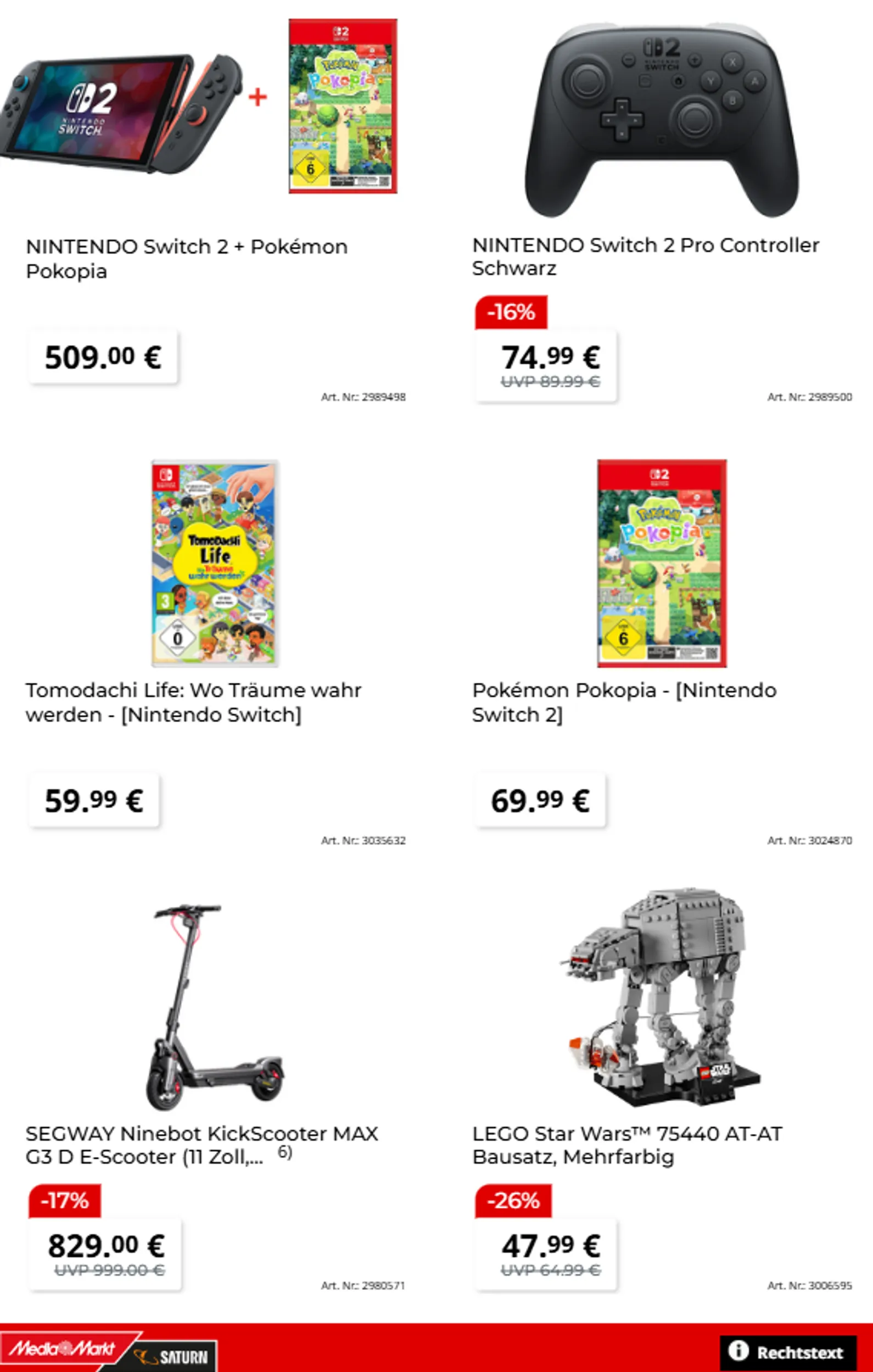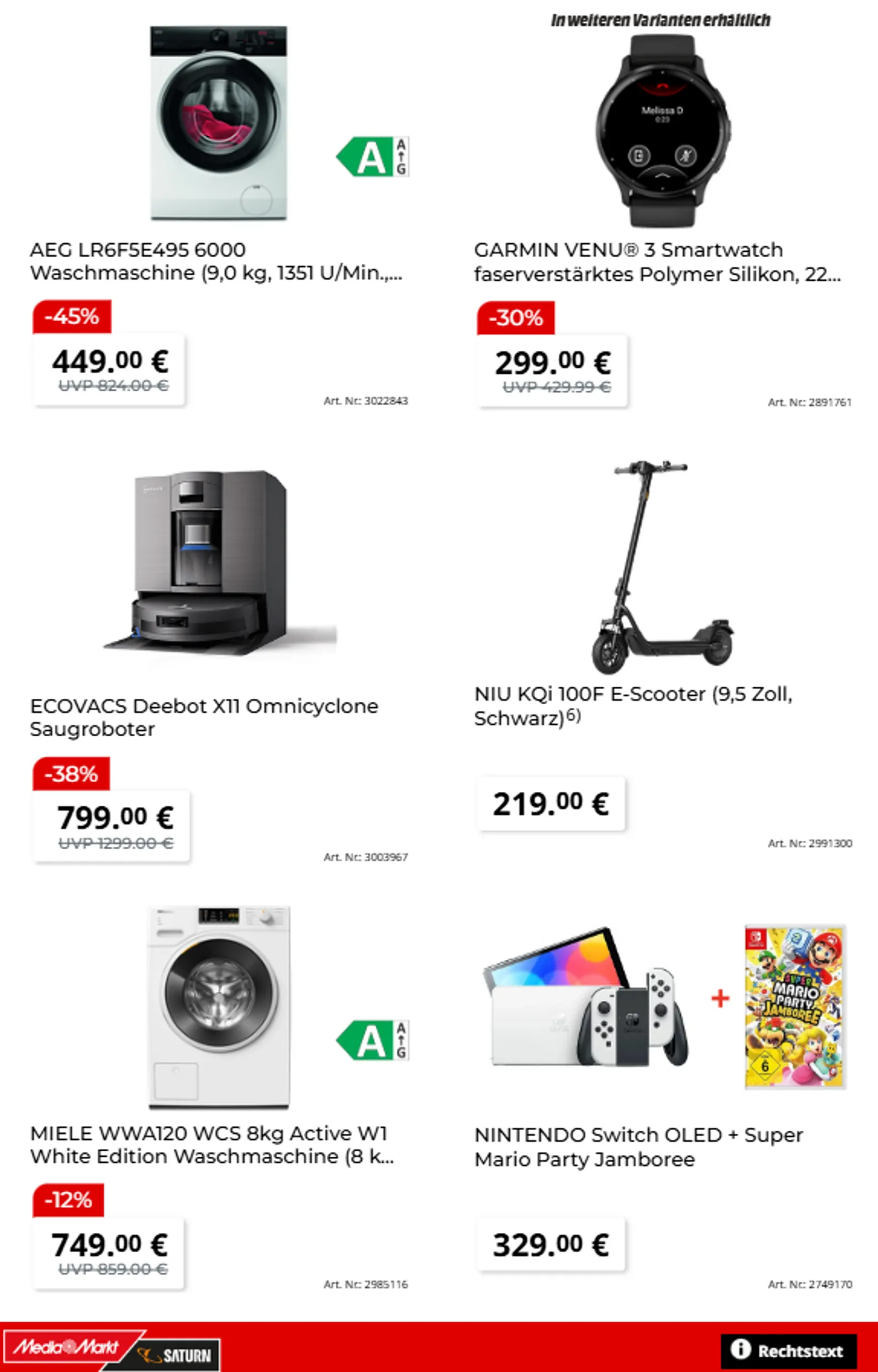 Die Aktionen erstrecken sich auch auf praktische Helfer für den Alltag. So ist die AEG LR6F5E495 6000 Waschmaschine mit 9 kg Fassungsvermögen für nur 449,00 € zu haben. Gaming-Freunde kommen mit dem NINTENDO Switch OLED Bundle inklusive Super Mario Party Jamboree für 329,00 € auf ihre Kosten. Verpassen Sie nicht die Chance, die besten Deals für die nächste Zeit zu sichern. Entdecken Sie alle Details im aktuellen MediaMarkt Prospekt ab 20.04.2026 und finden Sie weitere Schnäppchen im MediaMarkt Prospekt online.