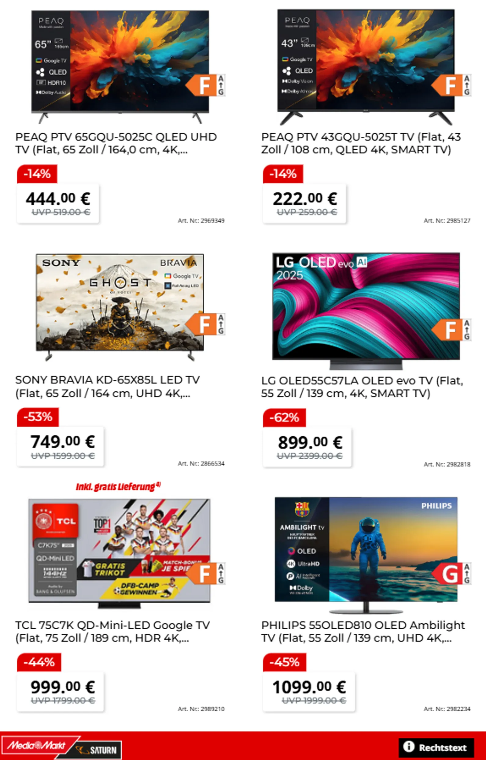 Im Mittelpunkt stehen beeindruckende TV-Deals. Sichern Sie sich den SAMSUNG OLED GQ65S90F 4K TV in 65 Zoll für nur 1.333,00 € statt 3.199,00 € und sparen Sie ganze 58 %. Wer Ambilight liebt, wird beim PHILIPS 43PUS8550/12 LED TV für 369,00 € fündig. Für das ganz große Kinoerlebnis sorgt der TCL 75C7K QD-Mini-LED TV mit 75 Zoll für nur 999,00 €. Diese Vielfalt garantiert, dass Sie jedes Spiel in bester Qualität genießen können, von HD-ready bis hin zu brillantem 4K UHD.
