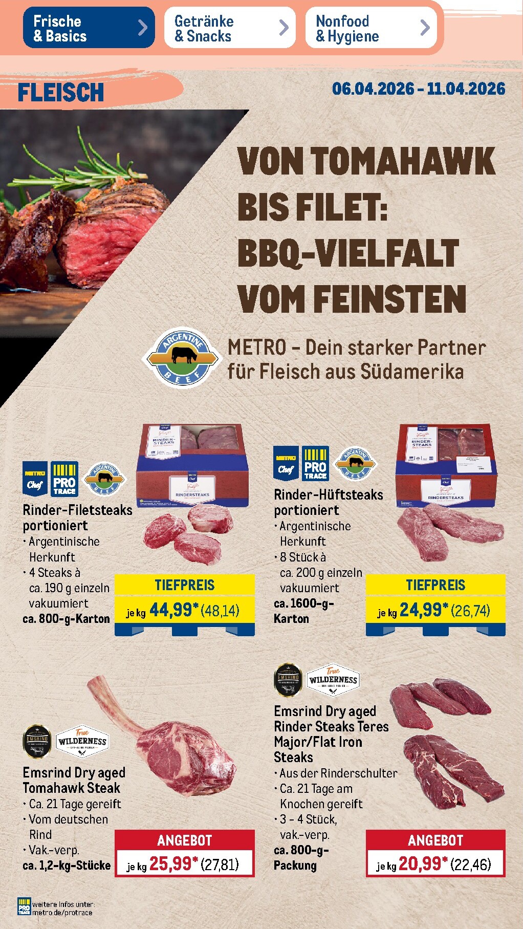 Neben den Basics legt Metro einen besonderen Schwerpunkt auf eine exzellente Fleischauswahl, die perfekt auf die beginnende Grillsaison abgestimmt ist. Im Rahmen der Metro Prospekt 06.04.2026 – 11.04.2026 Online Prospekt finden Sie eine beeindruckende BBQ-Vielfalt, die von argentinischen Rinder-Filetsteaks bis hin zu zarten Rinder-Hüftsteaks reicht. Diese sind bereits portioniert und einzeln vakuumiert, was eine einfache Handhabung und optimale Frische garantiert. Ein besonderes Highlight für Kenner ist das Emsrind Dry aged Tomahawk Steak, das 21 Tage gereift ist und ein unvergessliches Geschmackserlebnis verspricht.