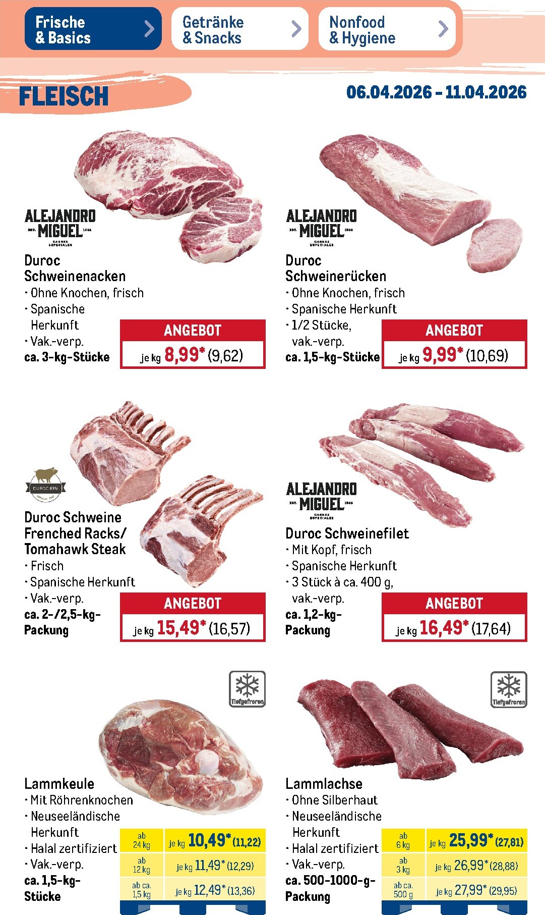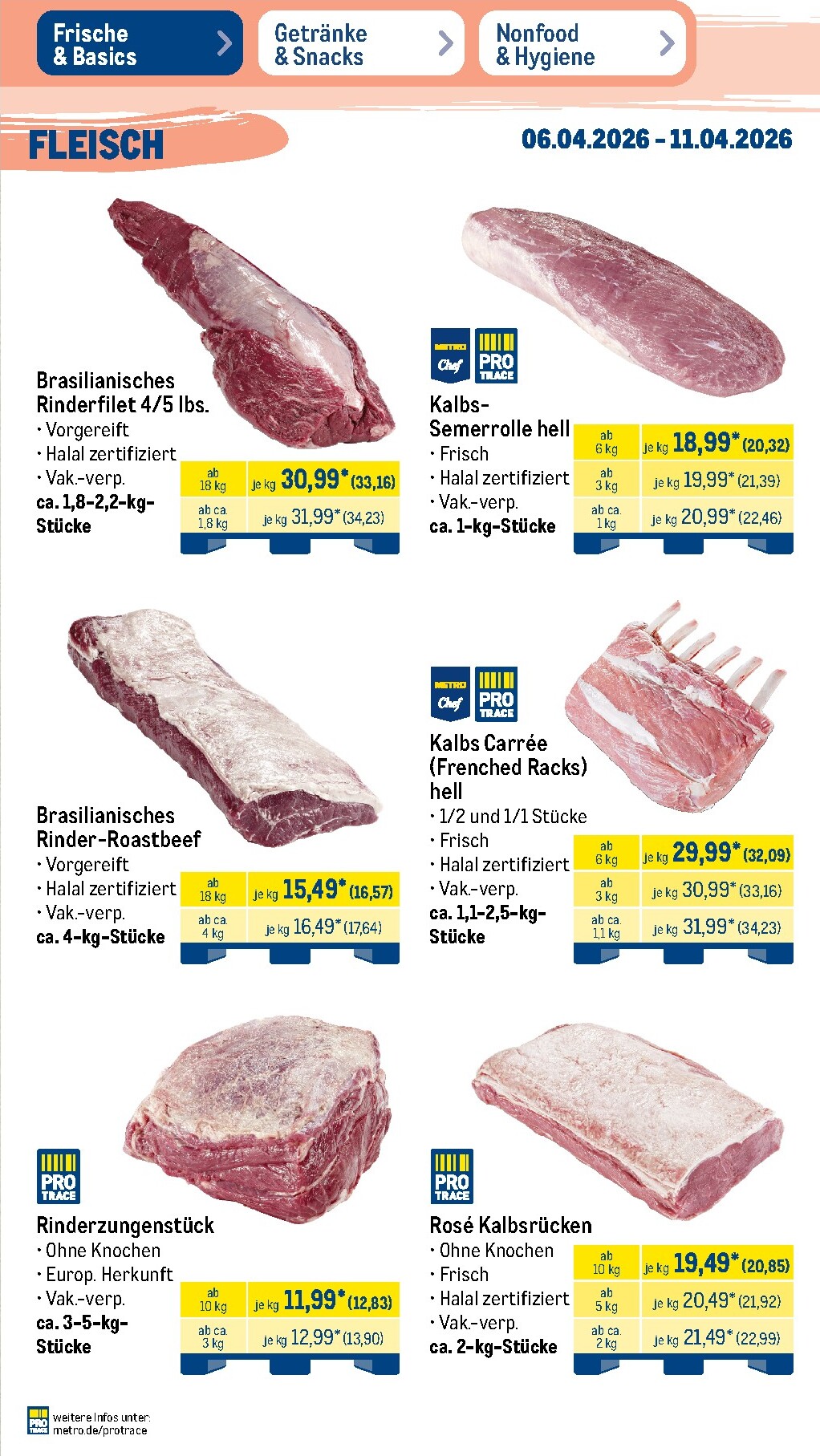 Das Sortiment wird durch weitere Spezialitäten wie brasilianisches Rinderfilet, zarte Kalbs-Semerrolle oder ein edles Kalbs Carrée (Frenched Racks) ergänzt. Viele dieser Produkte sind Halal-zertifiziert und vakuumverpackt, um höchste Qualitätsstandards zu erfüllen. Diese exklusiven Fleischsorten bieten die perfekte Grundlage für kreative und anspruchsvolle Gerichte. Alle Details und weitere unschlagbare Angebote für Ihr Geschäft finden Sie im aktuellen Metro Prospekt.