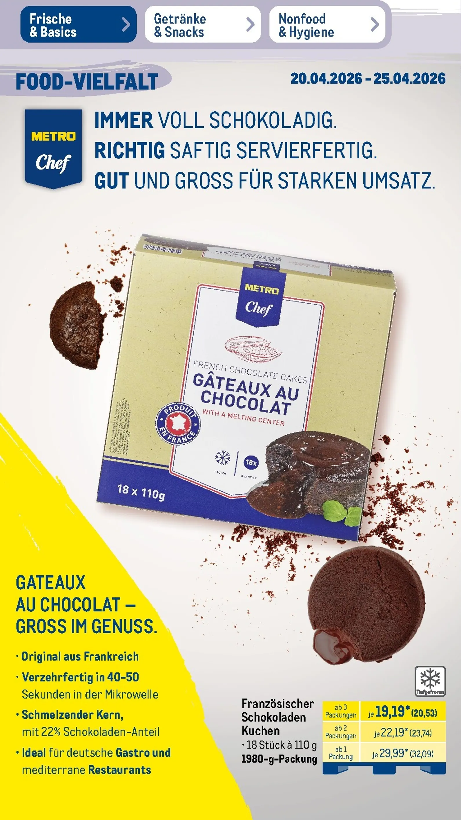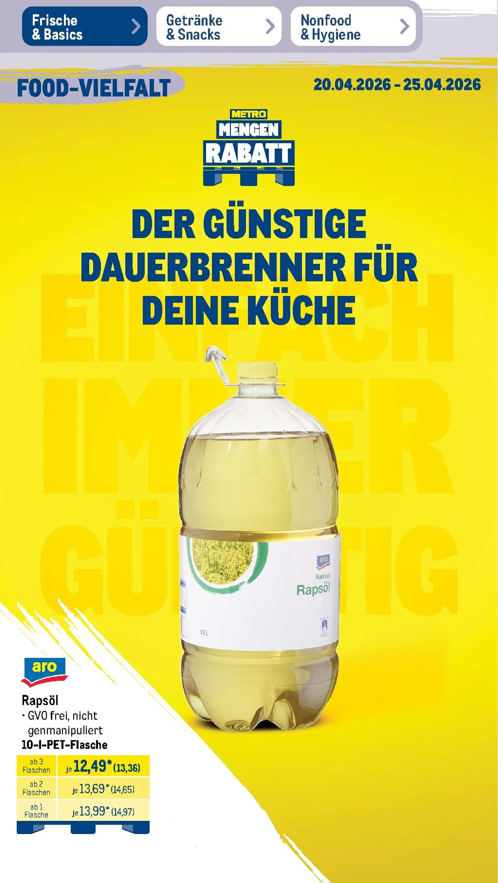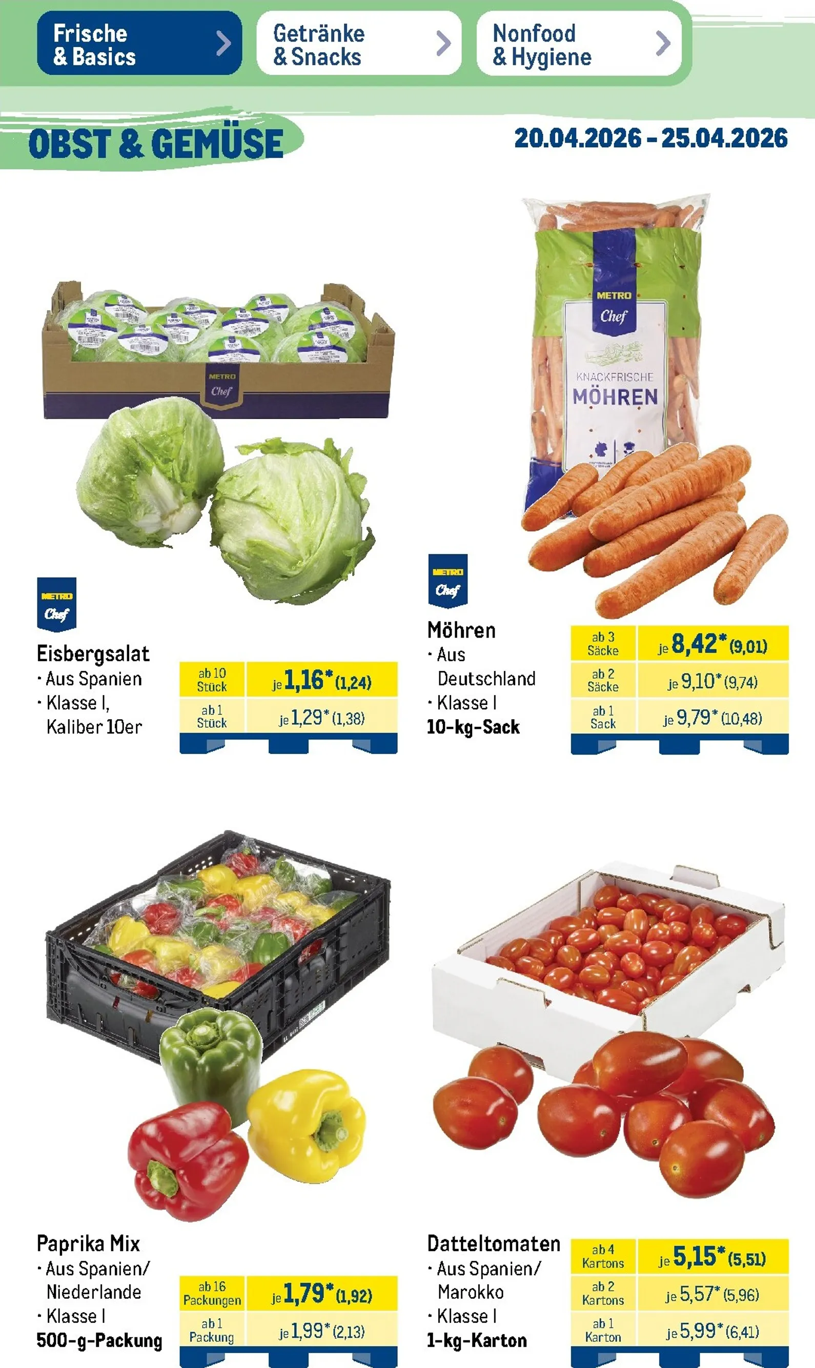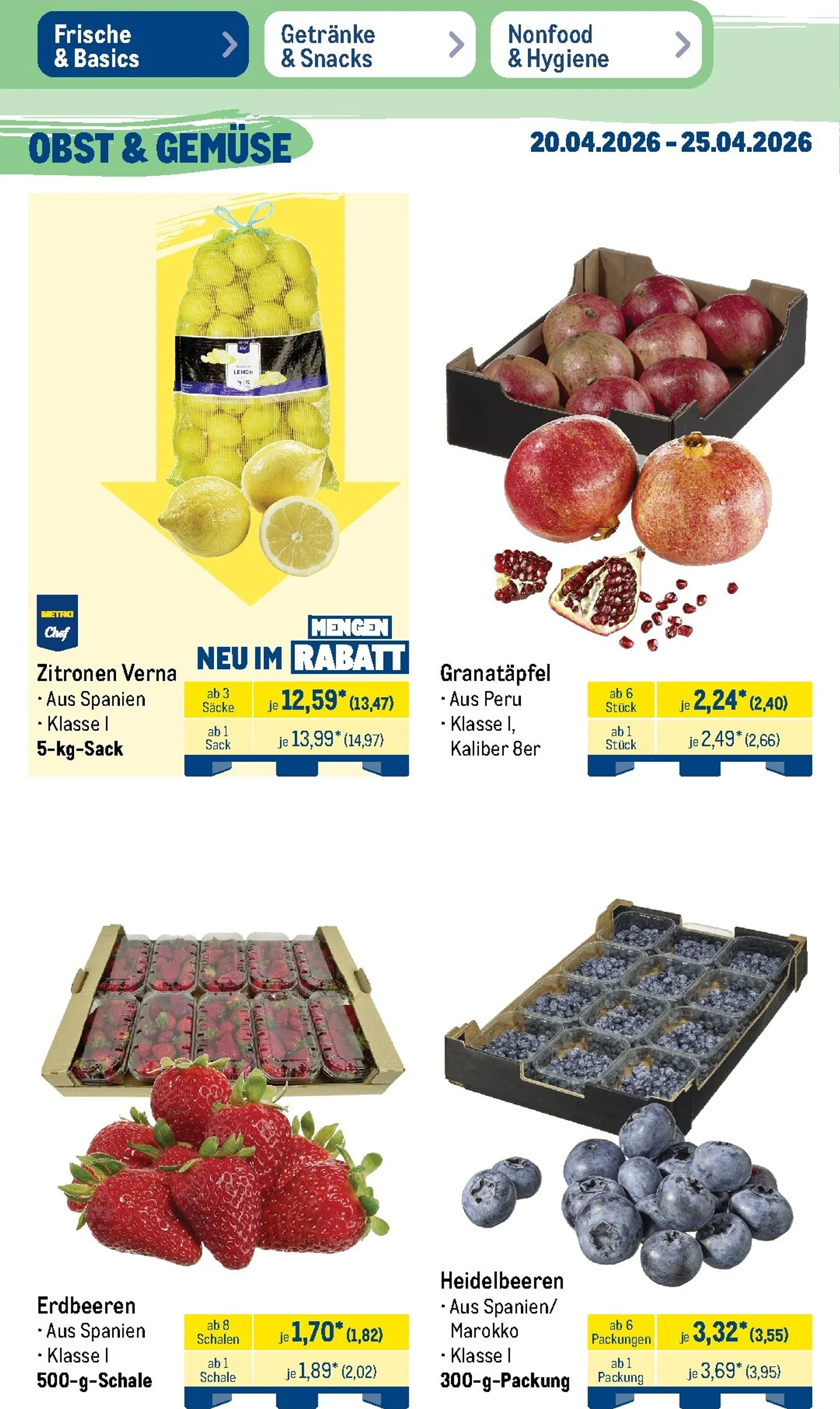 Vom 20. bis 25. April 2026 startet Metro mit dem Motto „Frische & Basics“ in die neue Saison. Diese Angebote sind perfekt für Gastronomen, die ihre Terrassen für den Frühling vorbereiten. Die Auswahl in dieser Woche ist ideal, um die Speisekarte mit saisonalen Highlights zu füllen. Nutzen Sie den aktuellen Metro Prospekt ab 20.04.2026 für Ihren Einkauf und profitieren Sie von erstklassiger Qualität zu professionellen Preisen.