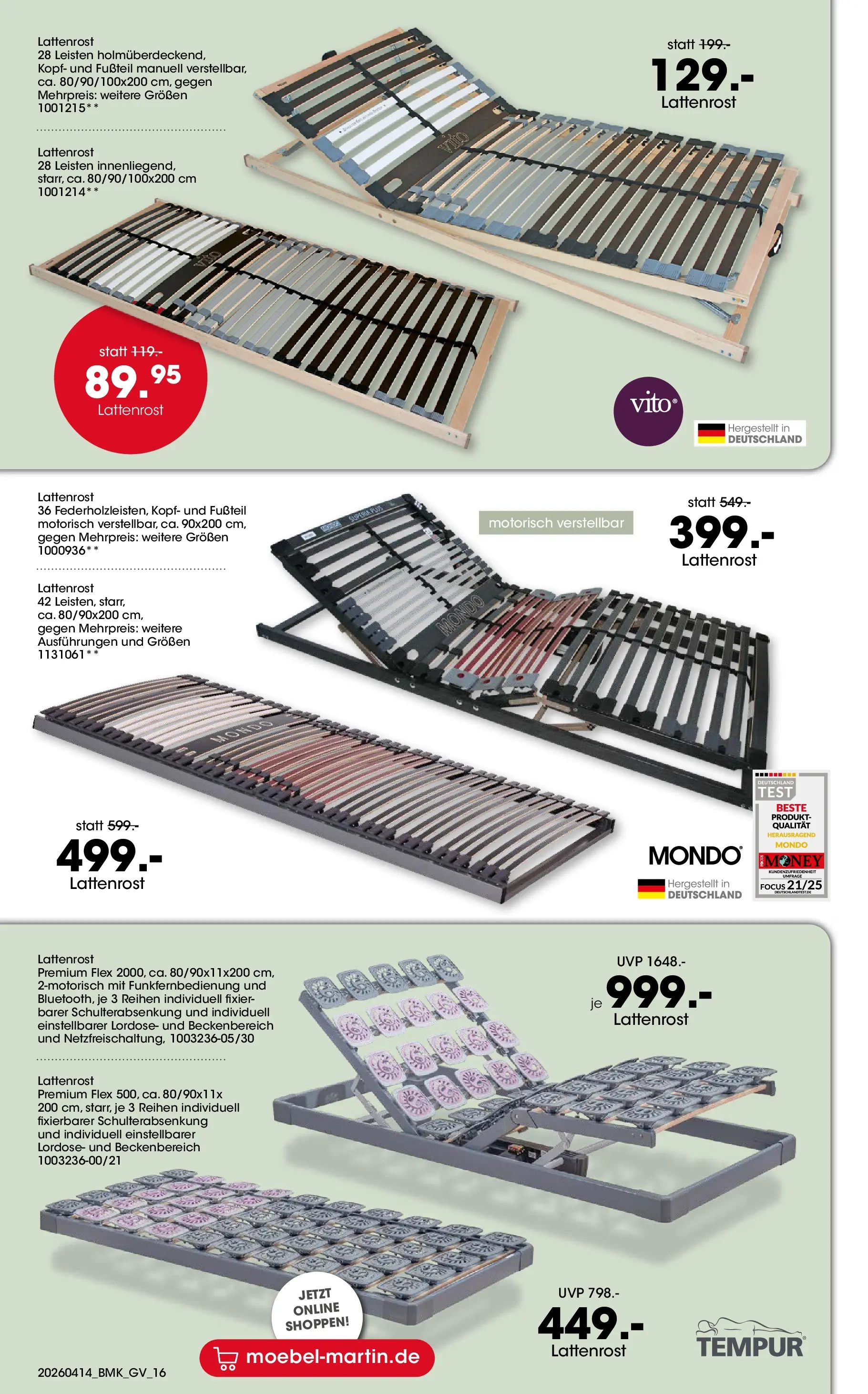 Der Frühling bringt frischen Wind in Ihr Zuhause mit den April-Highlights von Möbel Martin, gültig vom 14. bis 30. April 2026. Entdecken Sie fantastische Angebote und profitieren Sie von einer besonderen Aktion: Möbel Martin schenkt Ihnen 19% Mehrwertsteuer beim Kauf frei geplanter Möbel. Dies ist die perfekte Gelegenheit, um Wohnträume zu verwirklichen. Viele spannende Möbel Martin Prospekt ab 14.04.2026 warten darauf, von Ihnen entdeckt zu werden und Ihrem Heim Glanz zu verleihen. Die Vielfalt der Aktionen macht das Einkaufen diese Woche zum Erlebnis.